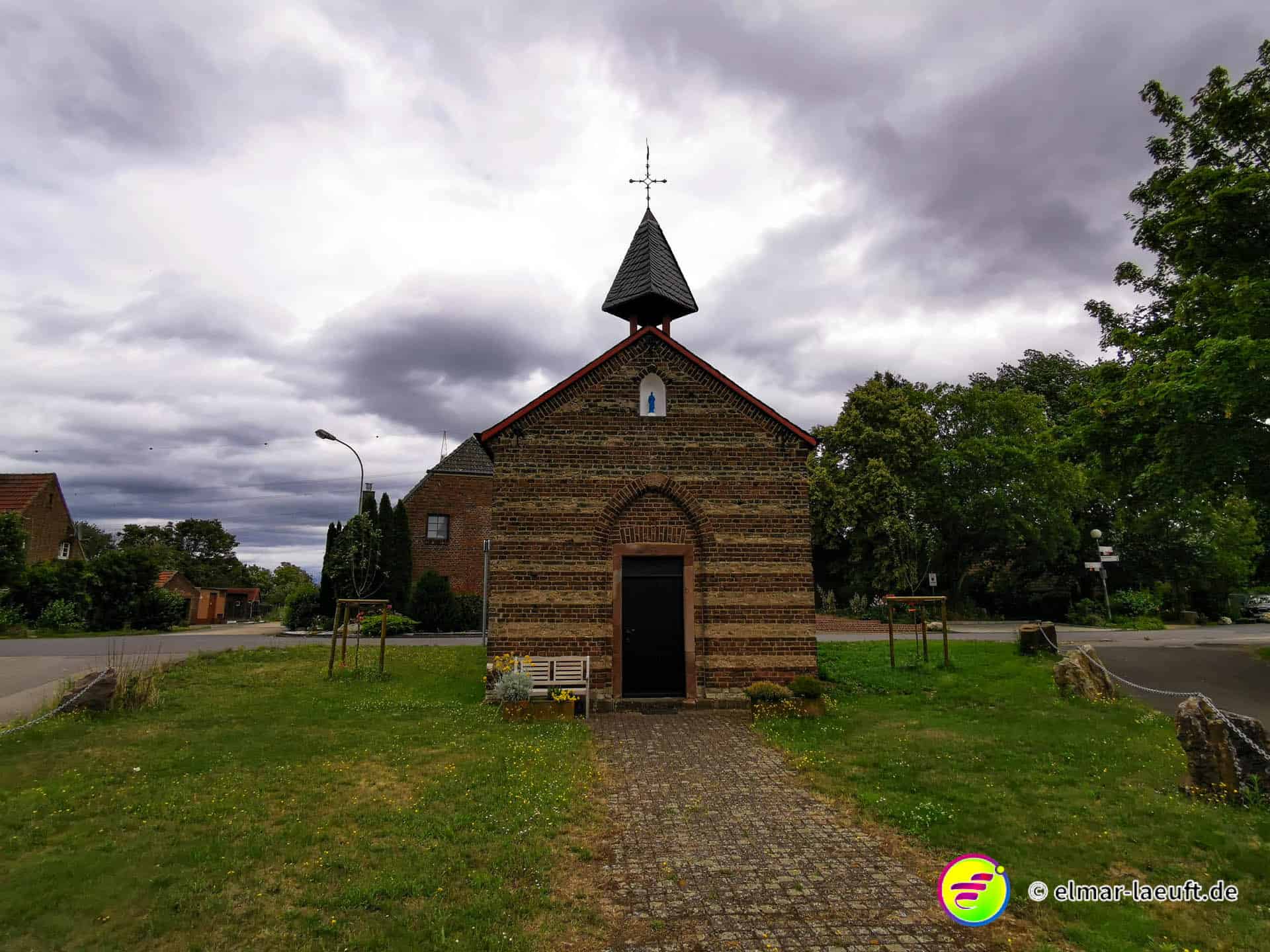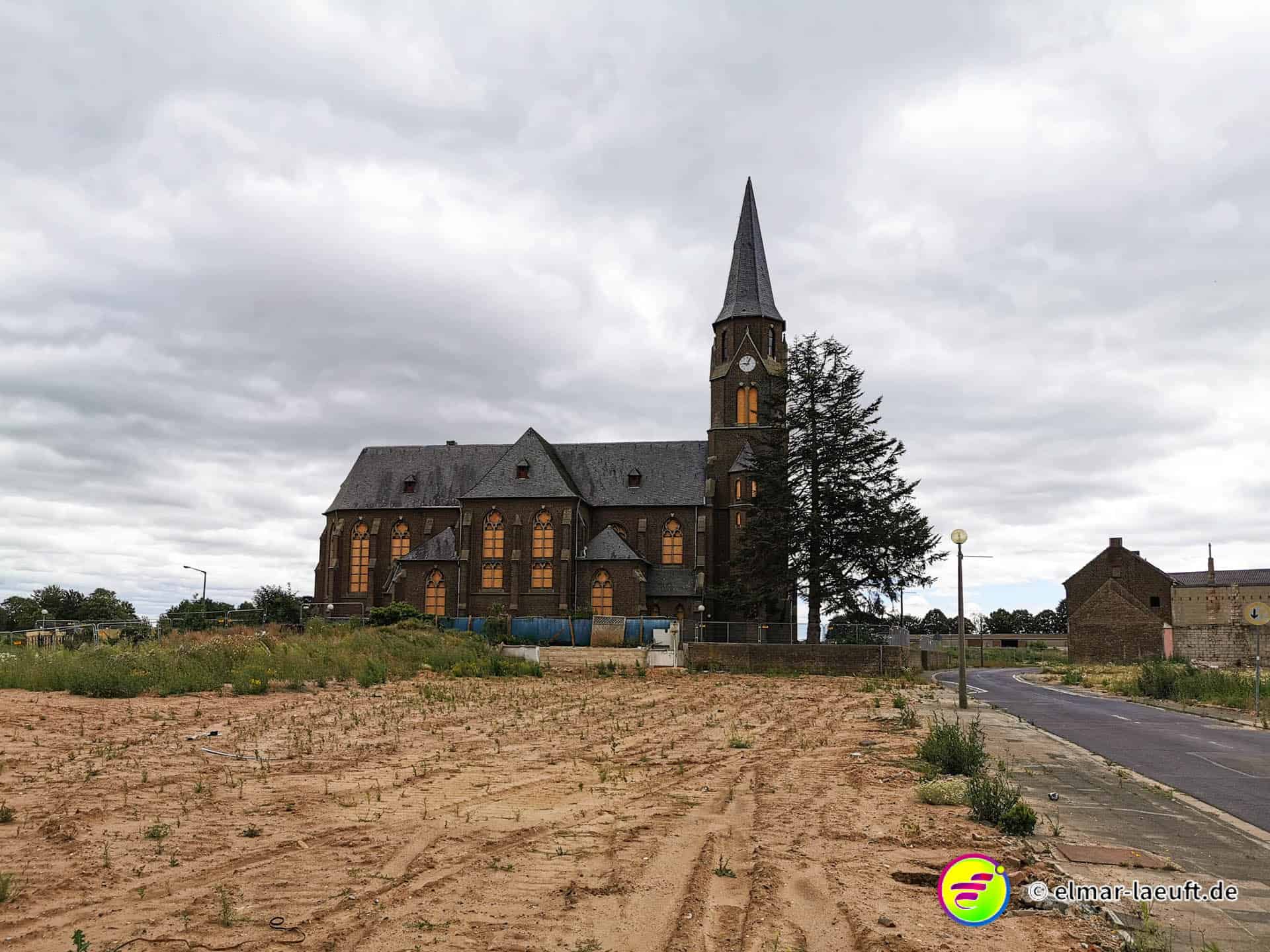 Das ehemalige Ende der Autobahn 4, Braunkohle … da war doch was? Ach ja, jetzt fällt es mir wieder ein: Hambacher Forst, Rodung, Besetzung, Polizei. Gerade eben war es noch in den Nachrichten. Und schon bin ich auf einer “Dienststraße”. Keine Sperrung, aber Benutzung auf eigene Gefahr. Die Kirche sieht seltsam aus. Als ich näher heran laufe sehe ich es. Sie hat keine Fenster mehr. Und kein Kreuz auf der Spitze. Die Uhr ist stehen geblieben. Die Fenster sind mit Holztafeln vernagelt.