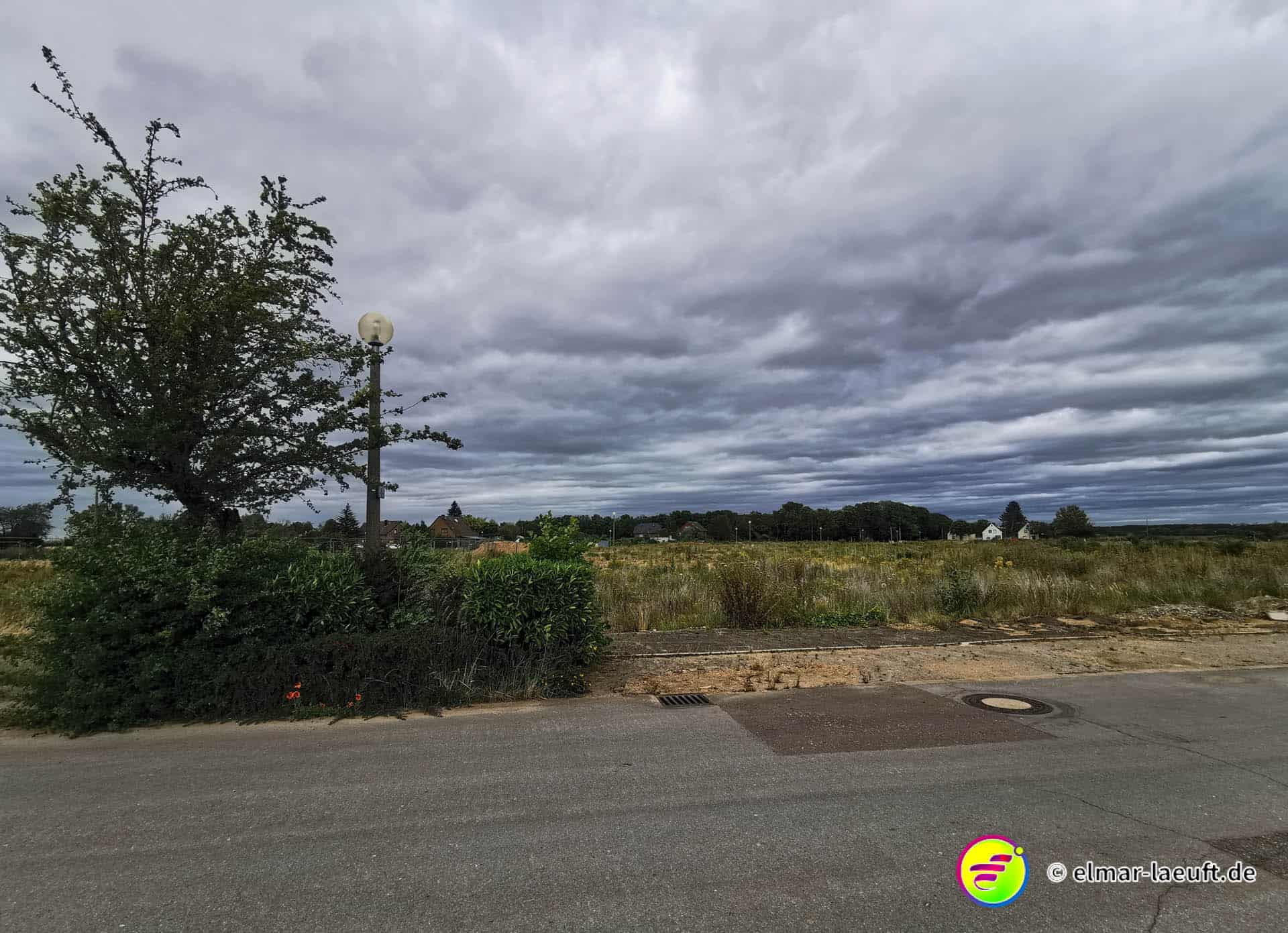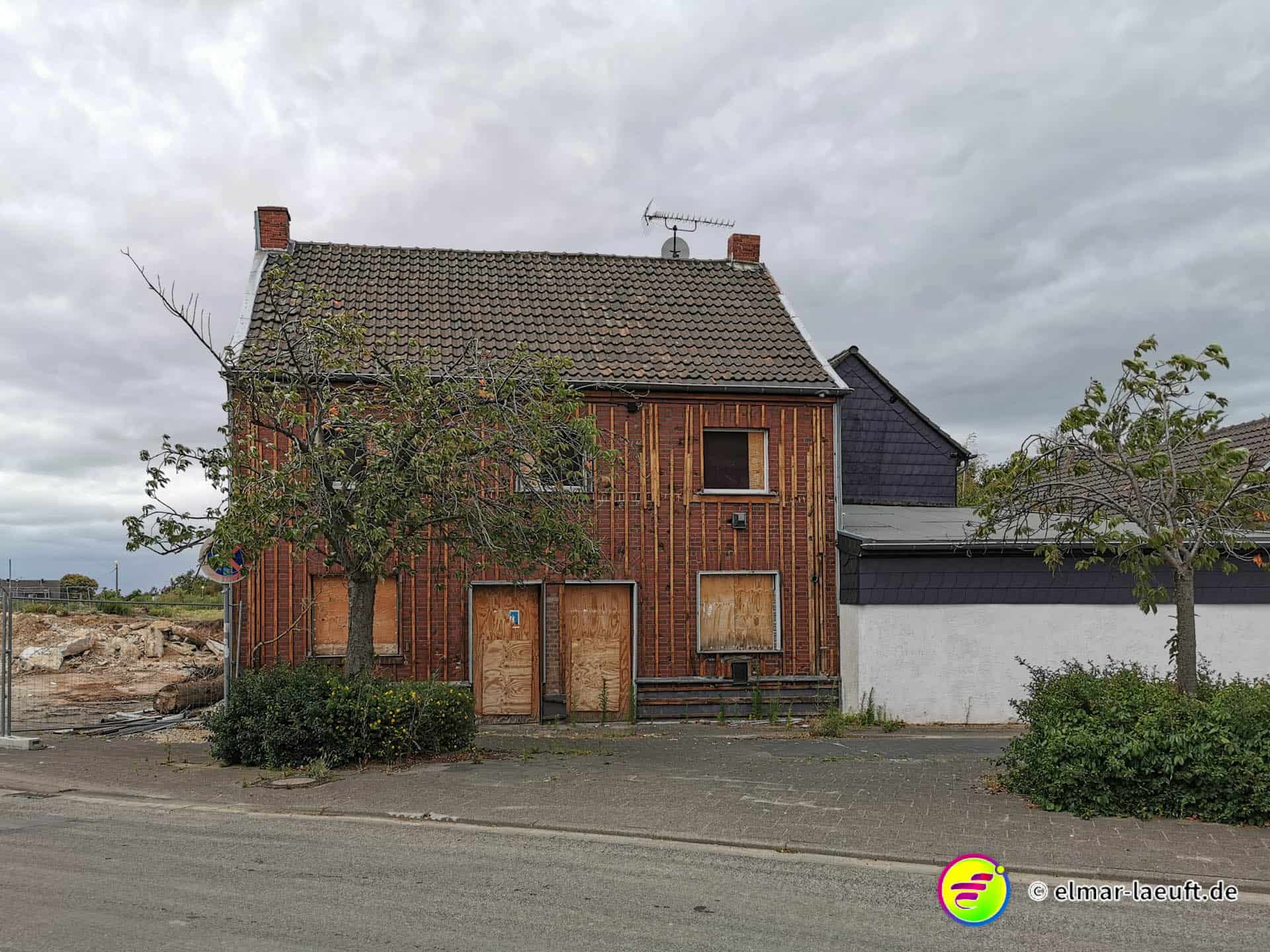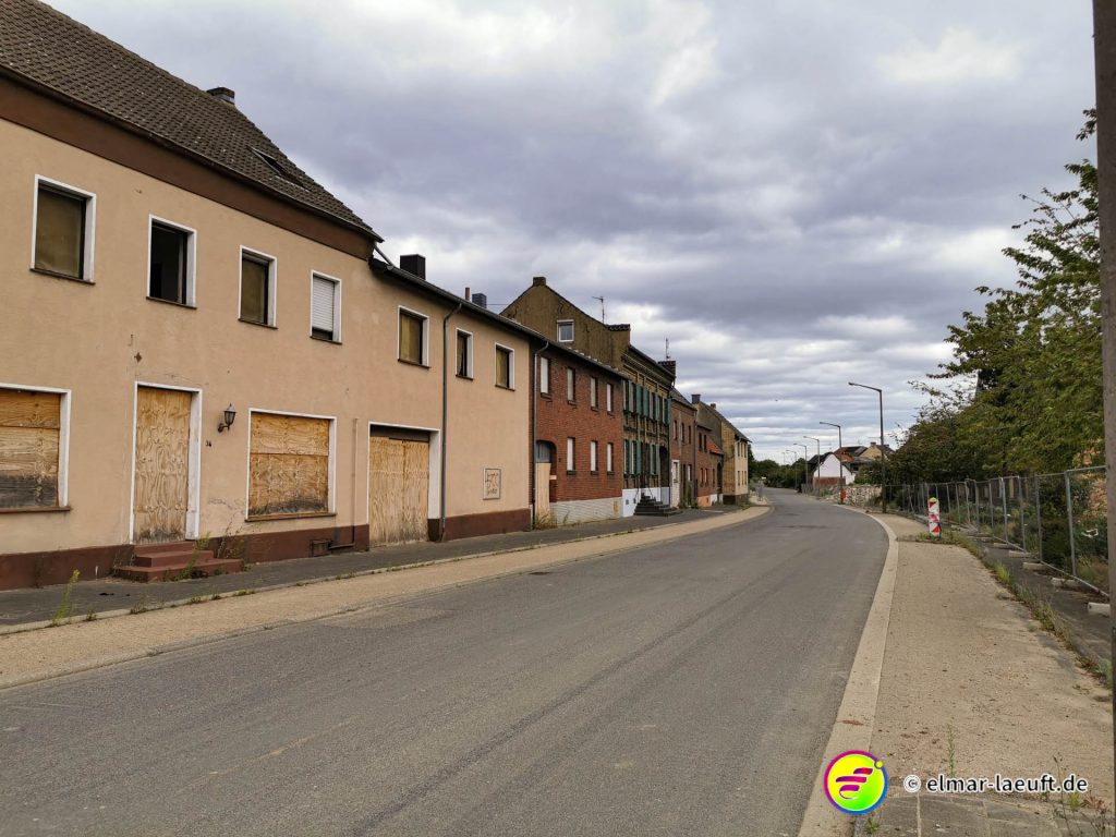 Der Straße folgend sehe ich weitere, leerstehende Häuser. Der Ort ist offenbar bereits lange tot. Die Leute sind weggezogen – oder geflüchtet. Die Häuser sind nur noch leere Hülsen einer vergessen Siedlung. Abseits der einsamen Häuser stehen bereits Bagger und bereiten das umliegende Land auf das Verschwinden vor. Eine alte Straßenlaterne im Wegrand deutet darauf hin, dass auch hier einmal Leute gewohnt haben. Jetzt sieht man die Reste eines alten Bürgersteiges und eine wilde Wiese.