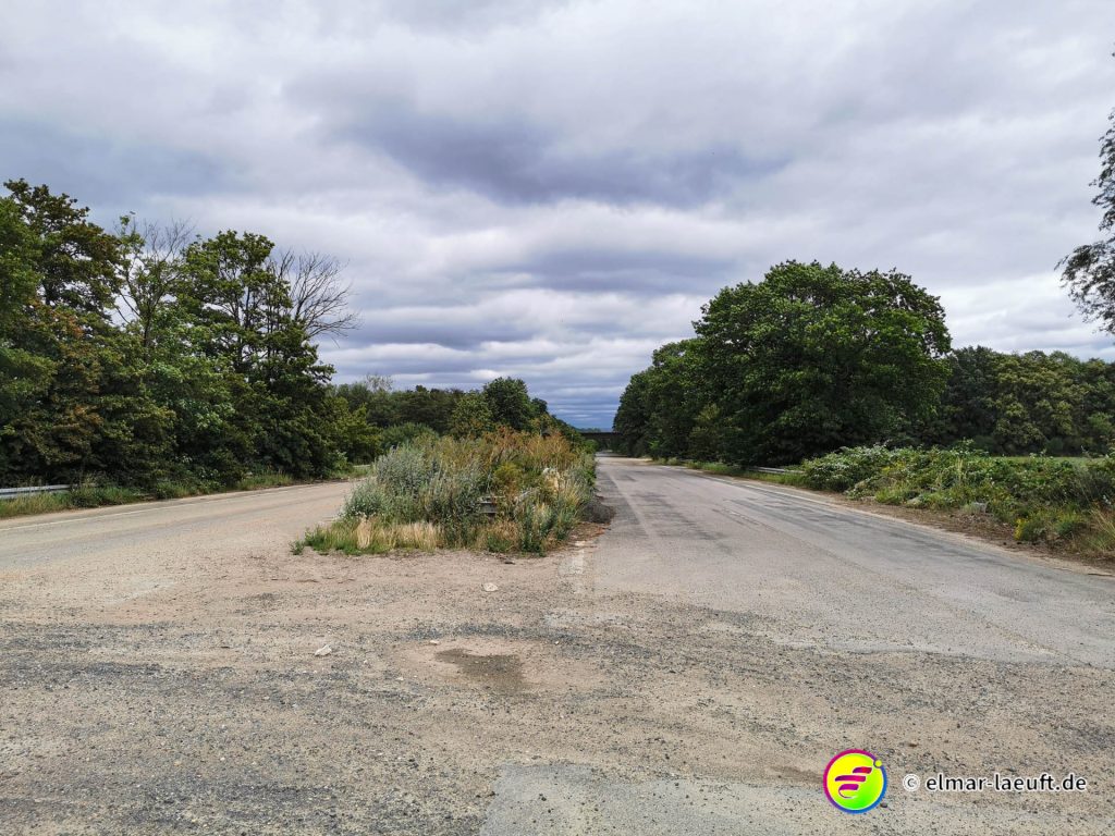 Nachdem ich den Ort auf der anderen Seite verlasse, gelange ich über ein Feld auf die Autobahn. Jedenfalls das, was von ihr übrig ist. Eine staubige, zweigeteilte Straße, die eher den Charme eines breiten Feldweges hat. Keine Besetzer, keine Polizei. Nicht dass ich es darauf angelegt hätte sie zu treffen. Dann laufe ich doch heute über die Autobahn. Das ist ohne Zweifel die kürzeste Strecke nach Bergheim.