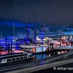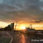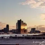 Oben verlasse ich die Anlage und umrunde das Gebäude, um zu einer kleinen Aussichtsplattform mit Blick auf die Stadt zu gelangen. Eine fest installierte Pommesbude – um diese Uhrzeit und um diese Jahreszeit – bleibt geschlossen. Am Horizont steigt gerade die Sonne über die Bebauung hinweg und beleuchtet einen kleinen Streifen der ElPhi, das gibt ein wirklich spektakuläres Bild ab. Ich genieße hier die Aussicht und kehre dann wieder zurück in den Tunnel, Treppe ab und Treppe auf, zurück auf den Parkplatz.