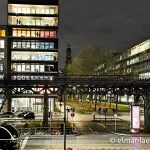 Ich stehe hier am Fuß des Hotels “Hafen Hamburg”, die Treppe hinauf ist verglichen mit der im Elbtunnel recht einfach. Von hier oben sehe ich immer noch die aufstrebende Sonne am Horizont. Unten auf der Straße erwacht die Stadt langsam merklich zum Leben. Passanten, die gerade aus der naheliegenden Hochbahn aussteigen, gehen links und rechts an mir vorbei. 08:00 Uhr – der Arbeitstag startet. Hinter dem Hotel gelange ich schnell an den Anfang der Reeperbahn – auch noch Ruhe an dieser Stelle. Kurz dahinter beginnt der ebenfalls noch geschlossene Winterdom. Auf der anderen Straßenseite betrete ich die Parkanlage Planten un Blomen, in der ich immerhin einige Jogger-Kollegin*Innen antreffe. Weiter im Gelände treffe ich auf die Eisarena, an der ich den Park schließlich auch wieder verlasse.