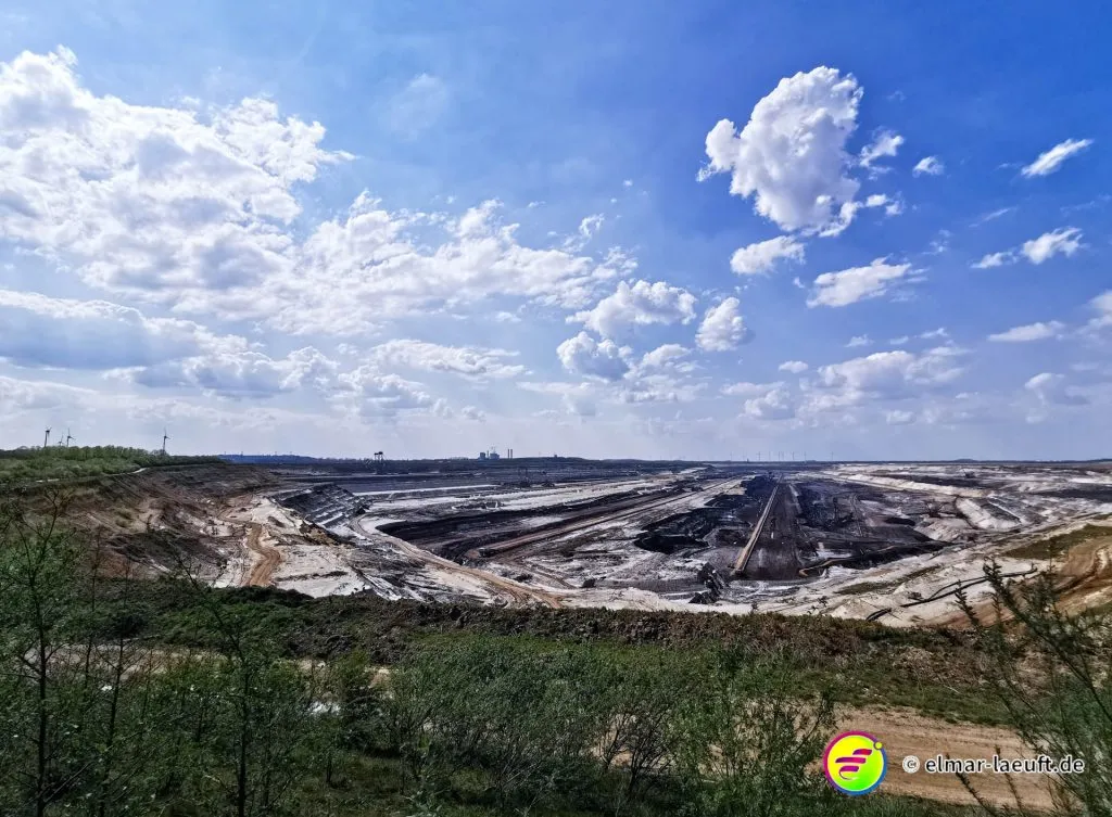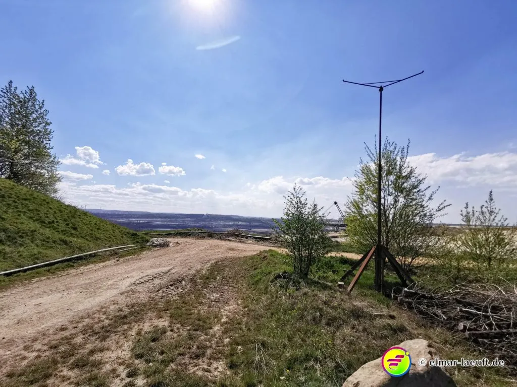 Ich folge der Seitenlinie des Tagebaus. Eine recht triste Angelegenheit, aber man hat jederzeit einen freien Blick auf die riesige Grube. Das gibt mir die Gelegenheit für ein paar interessante Aufnahmen. Am Rand eines Ackers laufe ich auf eine Anhöhe und bin nun auf einer Art Wall, der die Straße vom Baugelände abtrennt. Ich laufe im Prinzip genau auf der Grenze. Nach etwa 20km gelangt der Indemann in mein Sichtfeld.