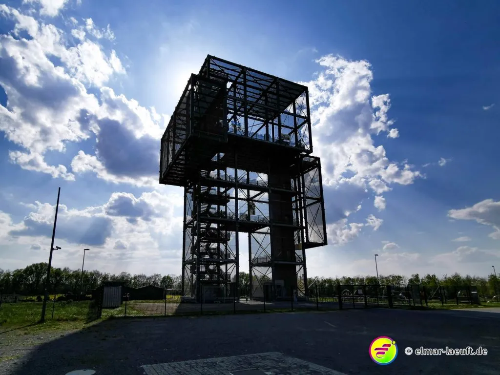 Mit ein wenig Abstand zur Grube laufe ich durch endlose, knöchrige Feldwege am Rande der Absperrung. Auch wenn ich hier mitten im Feld und quasi im Nirgendwo bin, stehen aber dennoch brav im Abstand von 100 Metern Schilder mit Sperrhinweisen. Ich verwende die Schilder als Navigationslinie, bis ich am Fuß des Hügels angekommen bin, auf dem irgendwo der Indemann stehen muss. Da ich keinen anderen Weg finde, klettere ich vorsichtshalber mehrere Ebenen des Hügels quer durch den Wald hinauf. Schon bald erkenne ich Gebäude und Teile des Stahlkäfigs.