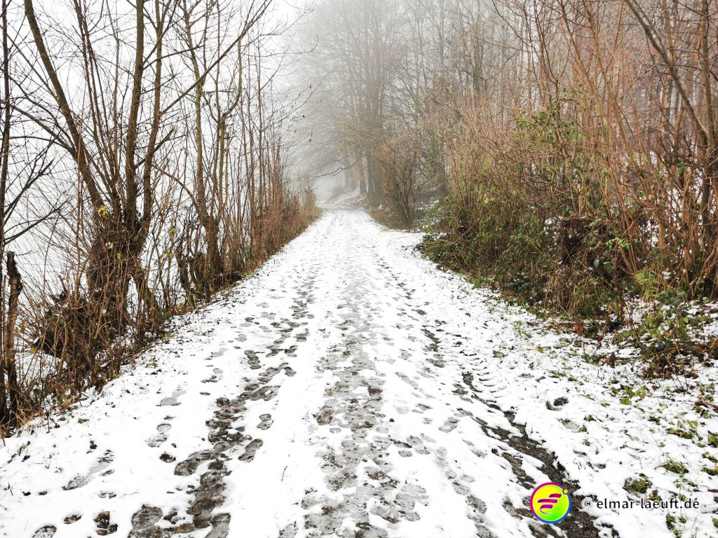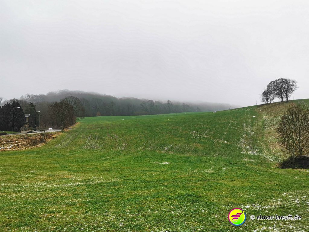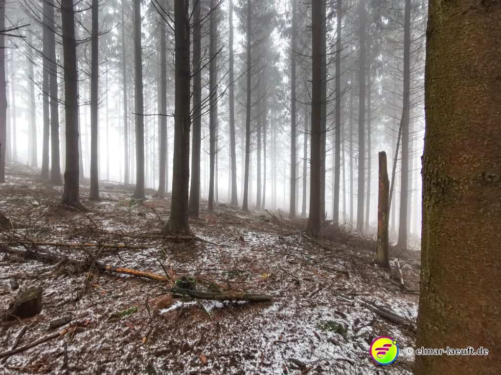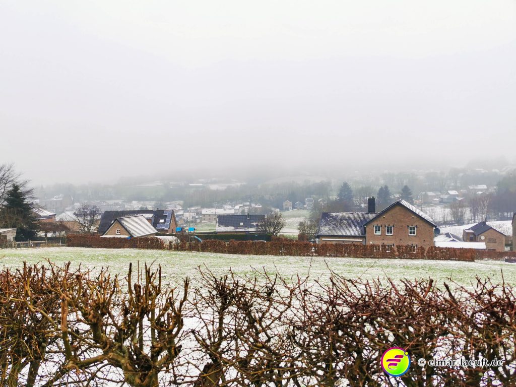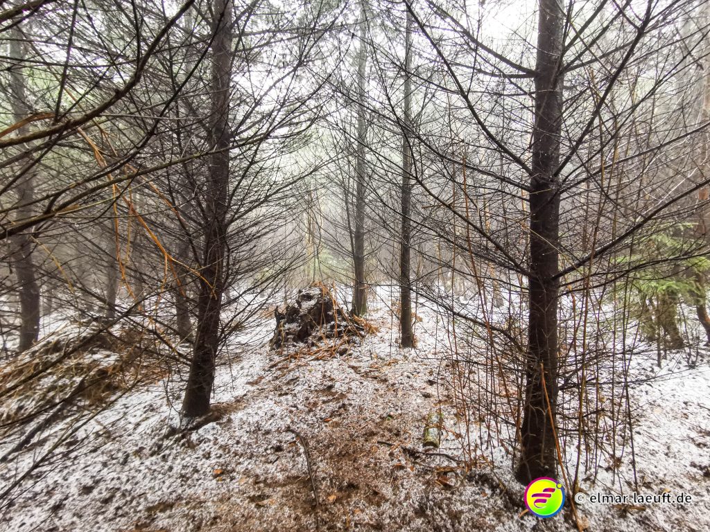 Ich muss nur eine kleine Strecke zurücklegen, bis die nagelneuen Schuhe deckend mit Matsch überzogen sind. Naja, früher oder später wäre das eh passiert. Dann ist eben früher. Hinter Gemmenich gewinne ich langsam an Höhe und die Landschaft beginnt sich leicht weiß zu färben. Aber auch im Wald ist der Schnee schon weitestgehend geschmolzen und es bleiben nur kahle Wälder mit puderigem Boden und einer gespenstischen Nebelwand irgendwo hinter den Bäumen.