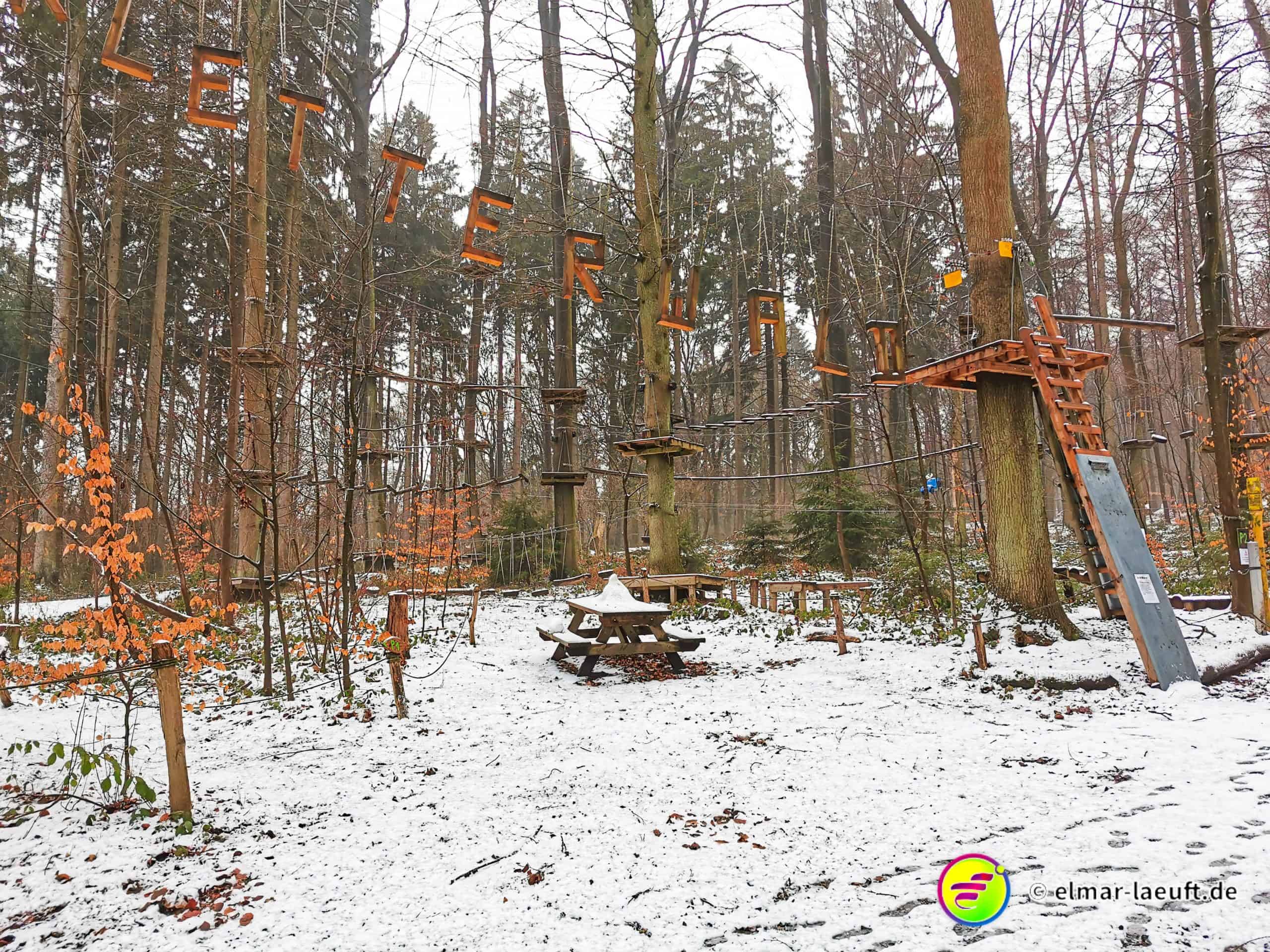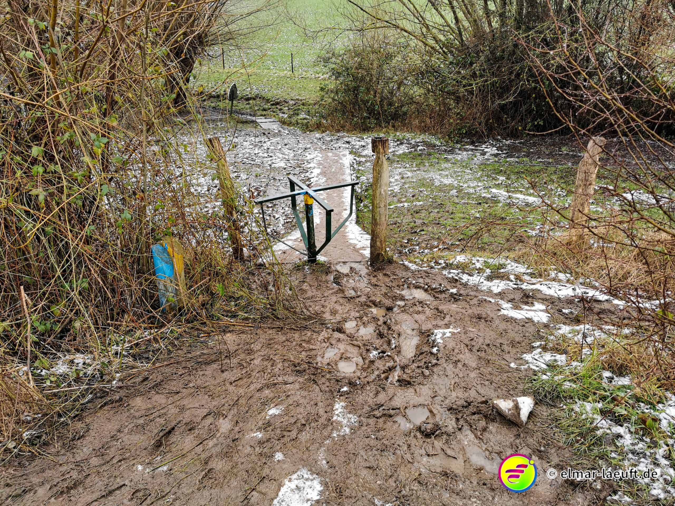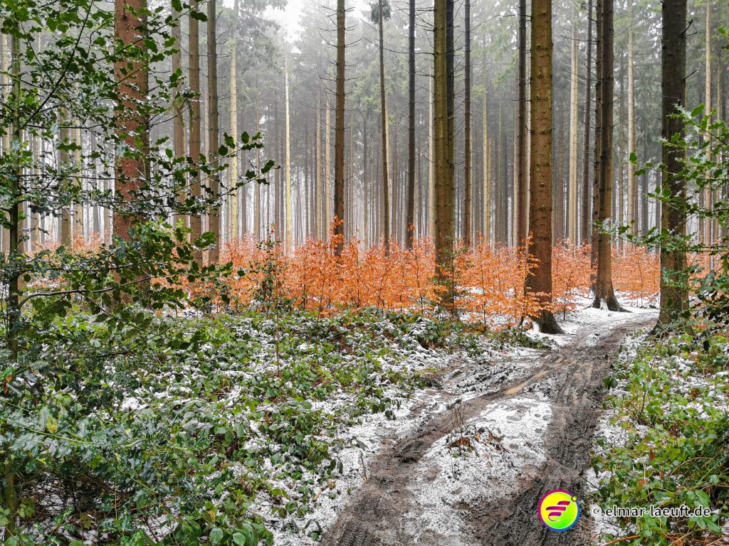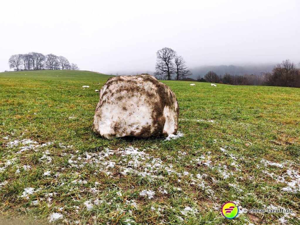 Ich muss nur eine kleine Strecke zurücklegen, bis die nagelneuen Schuhe deckend mit Matsch überzogen sind. Naja, früher oder später wäre das eh passiert. Dann ist eben früher. Hinter Gemmenich gewinne ich langsam an Höhe und die Landschaft beginnt sich leicht weiß zu färben. Aber auch im Wald ist der Schnee schon weitestgehend geschmolzen und es bleiben nur kahle Wälder mit puderigem Boden und einer gespenstischen Nebelwand irgendwo hinter den Bäumen.