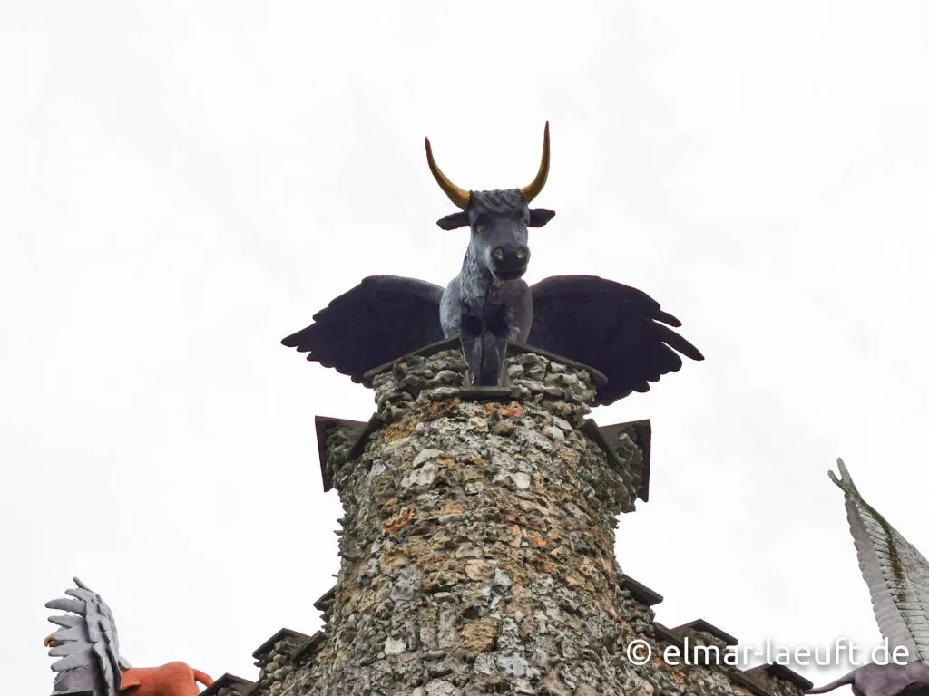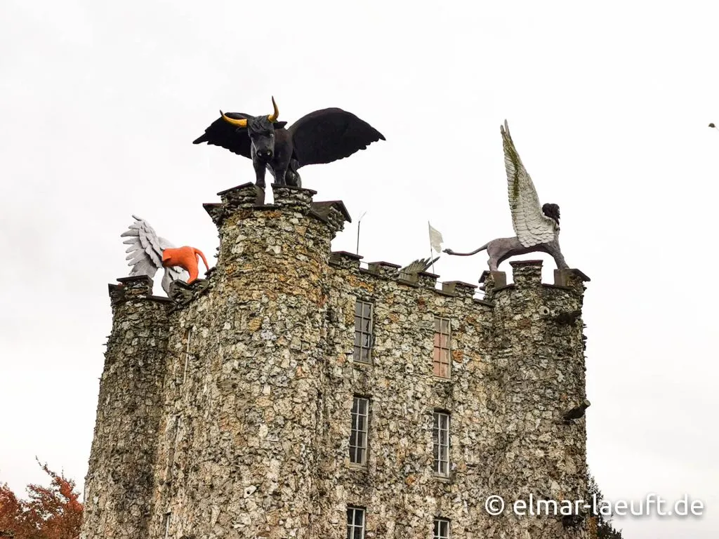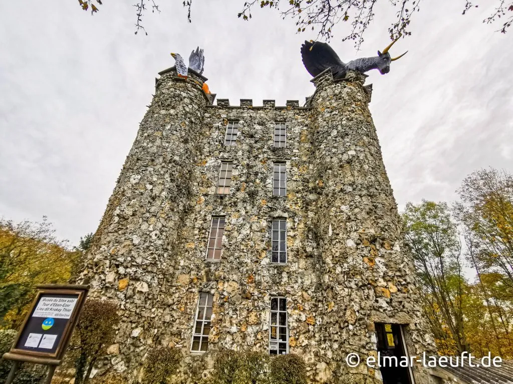 Ich habe Glück, denn das Gebäude liegt an einem freien, unversperrten Weg und ich kann mich direkt bis davor annähern. Das, was ich für eine Burg gehalten habe, ist der Turm von Eben-Ezer. Ein wirklich skurriler Bau aus groben Steinen mit apokalyptischen Figuren, jeweils eine auf jeder Ecke. Das Innere beherbergt das Musée du Silex.