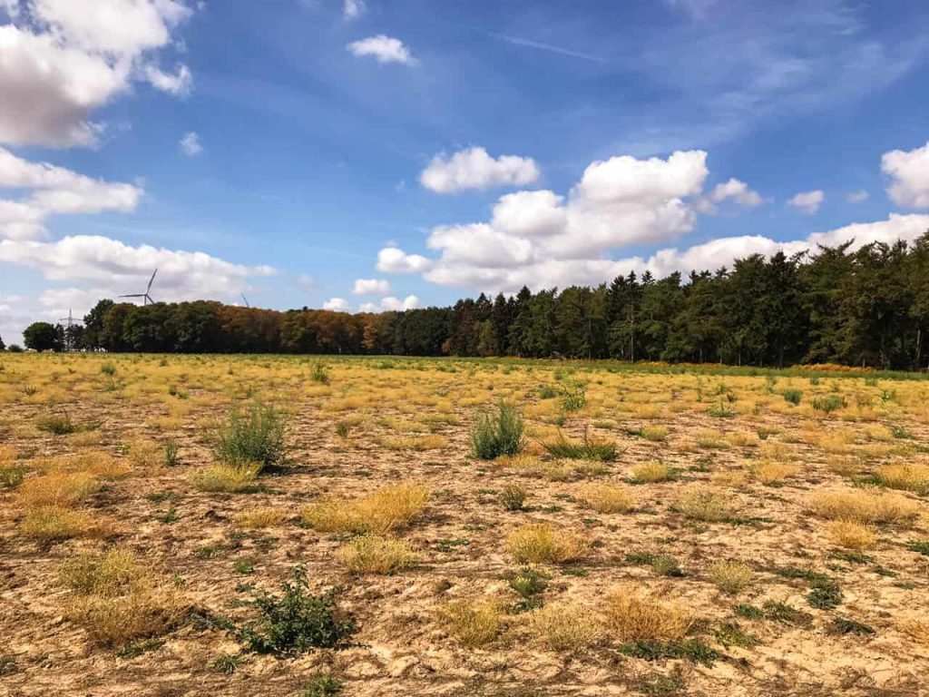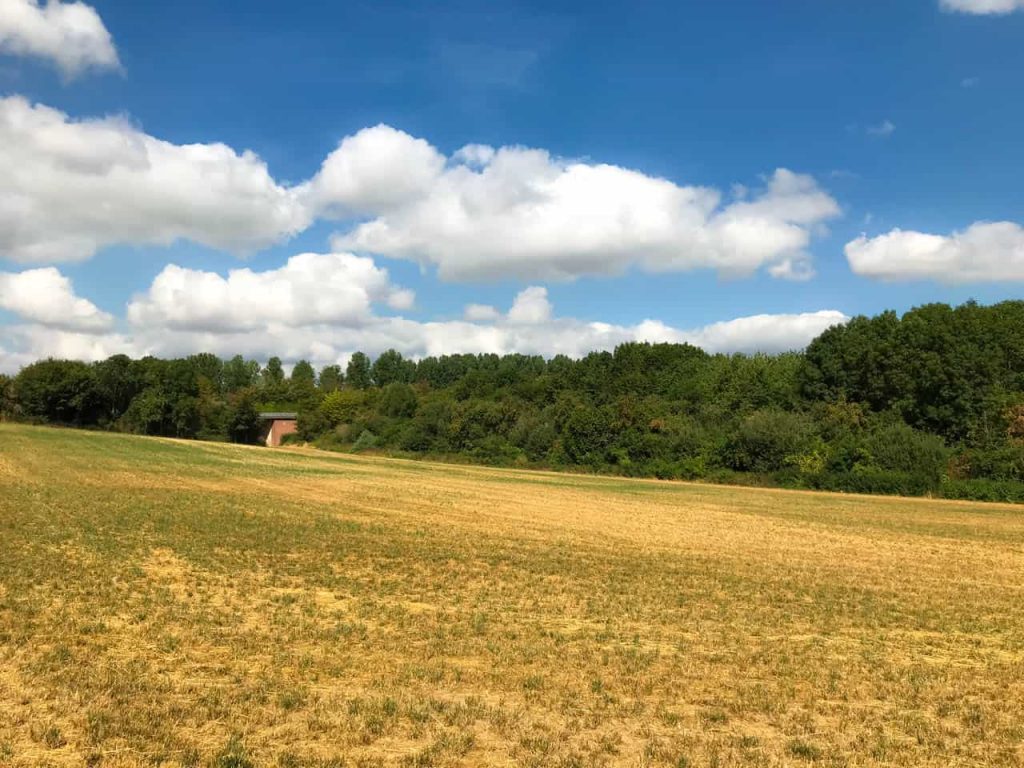 Böse Zungen haben den vorigen Tag auch als “Elmar säuft” betitelt – aber das ist so in der in der Form natürlich nicht zutreffend?! Da ich heute also durch das offene Feld laufe, sticht mir die unglaubliche Trockenheit sehr stark ins Auge. Die vorherrschenden Farben sind braun-gelb und ein blasses grün. Dagegen bildet das Azurblau am Himmel einen starken Kontrast. Wo sind die Farben? Oder: ist das etwa die Farbe des Sommers?
