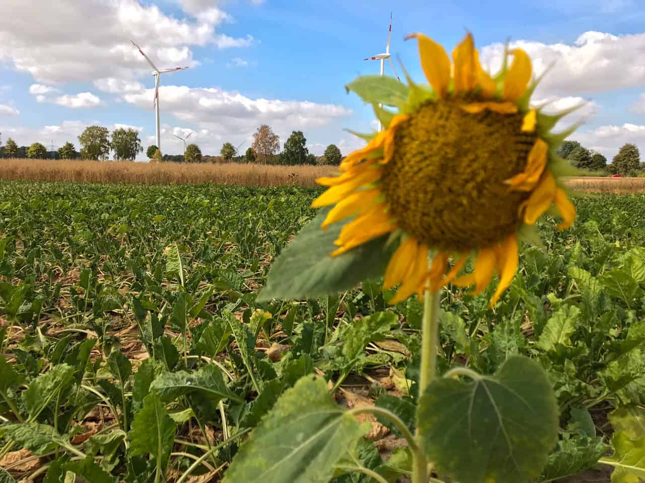 Meine Strecke führt mich über zahllose abgeerntete Felder und hier und da erblicke ich tatsächliche einige grüne Pflanzen und Sträucher mit Früchten. Das bleibt aber die Ausnahme. Eine einzelne Sonnenblume am Feldrand wirkt geradezu so, als wäre Sie selber traurig über die vertrockneten Erntepflanzen. Manche Areale wirken wie eine Steppe, wie ich sie bislang nur aus südlichen Ländern kenne.