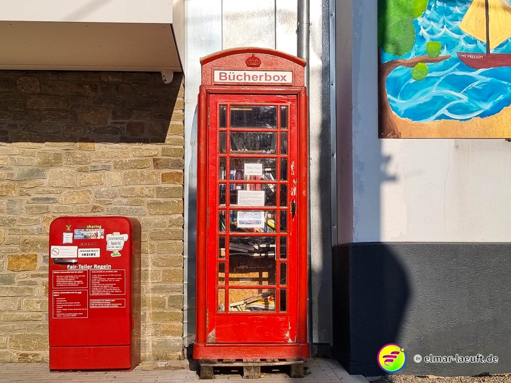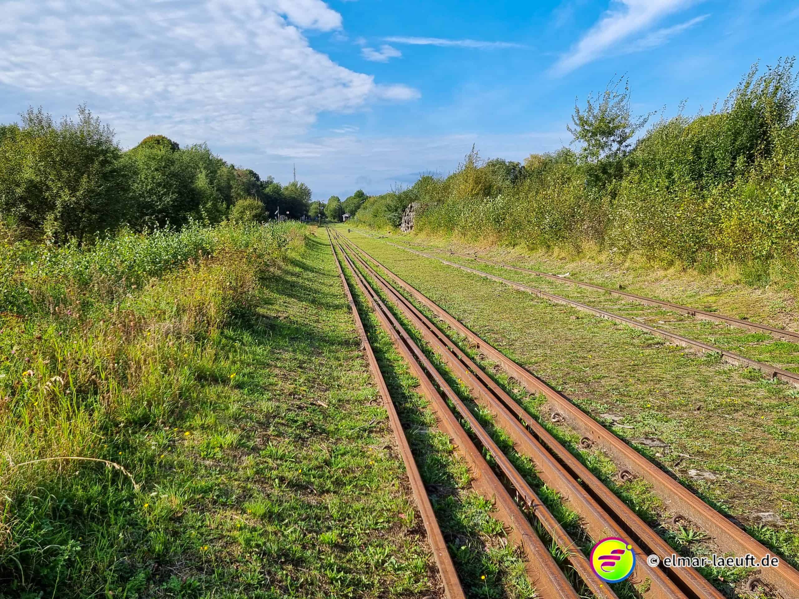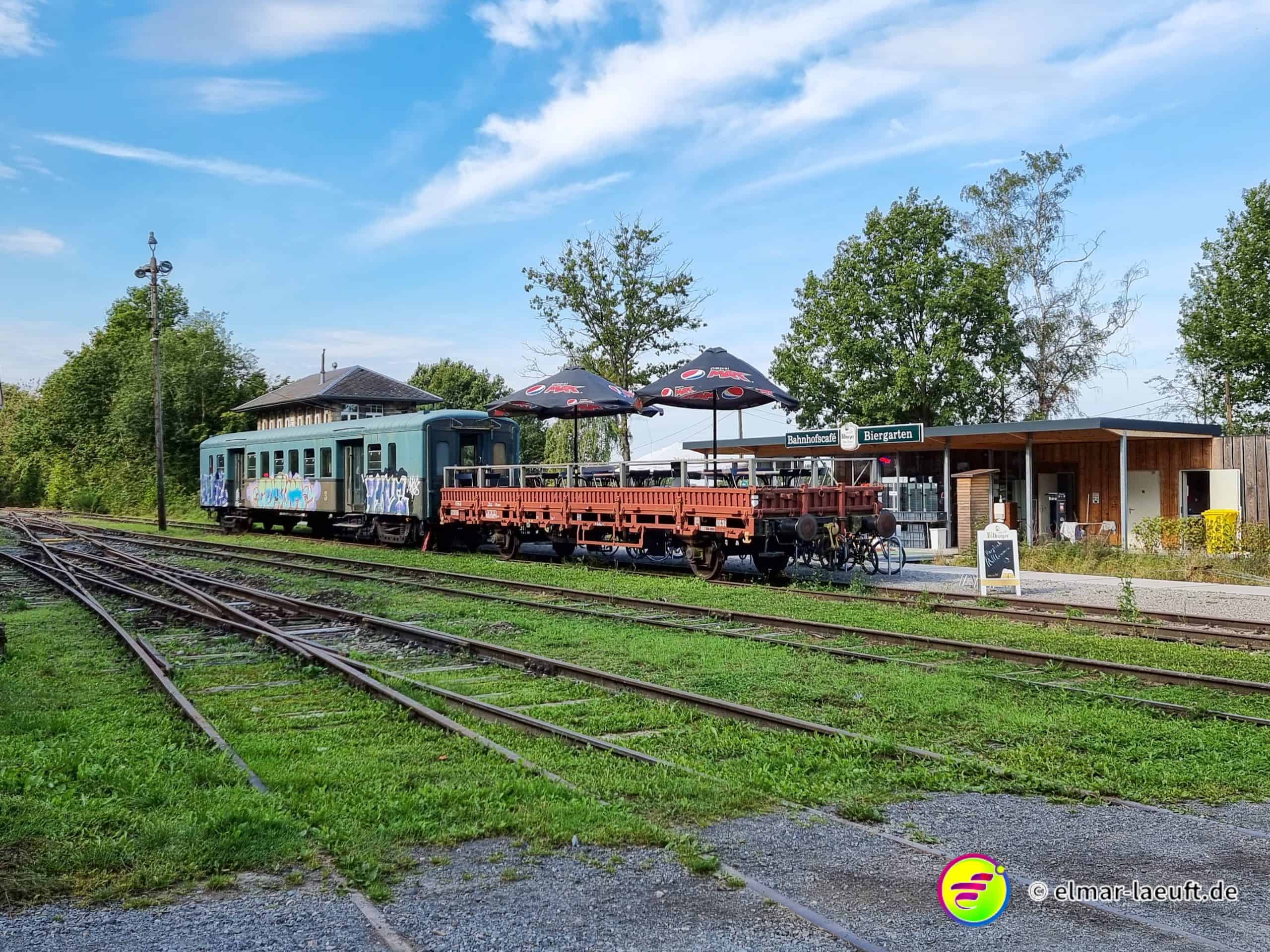 Dabei befinde ich auch immer wieder einer Kuhwiese gemeinsam mit den Kühen. Und die Wiesen waren durchaus zugänglich über diese Gatter. Die Kühe stört es aber nicht. Sie liegen dort entspannt und lassen mich vorbeispazieren. Am Ende bin ich wieder auf einer Seitenstraße und komme am alten Bahnhof Raeren an. Die Anlage ist in einer moderaten Menge Unkraut gefangen, das Gebäude ist natürlich nicht zugänglich. Den Schienen folgend ist noch ein zweites Gebäude, das man mittlerweile zu einem kleinen Café umfunktioniert hat.
