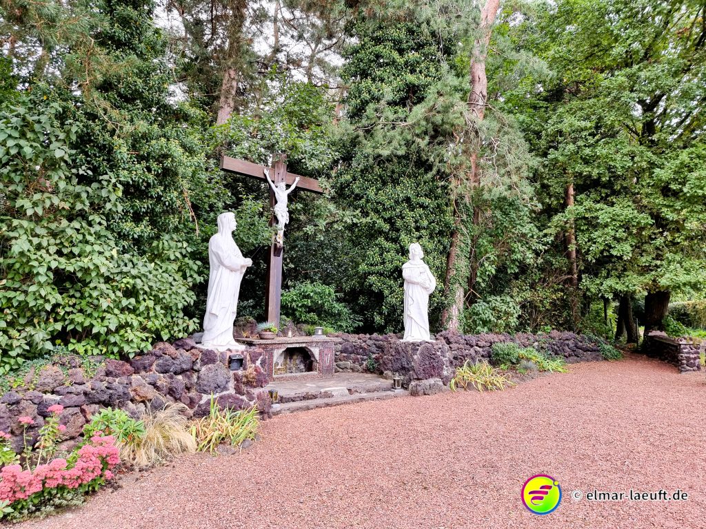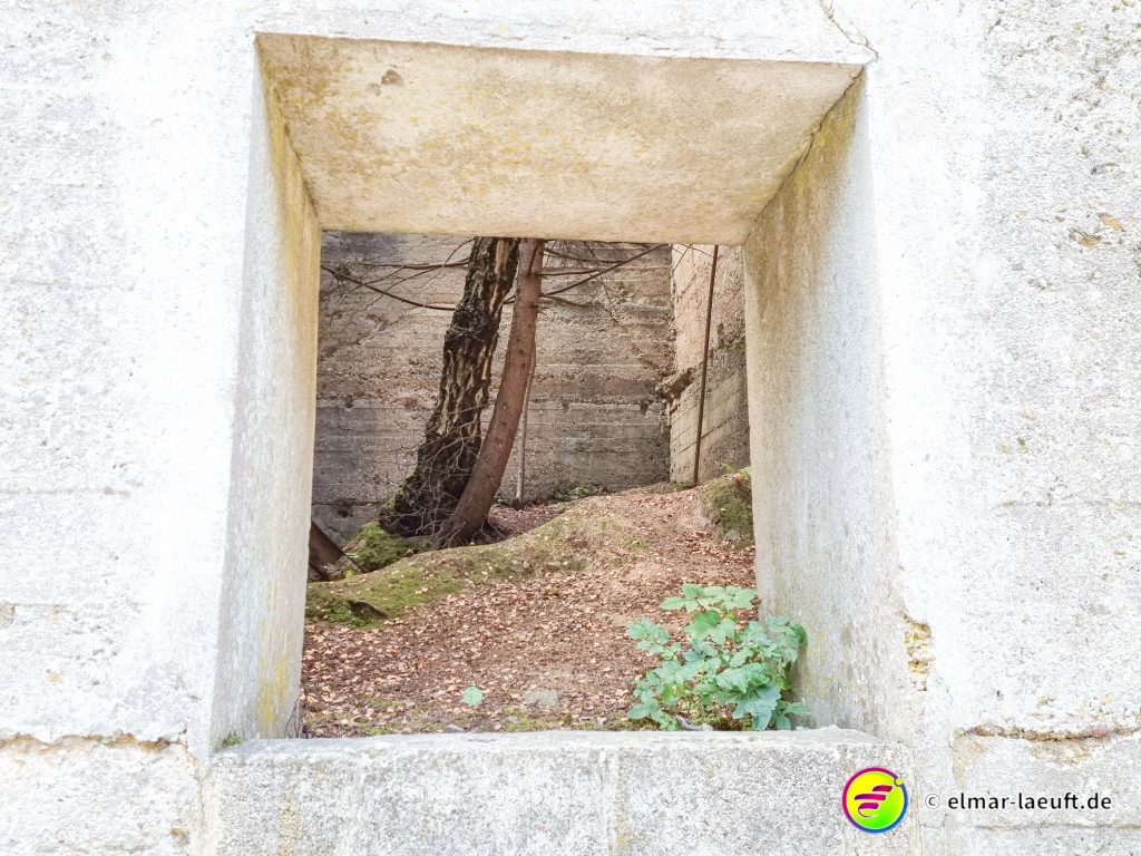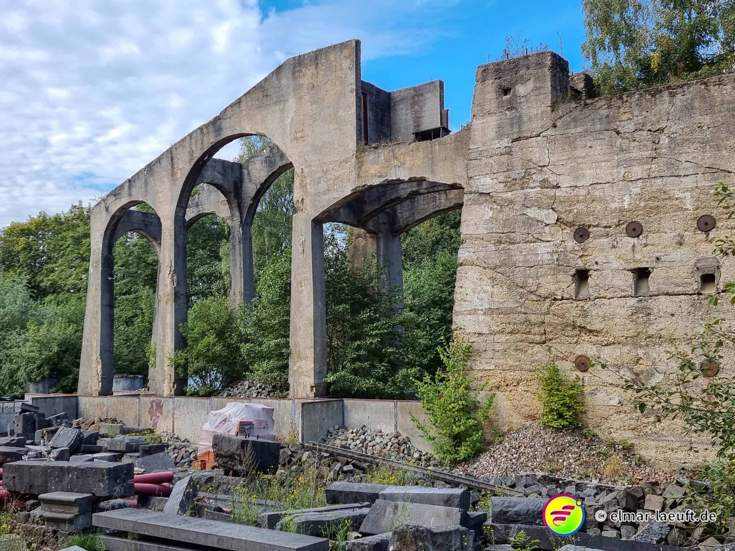 Jetzt geht es Richtung Wald und ich folge ein ganzes Stück der Vennbahn. Seitlich liegt das alte Marmorwerk mit interessanten Überresten eines Beton-Skeletts. Das Bauwerk hat neben den Bögen einen kleinen Turm, in dem innen ein mittelgroßer Baum wächst. Neben dem Marmorwerk geht es weiter in den Wald neben der alten Bahntrasse entlang.