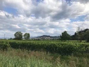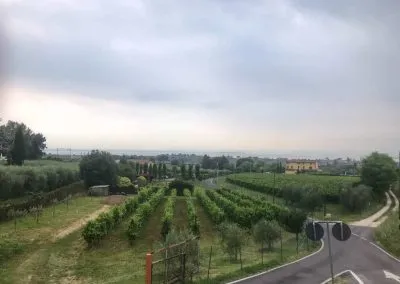 Es ist noch bewölkt und noch nicht wirklich warm. Ich schleiche aus dem Hotel und folge der Straße, in deren Richtung ich den Gardasee vermute. Ich blicke von einer Anhöhe auf eine leicht hügelige Landschaft mit hochgewachsenen Zypressen und vielen Reihen mit Weinstöcken. In der ferne erkenne ich bereits den Gardasee. Die Wolken schieben sich beiseite und es wird heiß. Gut, dass ich vorsichtshalber eine lange Hose angezogen habe.