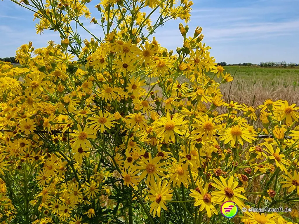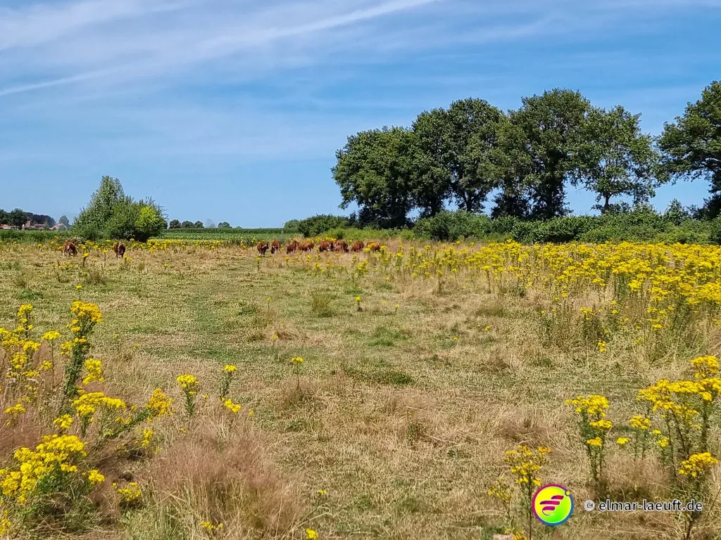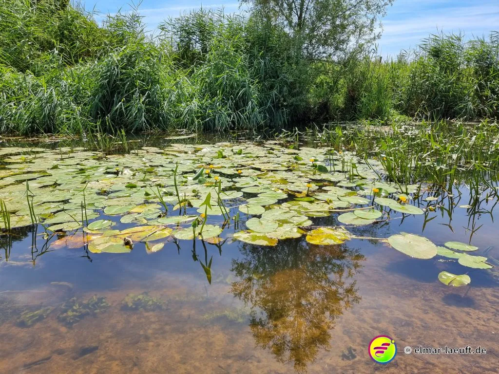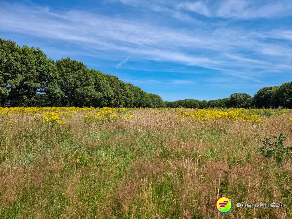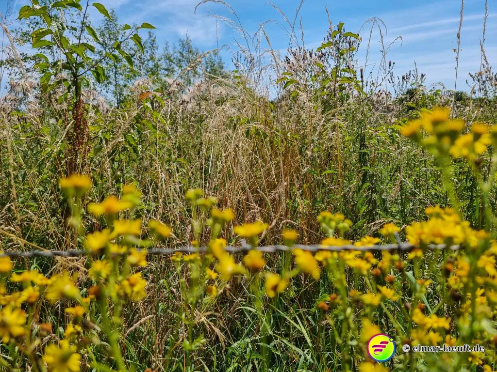 Das eigentliche Ziel meiner kleiner Rundreise heute ist dieser kleine Fluss, er hat in der Karte den Namen “Tungelroyse Beek”. Ich werde ihm eine ganze Weile folgen, bis ich wieder an meinen Ausgangspunkt zurückkehre. Das Ufer nebem dem Fluß ist spärlich gemäht, wahrscheinlich einmal im Frühjahr. Es ist nicht ganz trocken und beide Seiten sind geradezu überschwänglich grün. Die andere Seite ist dicht mit Schilf und hohen Gräsern bewachsen, meine Seite hat eine Unmenge an Blumen, wie man sie von Feldern als Blühstreifen kennt.