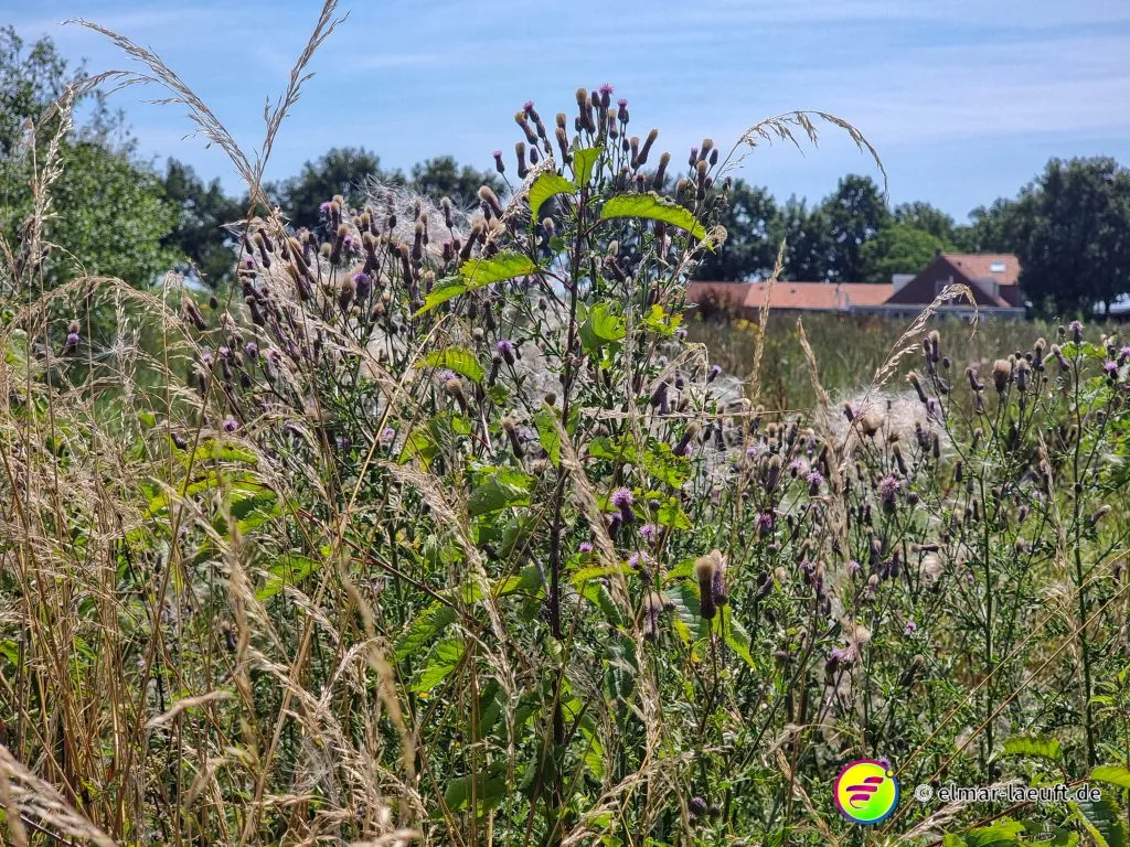 Jetzt muss ich über das Feld wieder auf den nächsten, festen Weg zurück finden. Rechts von mir liegt ein Graben mit vielen Brennnesseln am Rand, das sieht nicht sehr einladend aus. Vor mir alternativ ein kleiner Wald, der mit vielen unangenehmen Pflanzen dicht bewachsen ist. Bleibt noch das Maisfeld – das ist einen Versuch wert. Nachdem ich die andere Seite erreicht habe und mannshohes Gras durchquert habe, stehe ich vor noch mehr Brennnesseln. Ich kann förmlich die Blicke der lauernden Zecken im Gebüsch spüren. Ich sollte vorsichtig sein. Und ich komme hier nicht weiter, also bleibt mir nur der kleine Graben vom Beginn und dafür verhältnismäßig wenige Brennnesseln – was soll’s, ich bin zurück auf einem festen Weg.