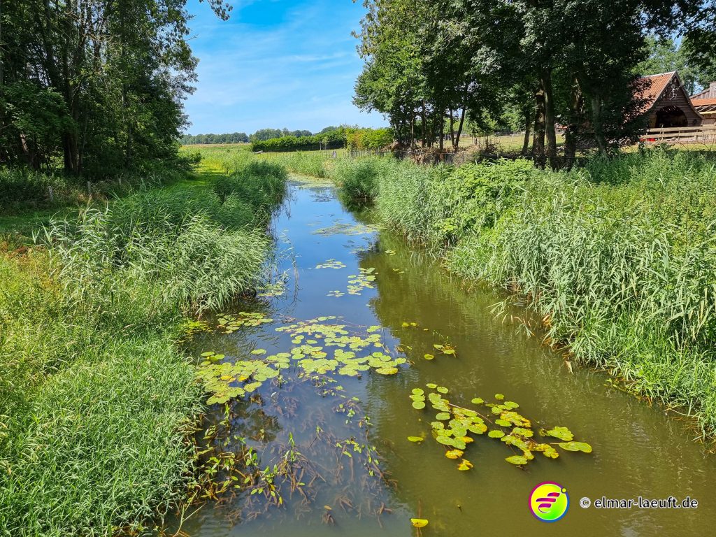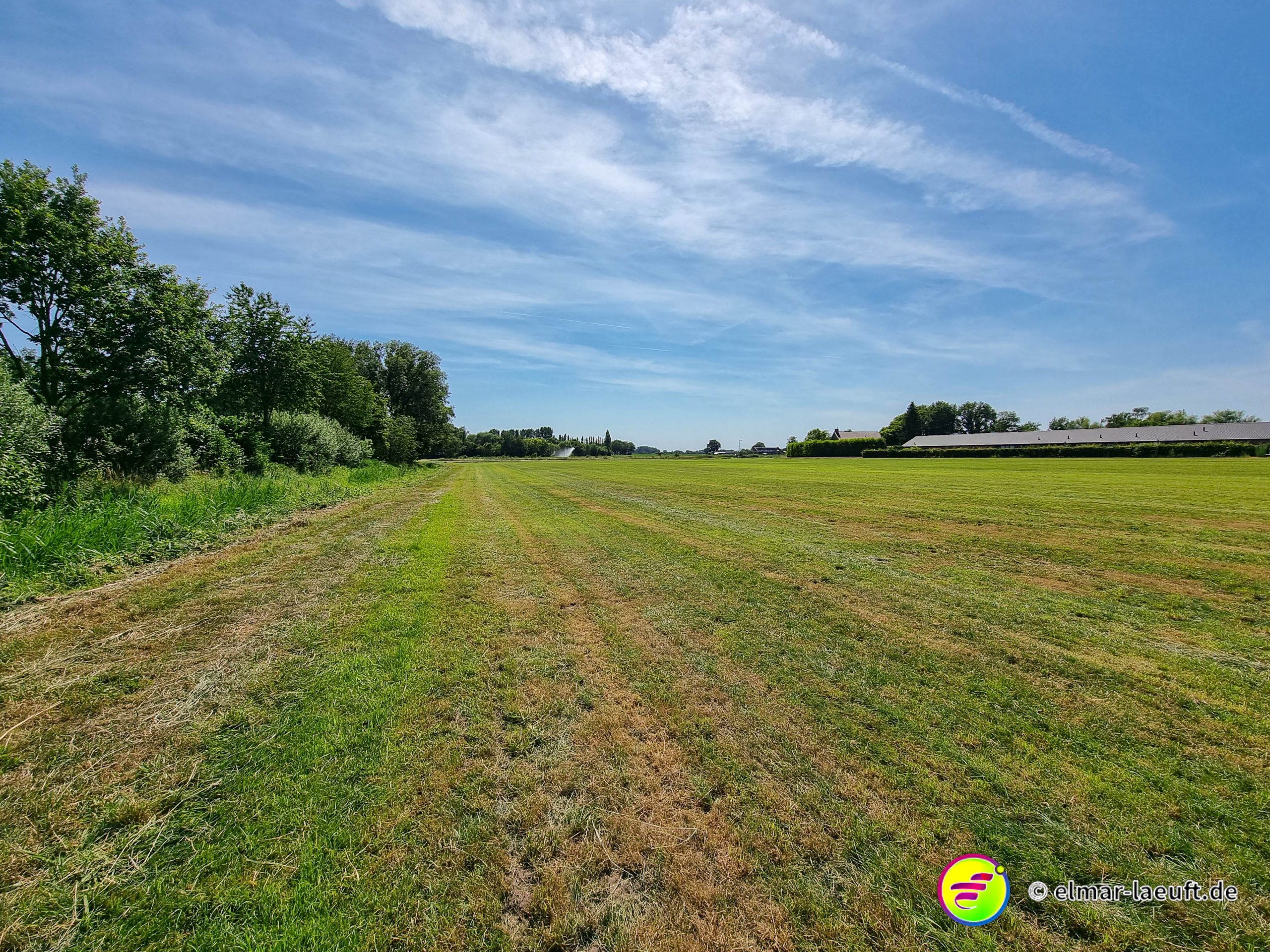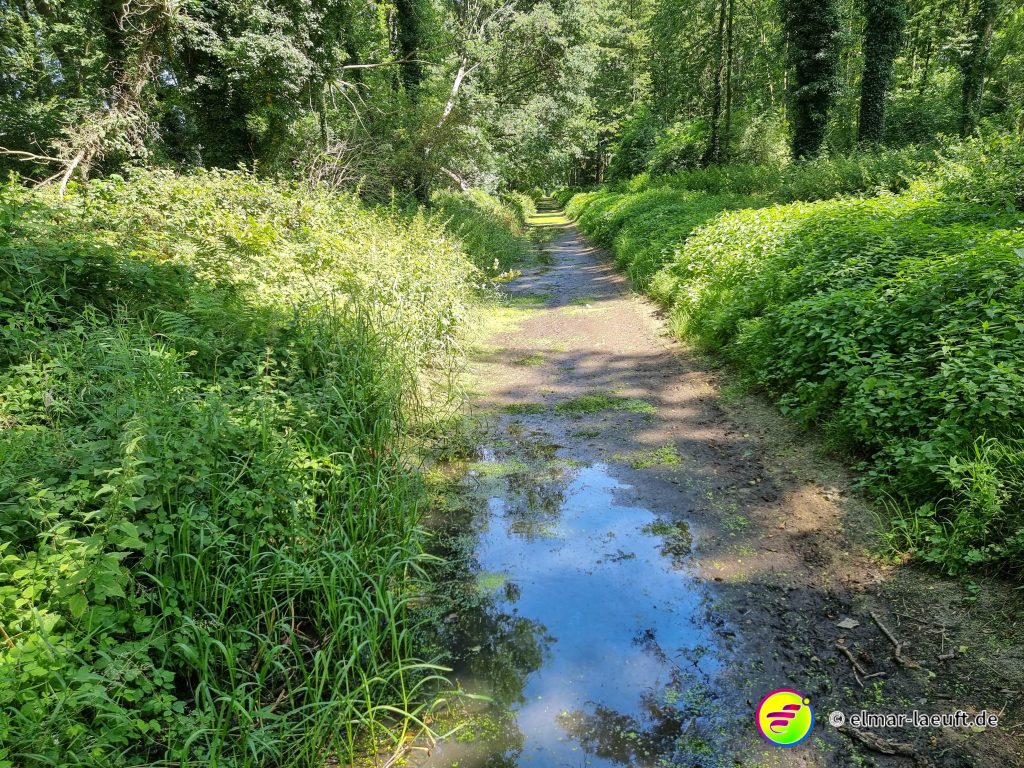 Jetzt muss ich über das Feld wieder auf den nächsten, festen Weg zurück finden. Rechts von mir liegt ein Graben mit vielen Brennnesseln am Rand, das sieht nicht sehr einladend aus. Vor mir alternativ ein kleiner Wald, der mit vielen unangenehmen Pflanzen dicht bewachsen ist. Bleibt noch das Maisfeld – das ist einen Versuch wert. Nachdem ich die andere Seite erreicht habe und mannshohes Gras durchquert habe, stehe ich vor noch mehr Brennnesseln. Ich kann förmlich die Blicke der lauernden Zecken im Gebüsch spüren. Ich sollte vorsichtig sein. Und ich komme hier nicht weiter, also bleibt mir nur der kleine Graben vom Beginn und dafür verhältnismäßig wenige Brennnesseln – was soll’s, ich bin zurück auf einem festen Weg.