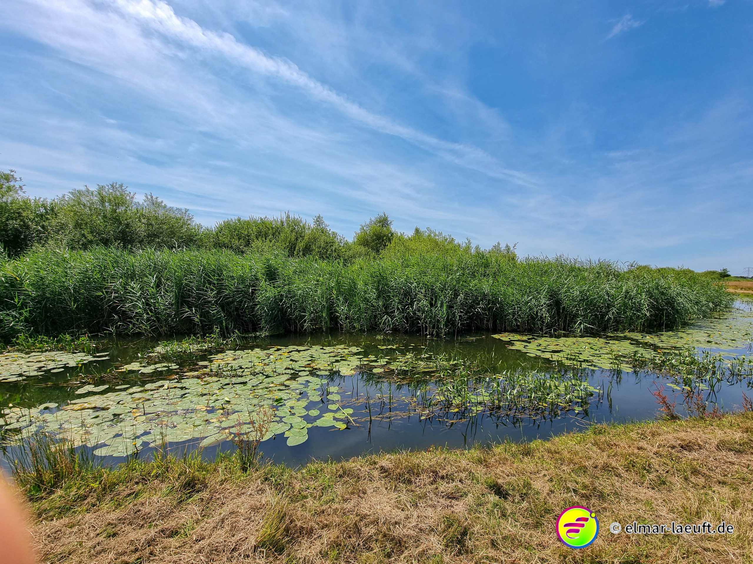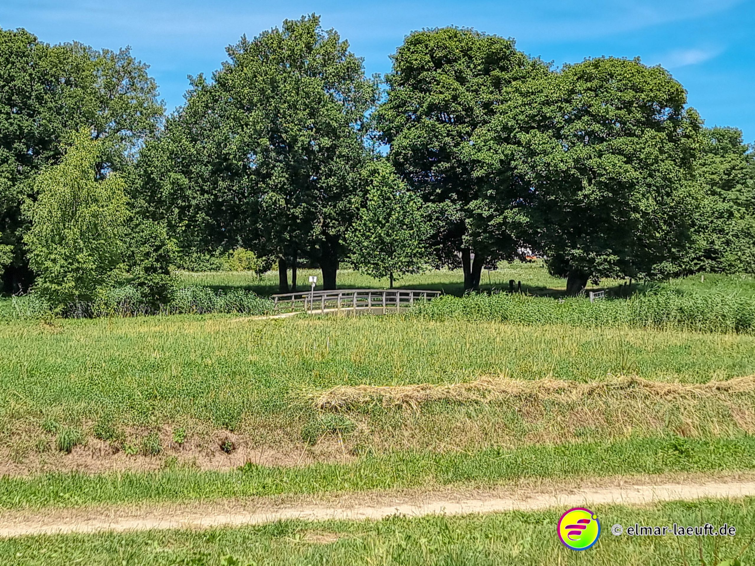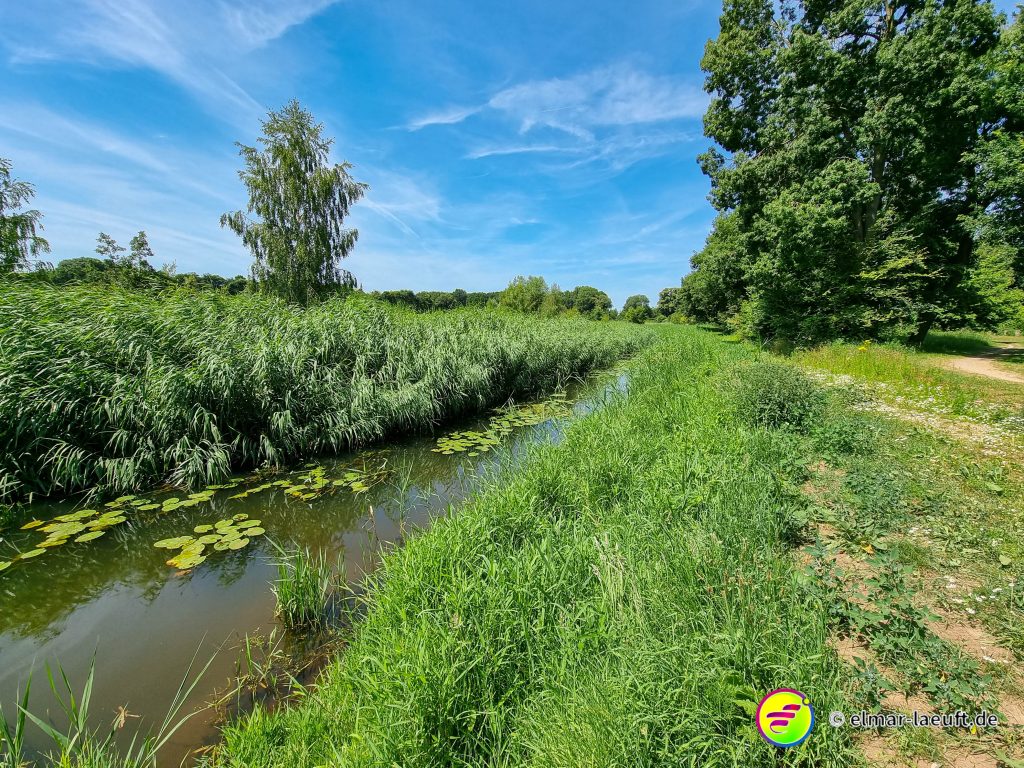 Der Weg teilt sich in einzelne Abschnitte, die jeweils mit Wildsperren und einem Drehkreuz für Fußgänger abgeteilt sind. Die Übergänge sind aber meist zugewachsen und ich muss über die Zäune klettern, um nicht durch die dornigen Sträucher an den Drehkreuzen gehen zu müssen. Auch der Untergrund am Ufer ist stoppelig und uneben, das ist für das Durchhalten beim Laufen eine Herausforderung. Auf einer Strecke von gut sechs Kilometern bin ich komplett in einem Meer von Pflanzen versunken. Nicht, ohne dass mir auf dem ein oder anderen Abschnitt ein paar Kühe über den Weg laufen. Am letzen Abschnitt stehen die Kühe auf und stieren mich an. Ich deute das als kein Zeichen der Freundschaft und weiche auf das benachbarte Feld aus.