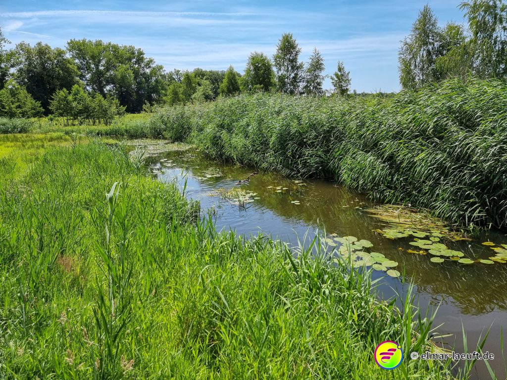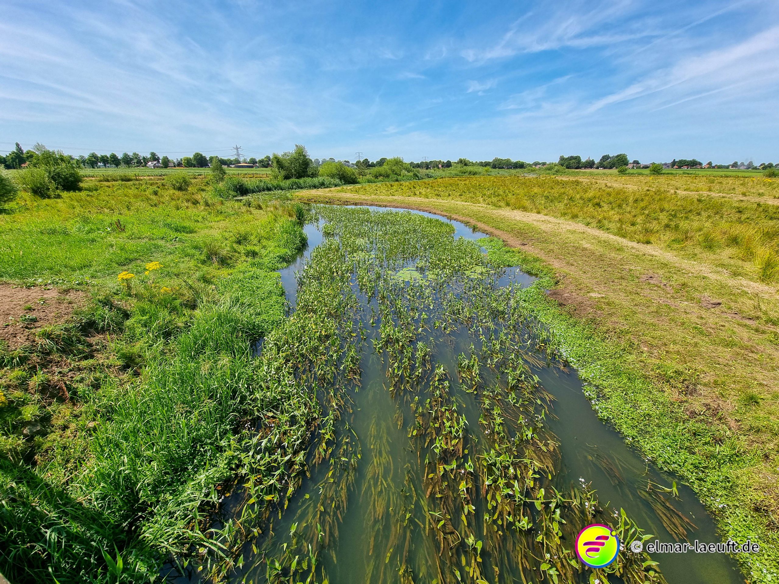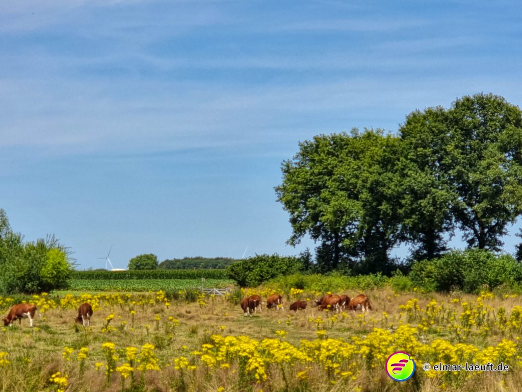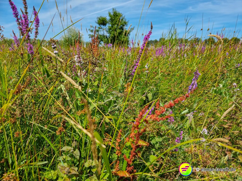 Das eigentliche Ziel meiner kleiner Rundreise heute ist dieser kleine Fluss, er hat in der Karte den Namen “Tungelroyse Beek”. Ich werde ihm eine ganze Weile folgen, bis ich wieder an meinen Ausgangspunkt zurückkehre. Das Ufer nebem dem Fluß ist spärlich gemäht, wahrscheinlich einmal im Frühjahr. Es ist nicht ganz trocken und beide Seiten sind geradezu überschwänglich grün. Die andere Seite ist dicht mit Schilf und hohen Gräsern bewachsen, meine Seite hat eine Unmenge an Blumen, wie man sie von Feldern als Blühstreifen kennt.