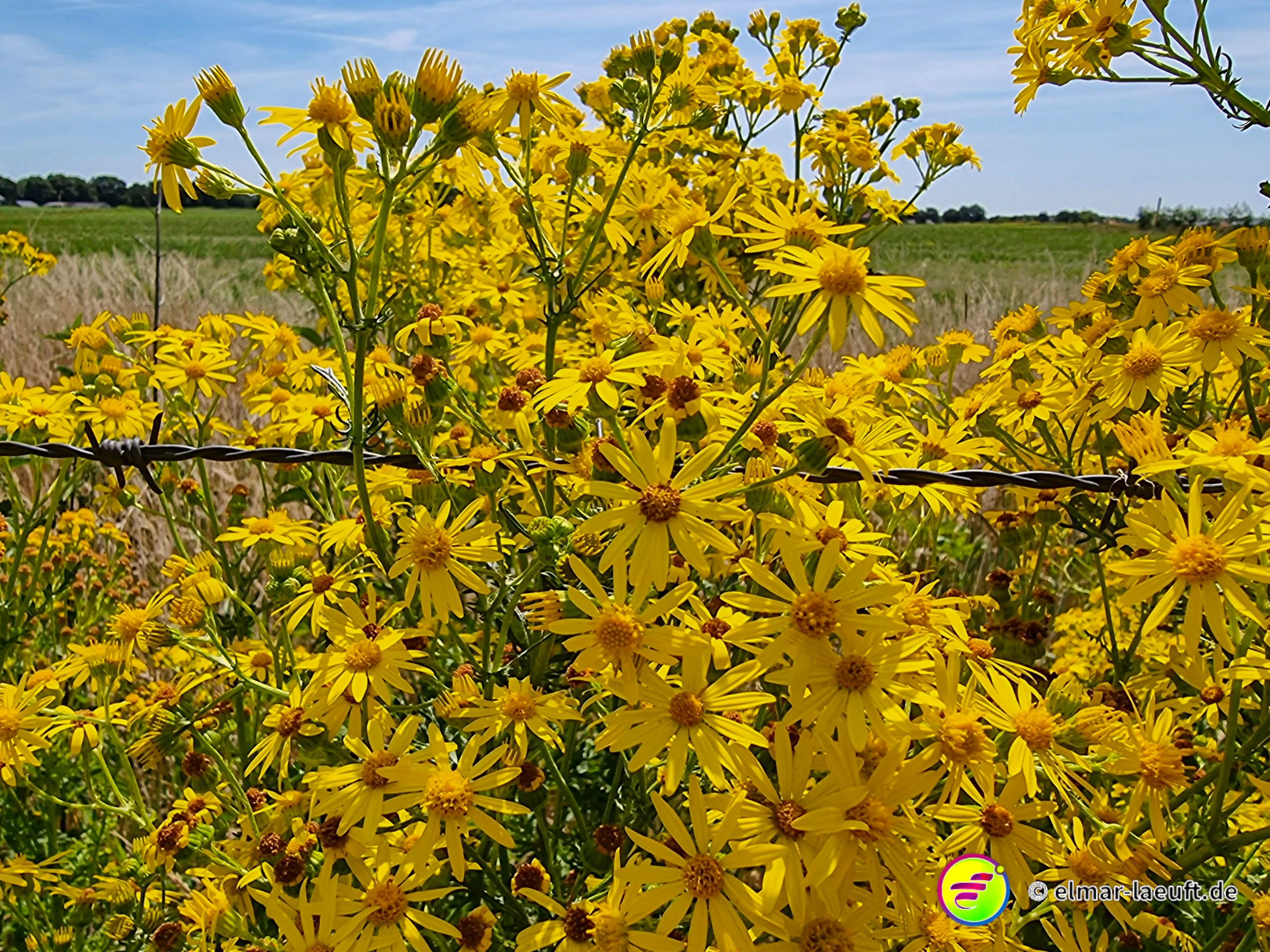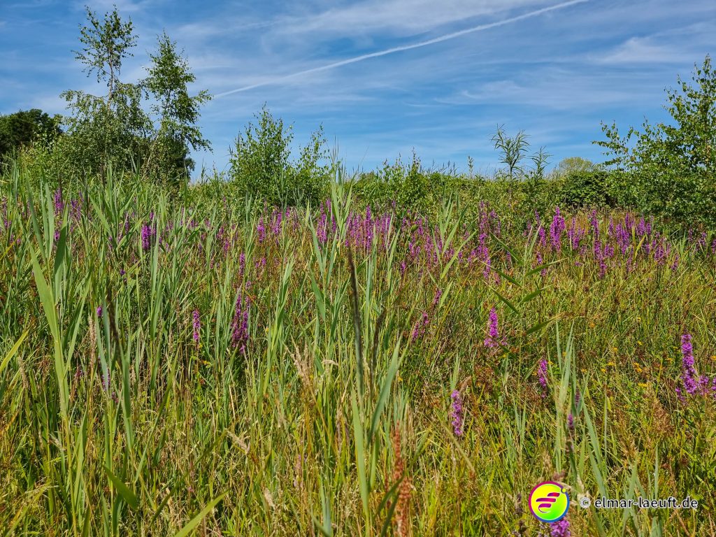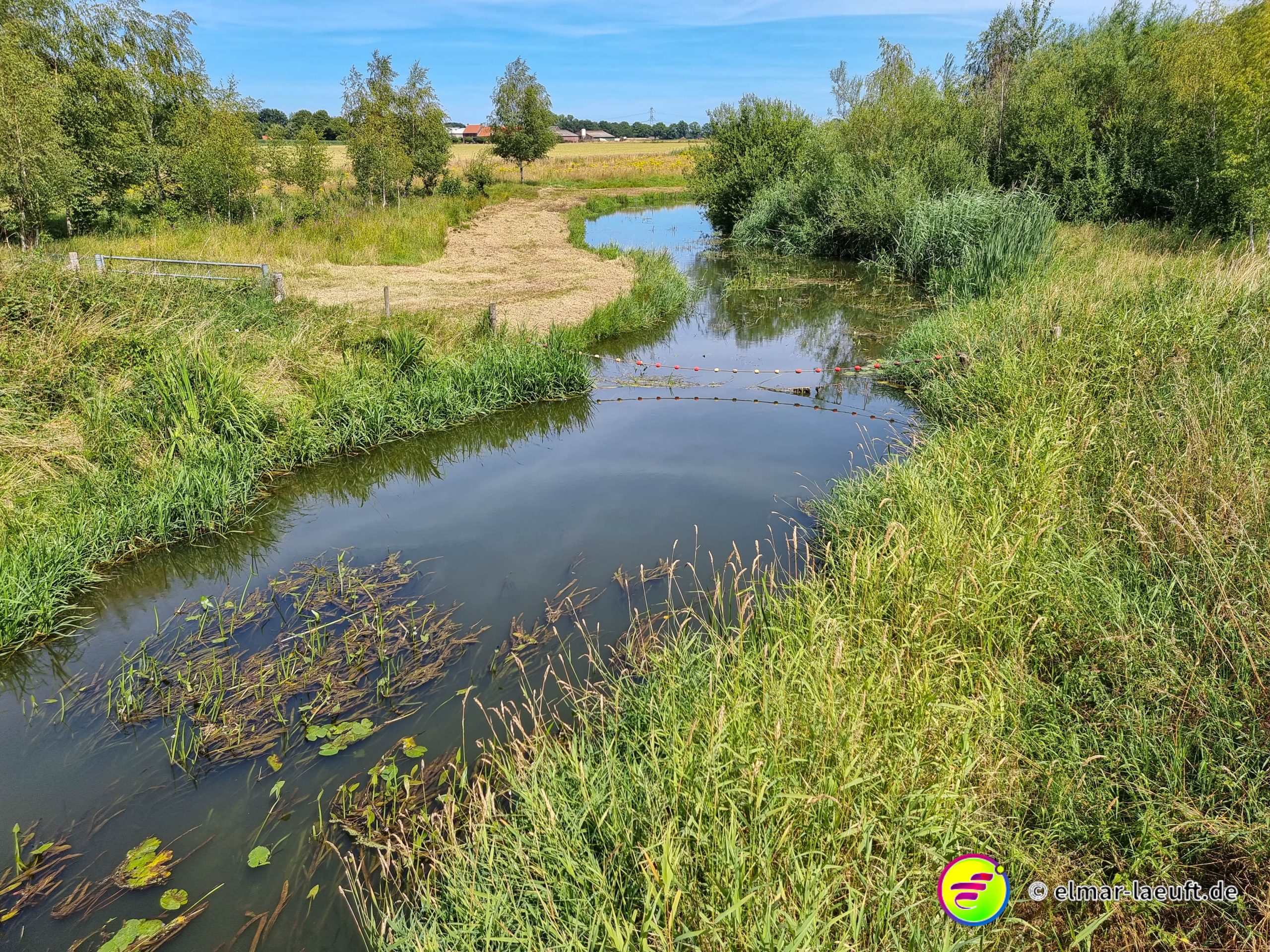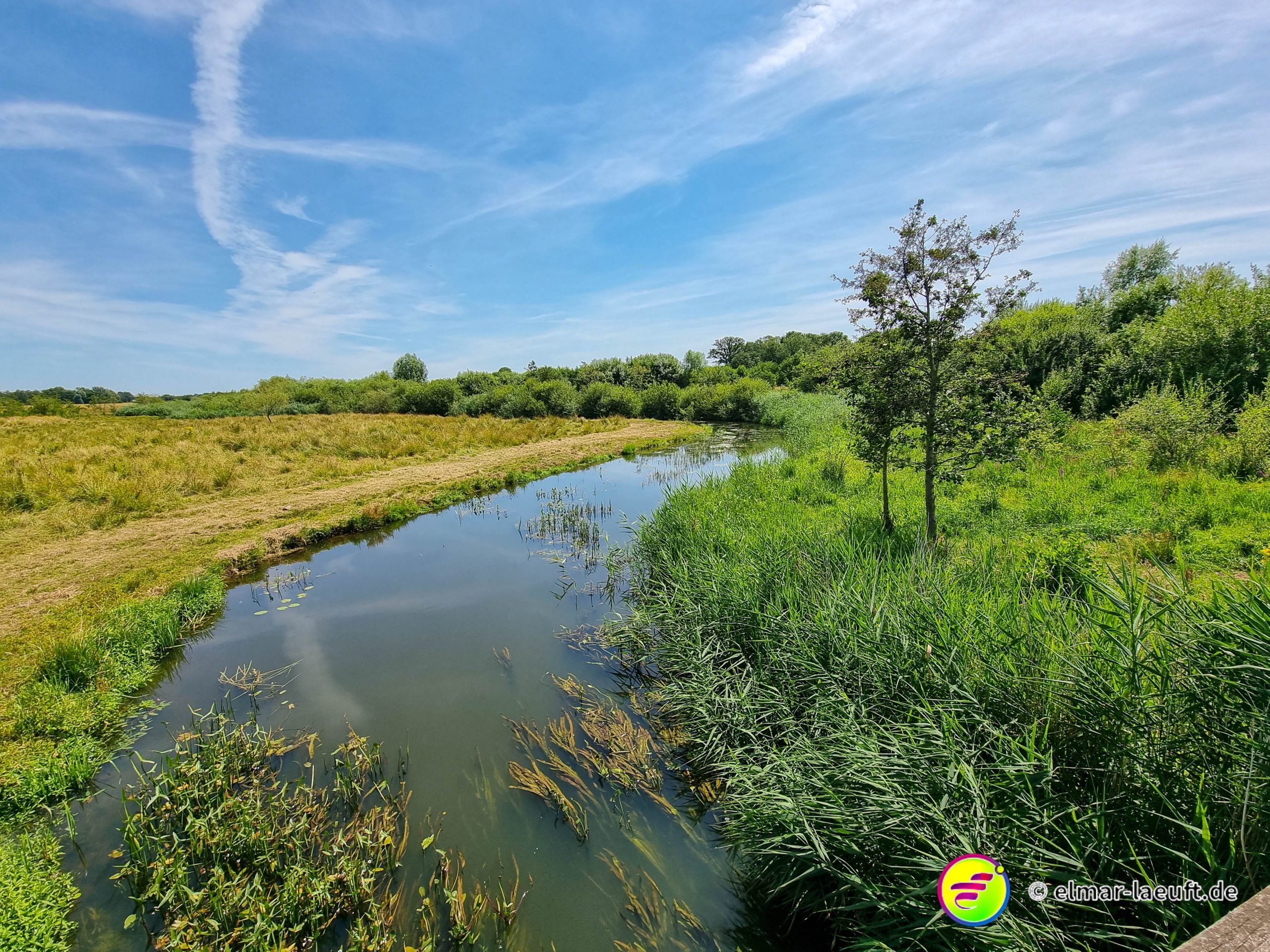 Das eigentliche Ziel meiner kleiner Rundreise heute ist dieser kleine Fluss, er hat in der Karte den Namen “Tungelroyse Beek”. Ich werde ihm eine ganze Weile folgen, bis ich wieder an meinen Ausgangspunkt zurückkehre. Das Ufer nebem dem Fluß ist spärlich gemäht, wahrscheinlich einmal im Frühjahr. Es ist nicht ganz trocken und beide Seiten sind geradezu überschwänglich grün. Die andere Seite ist dicht mit Schilf und hohen Gräsern bewachsen, meine Seite hat eine Unmenge an Blumen, wie man sie von Feldern als Blühstreifen kennt.