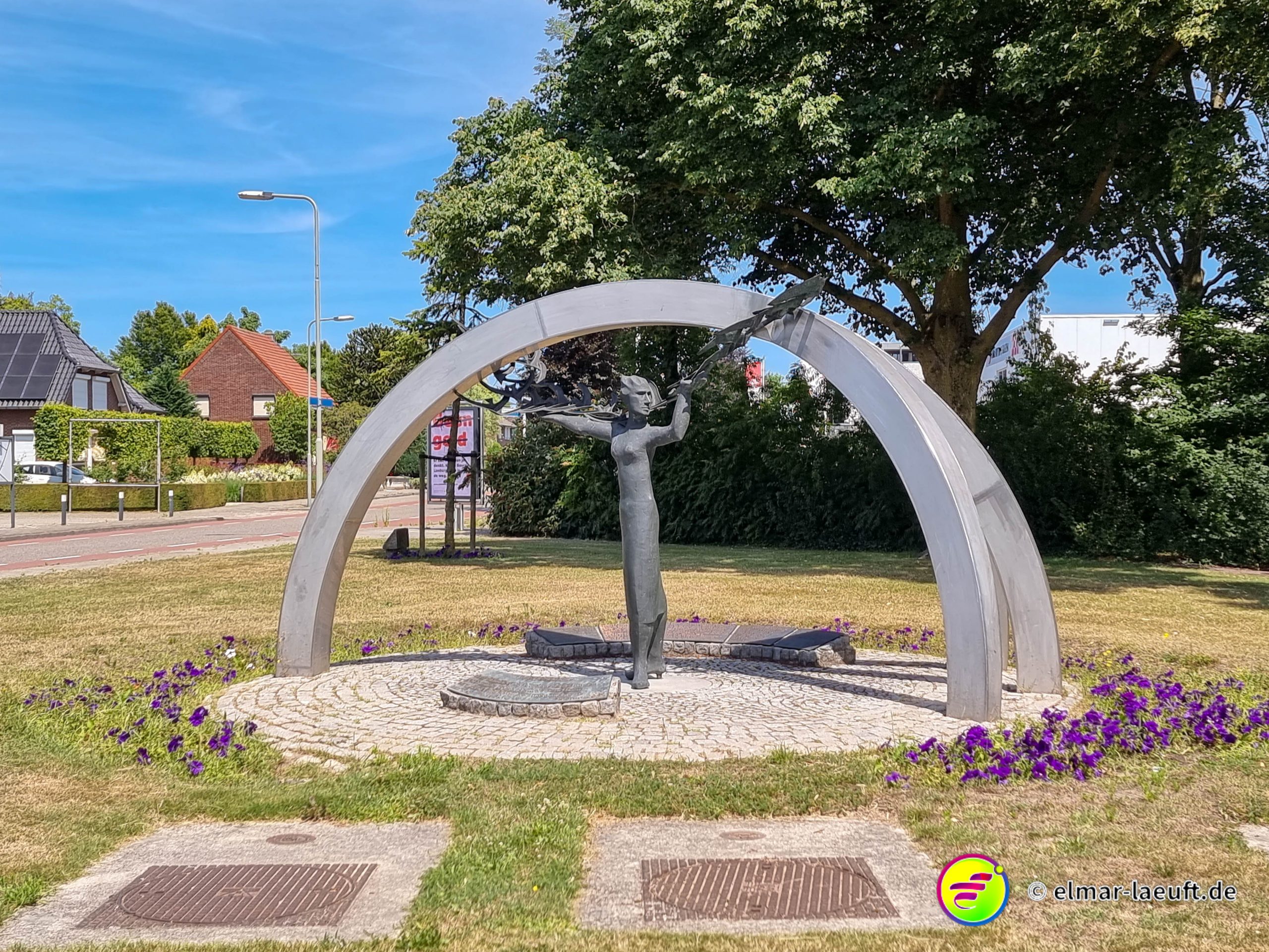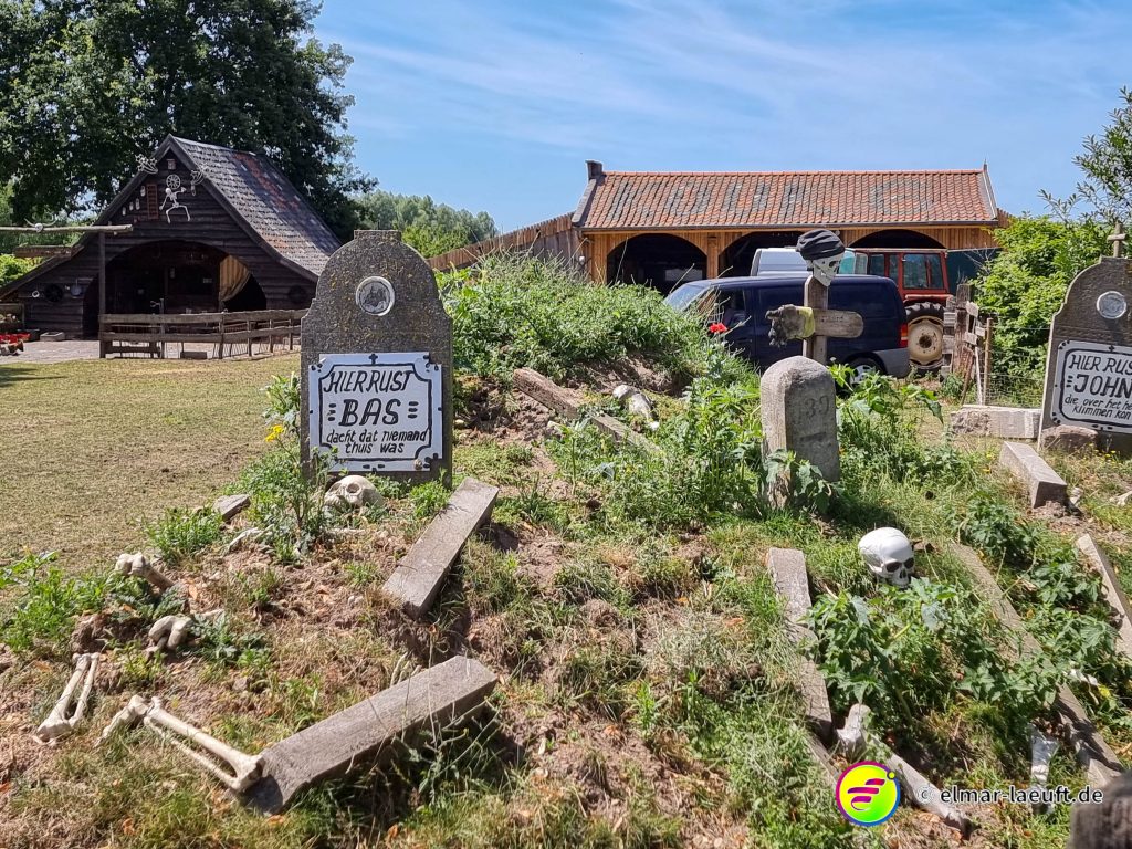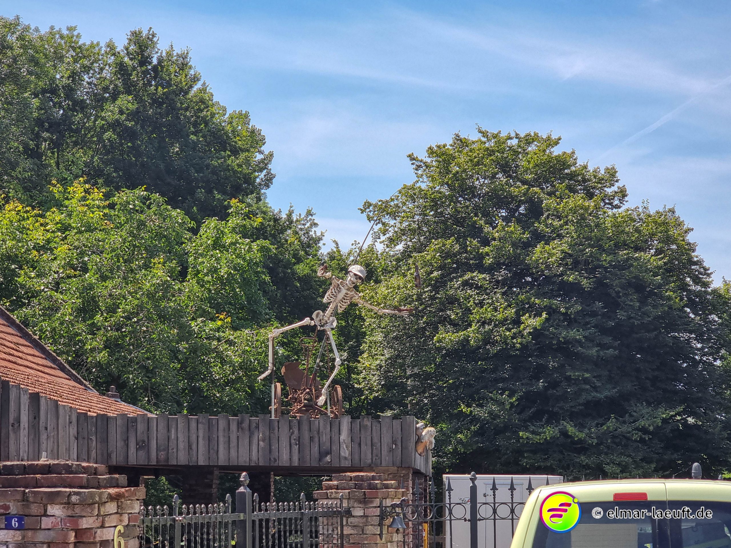Auf dem weiteren Weg streife ich den Ortsrand eines kleinen Dorfes, an dessen Rand ein wirklich skurilles Gebäude liegt. Am Tor wird man von einem an einer Angel hängenden Skelett mit Armemütze begrüßt. Daneben im Garten gibt es eine Art künstlich angelegter Grabhügel mit ein paar weiteren Knochenfunden. Das wäre nicht meine Art der Gartengestaltung, aber es war mindestens interessant.
