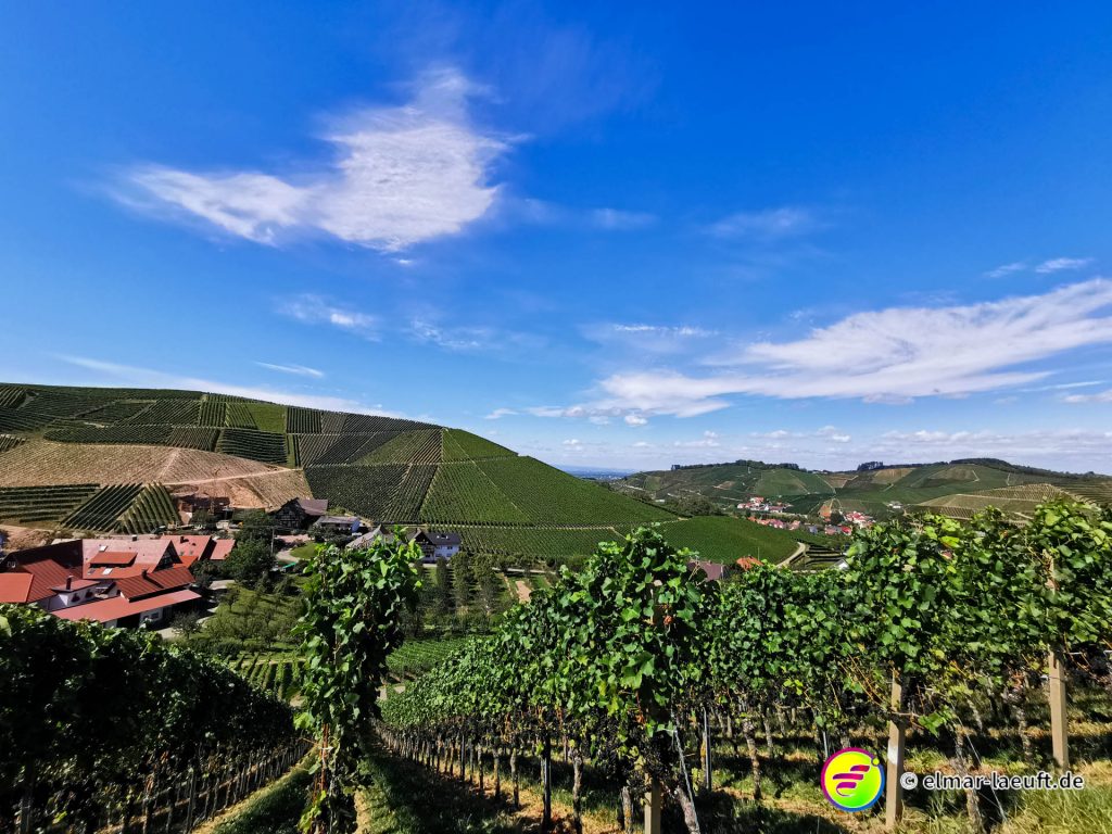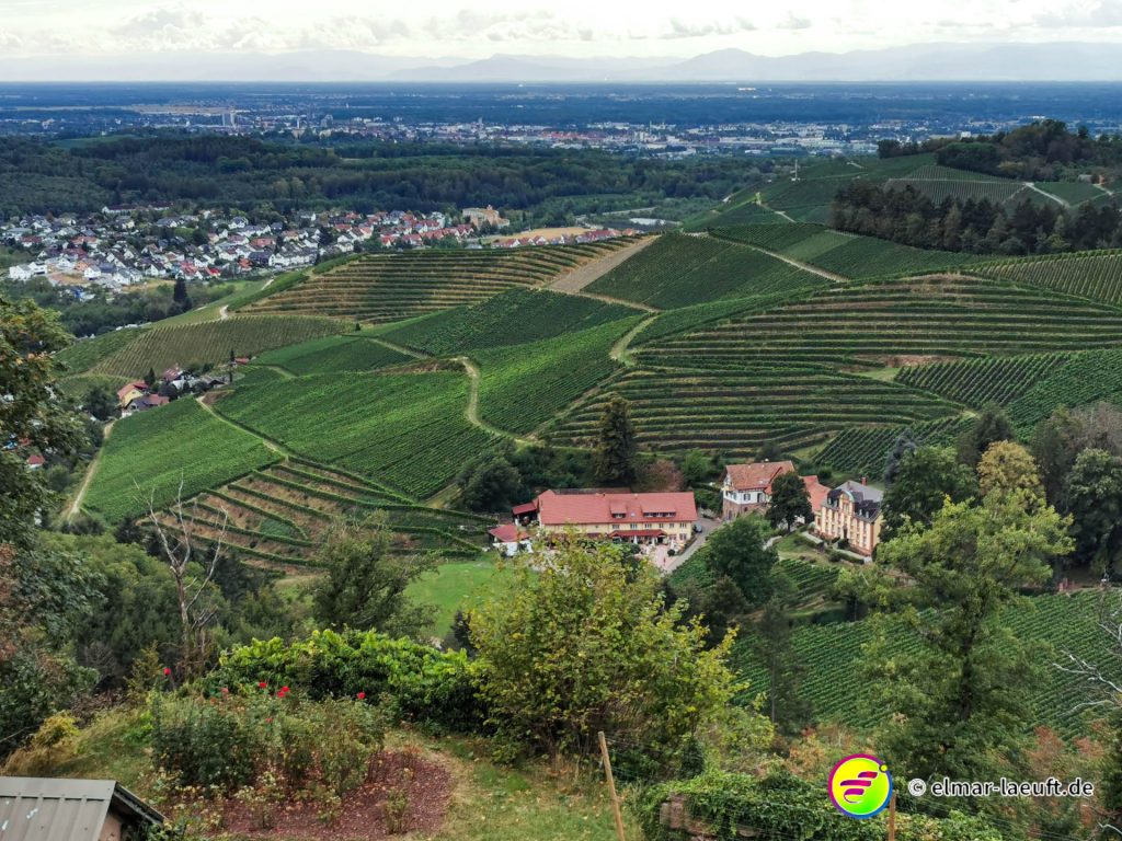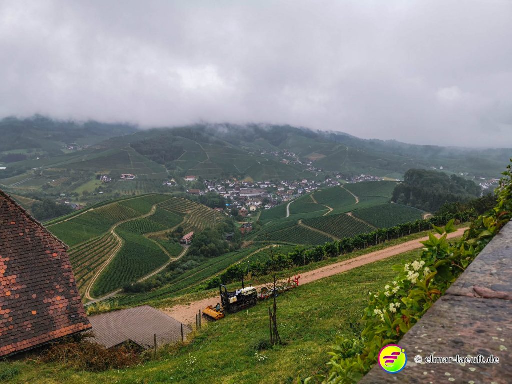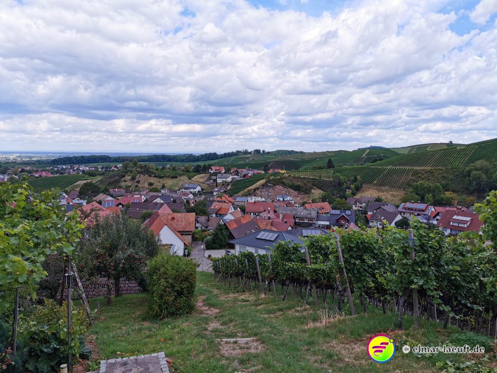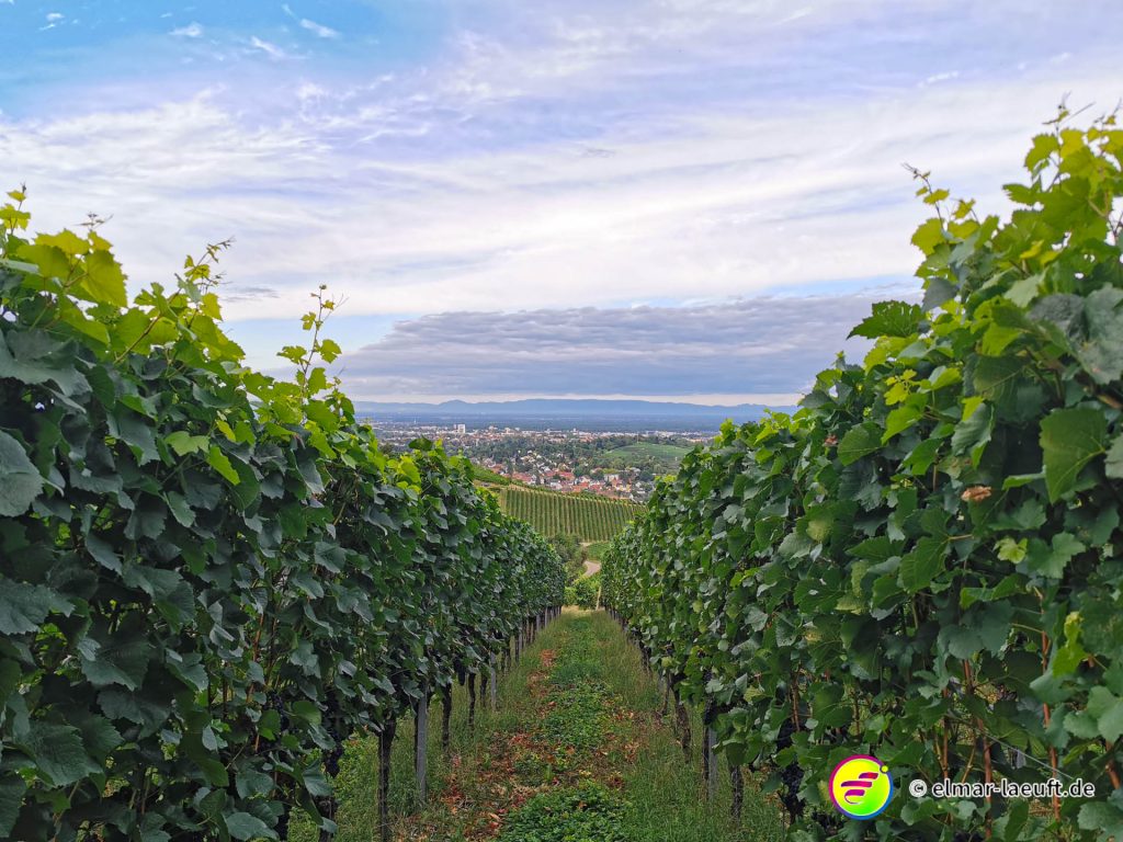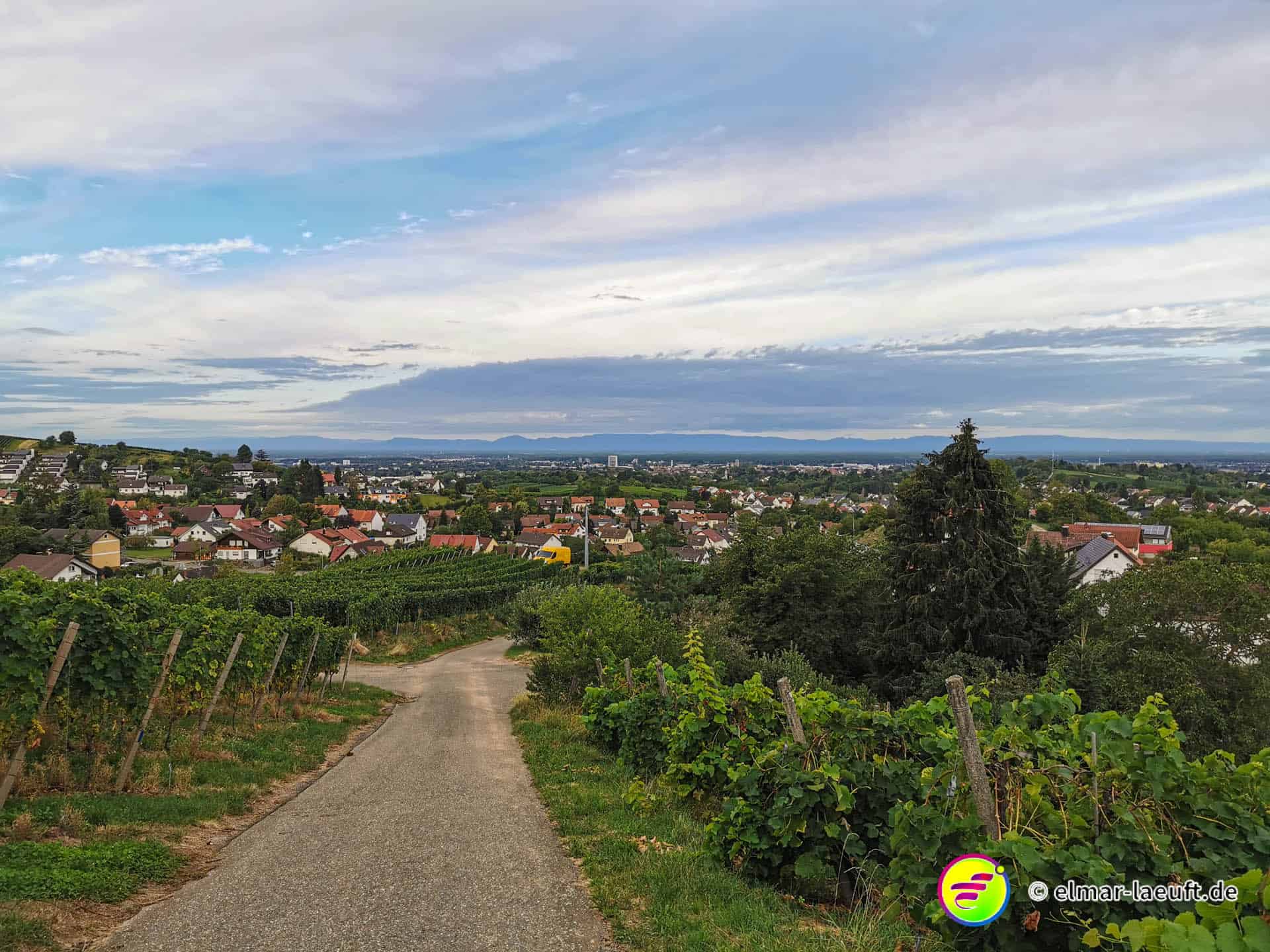 Die Sonne versteckt sich noch hinter dem Berg vor mir. Ich kenne mich hier noch nicht aus: links oder rechts entlang? Ok, dann links entlang – und bergauf. Die Straße ist ein Sackgasse, endet aber irgendwie nicht. Daher entscheide ich mich für einen kleinen halb zugewachsenen Weg in den Wald hinein. Dieser führt mich dann über Umwege an das wirkliche Ende der Straße. Ich steige behäbig den nächsten Weg hinauf, bis ich oberhalb der Weinberge einen tollen Ausblick auf die Orte vor mir bis nach Strasbourg habe. Ich bin aber noch nicht ganz oben, aber das lasse ich für einen anderen Tag übrig. Ich renne in einem Affenzahn fünfzehn Minuten lang nur bergab. Das ist wirklich toll. Mittlerweile lässt sich auch die Sonne blicken. Ein guter Start in den Tag.