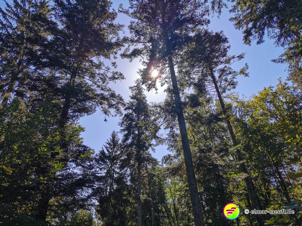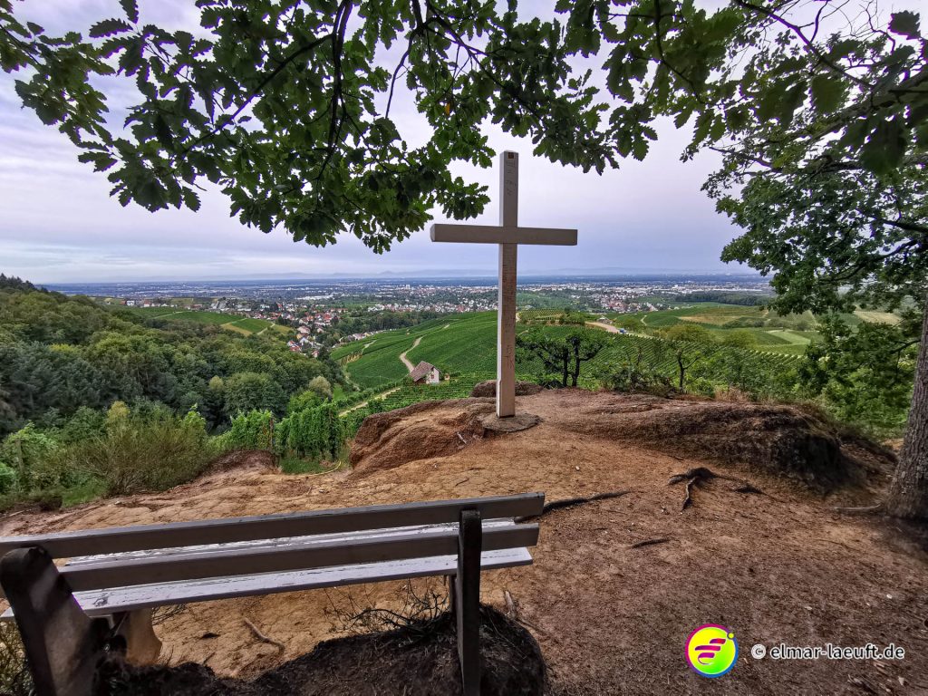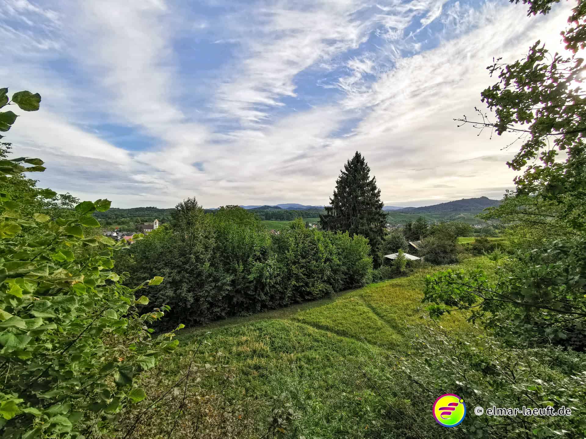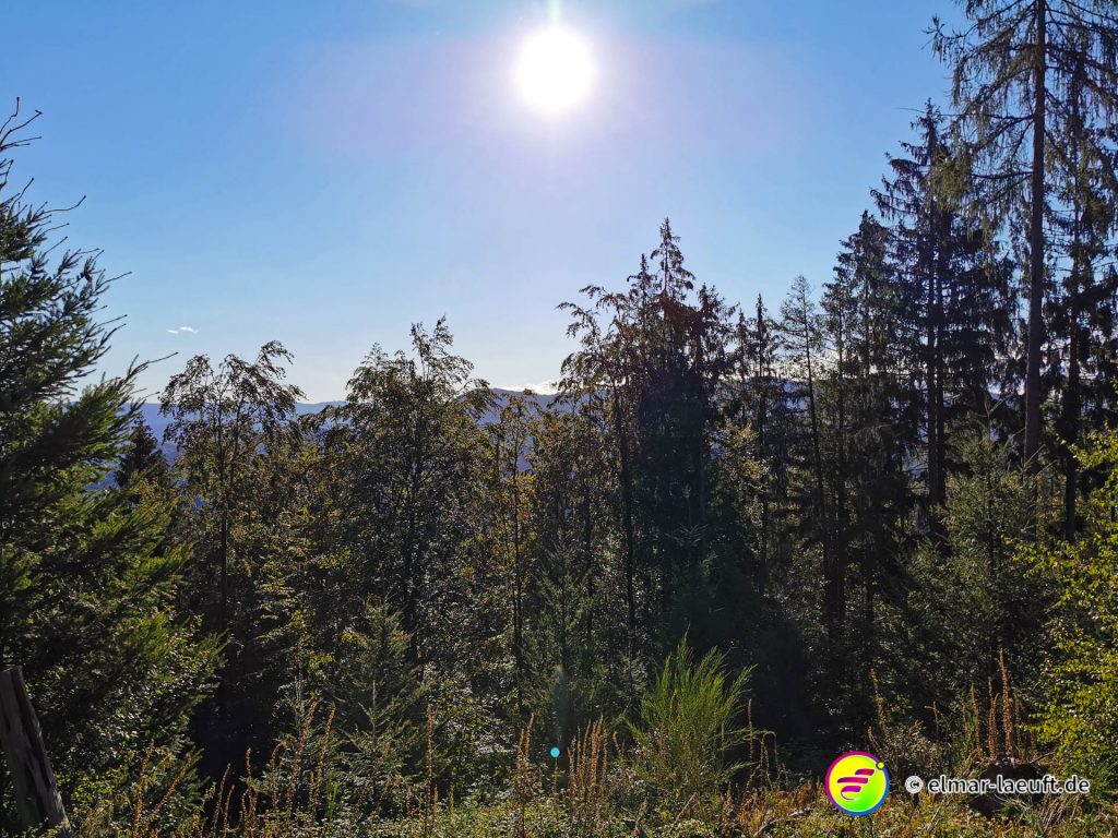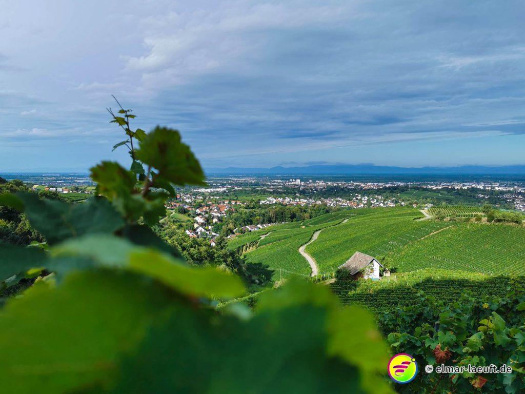 Die Sonne versteckt sich noch hinter dem Berg vor mir. Ich kenne mich hier noch nicht aus: links oder rechts entlang? Ok, dann links entlang – und bergauf. Die Straße ist ein Sackgasse, endet aber irgendwie nicht. Daher entscheide ich mich für einen kleinen halb zugewachsenen Weg in den Wald hinein. Dieser führt mich dann über Umwege an das wirkliche Ende der Straße. Ich steige behäbig den nächsten Weg hinauf, bis ich oberhalb der Weinberge einen tollen Ausblick auf die Orte vor mir bis nach Strasbourg habe. Ich bin aber noch nicht ganz oben, aber das lasse ich für einen anderen Tag übrig. Ich renne in einem Affenzahn fünfzehn Minuten lang nur bergab. Das ist wirklich toll. Mittlerweile lässt sich auch die Sonne blicken. Ein guter Start in den Tag.