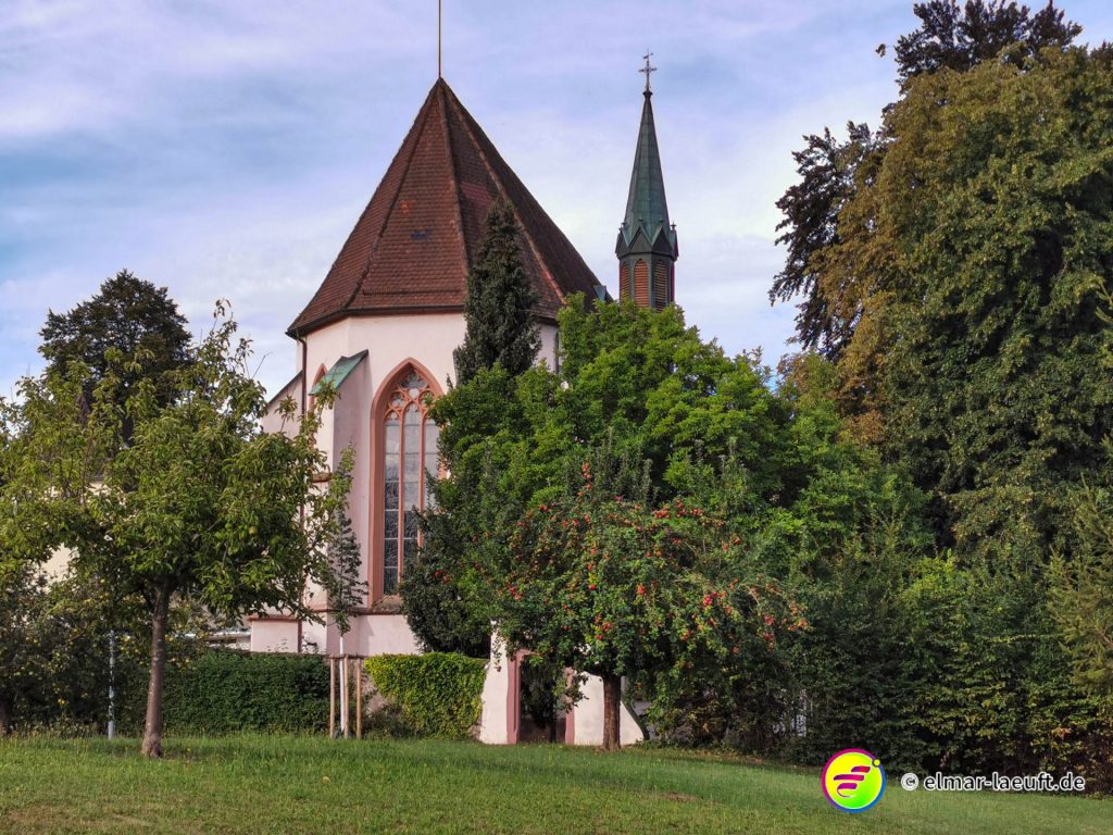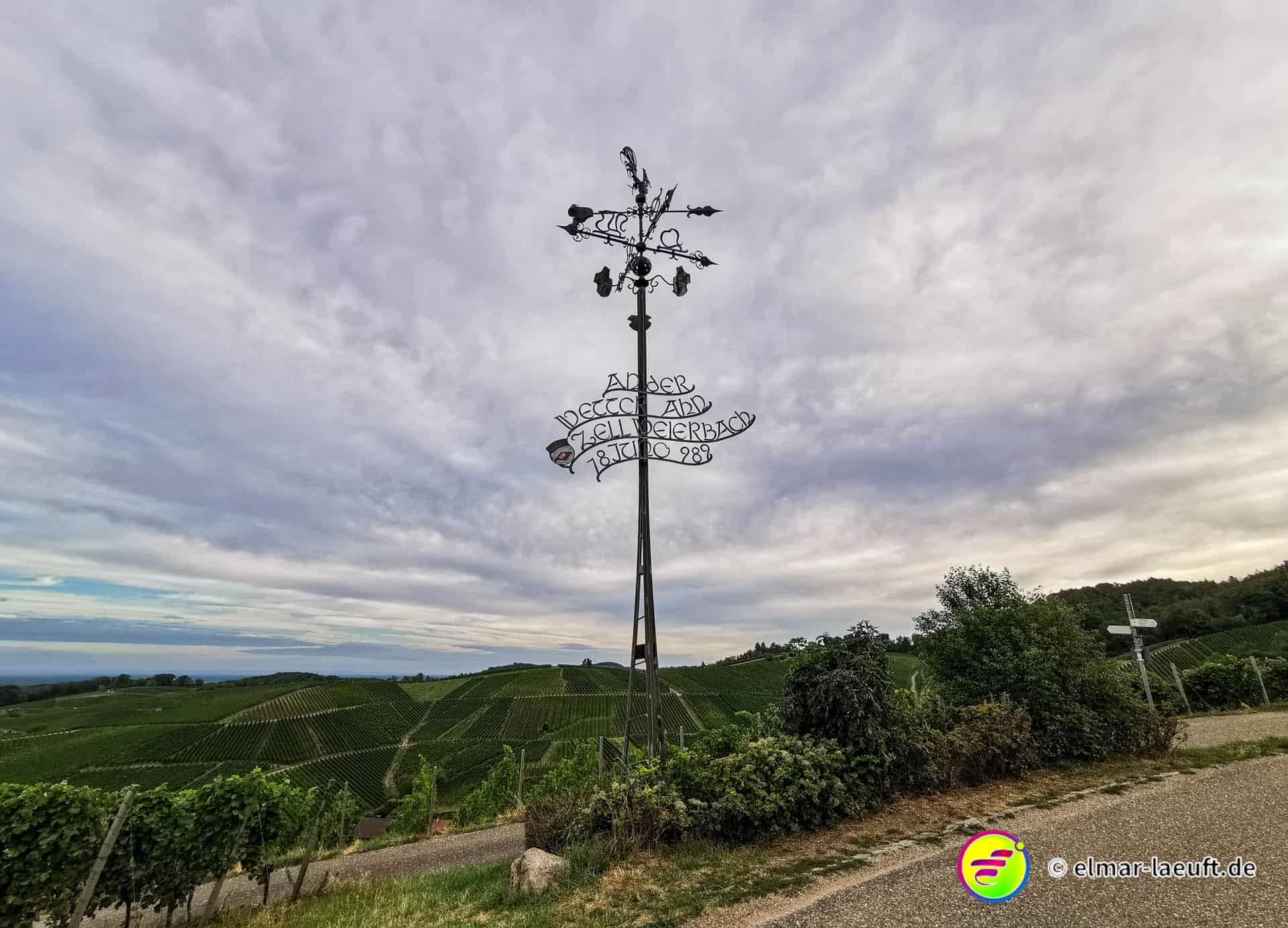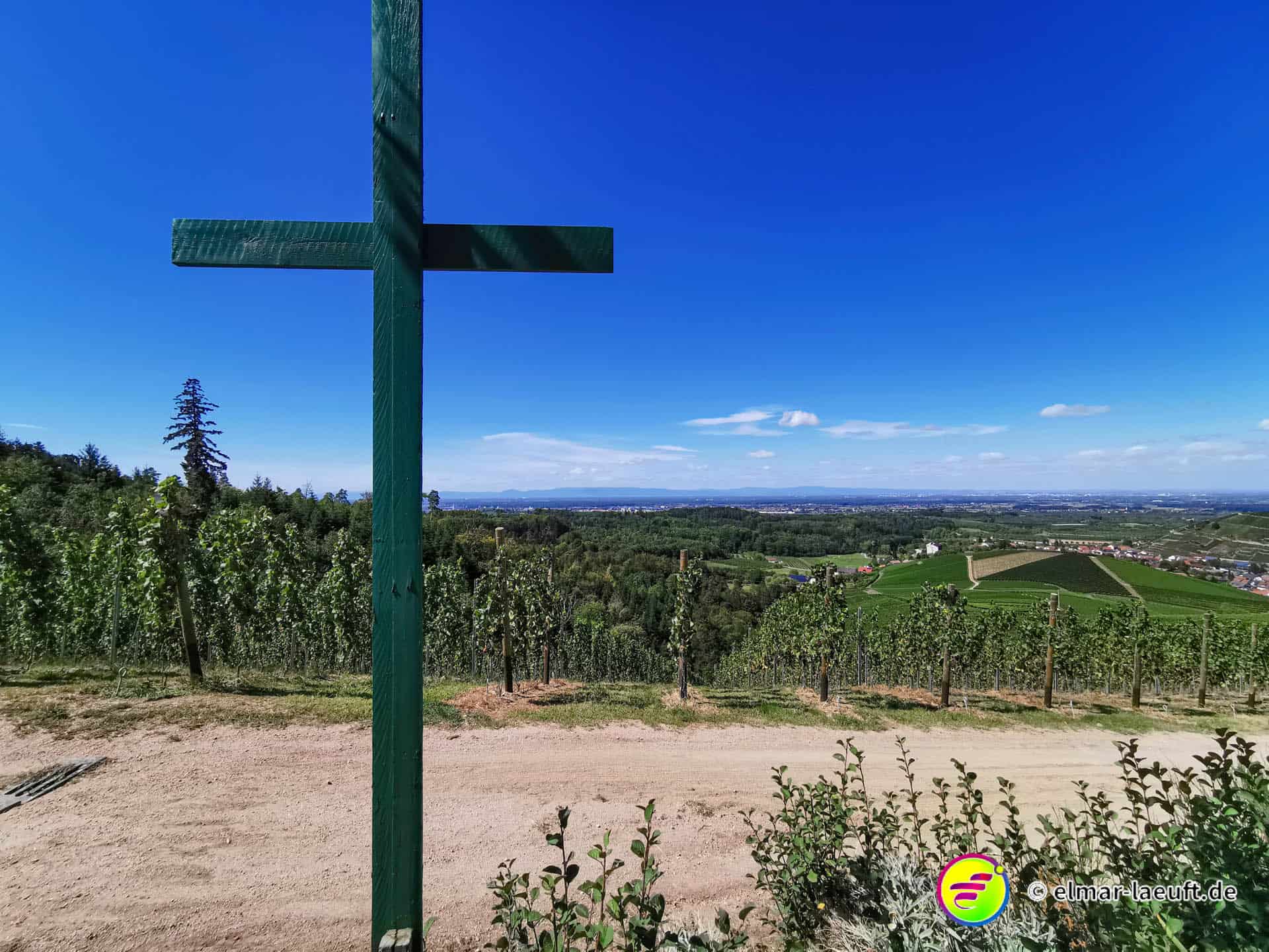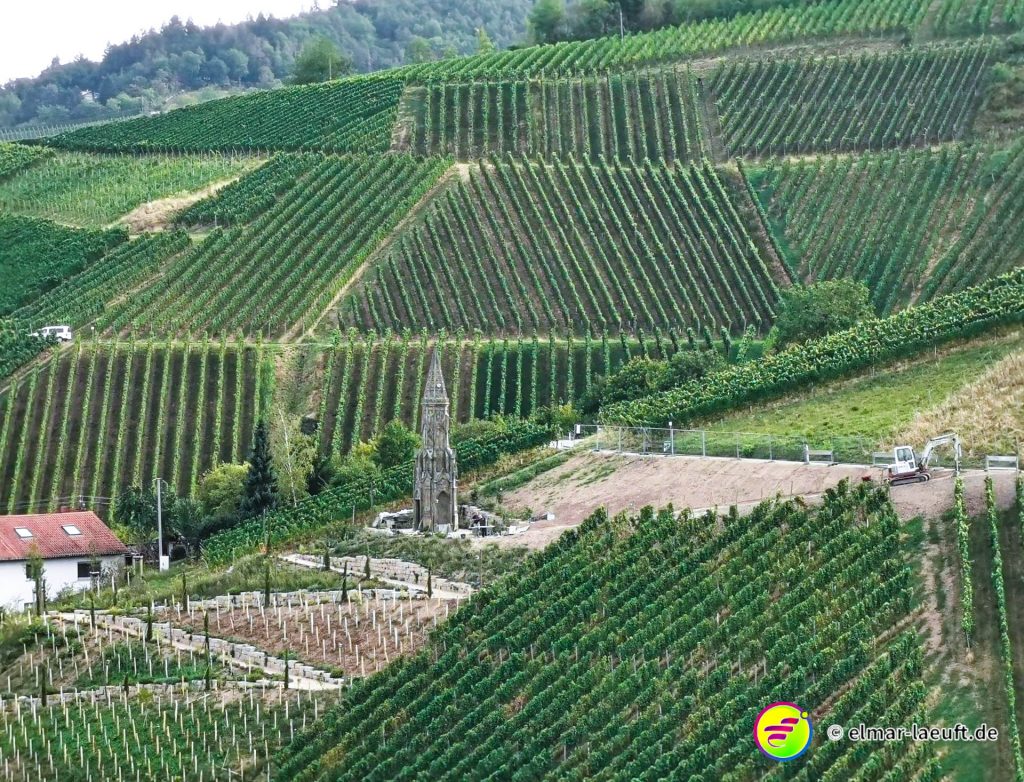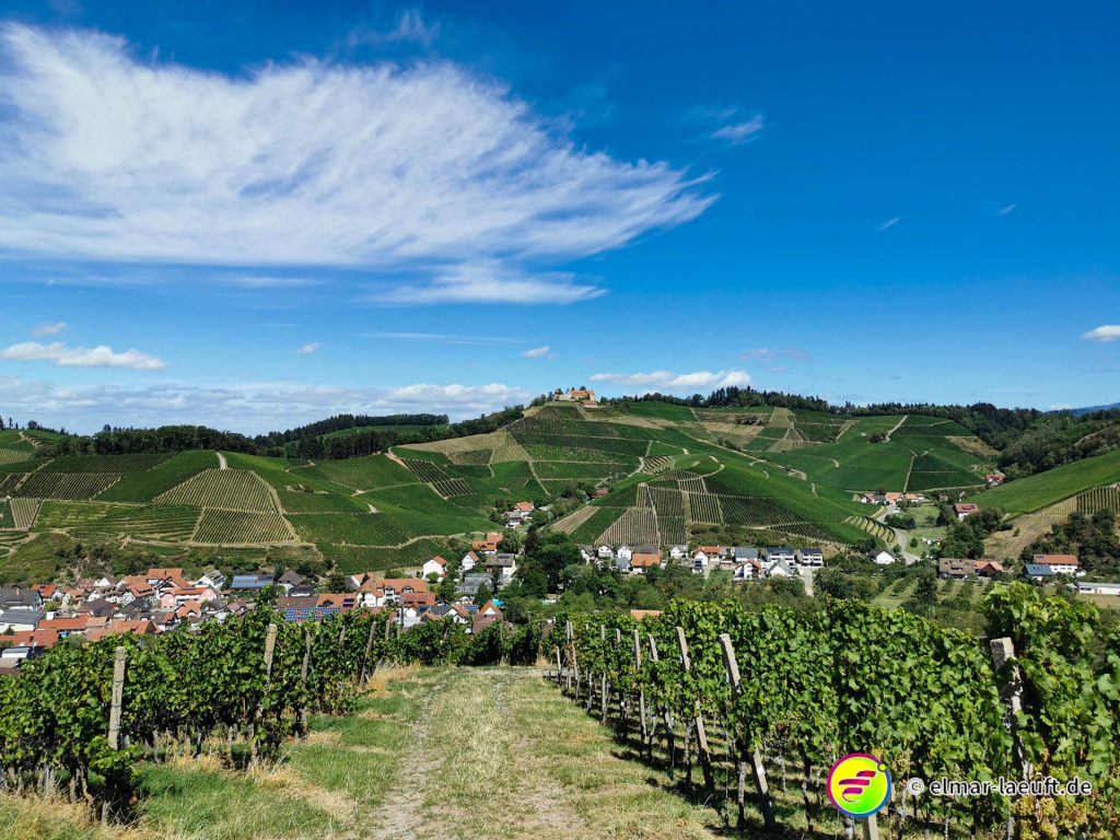 Die Sonne versteckt sich noch hinter dem Berg vor mir. Ich kenne mich hier noch nicht aus: links oder rechts entlang? Ok, dann links entlang – und bergauf. Die Straße ist ein Sackgasse, endet aber irgendwie nicht. Daher entscheide ich mich für einen kleinen halb zugewachsenen Weg in den Wald hinein. Dieser führt mich dann über Umwege an das wirkliche Ende der Straße. Ich steige behäbig den nächsten Weg hinauf, bis ich oberhalb der Weinberge einen tollen Ausblick auf die Orte vor mir bis nach Strasbourg habe. Ich bin aber noch nicht ganz oben, aber das lasse ich für einen anderen Tag übrig. Ich renne in einem Affenzahn fünfzehn Minuten lang nur bergab. Das ist wirklich toll. Mittlerweile lässt sich auch die Sonne blicken. Ein guter Start in den Tag.