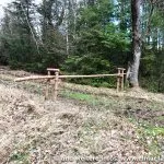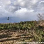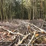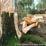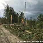 Alle Bäume auf einer großen Fläche sind ab zwei oder drei Metern Höhe einfach abgebrochen. Alle Baumreste sind bereits ordentlich zersägt und gestapelt, aber der Blick auf dieses Feld aus Baumstümpfen ist gruselig.