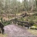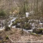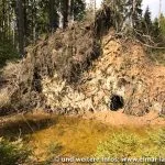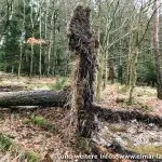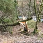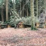Unten an der Kalltallsperre treffe ich auf ein Schild “Sturmschaden – Vorsicht”. Das klingt nach mehr als ein paar verstreuten Ästen im Wald. Bald stehe ich vor einer großer Tanne, die querliegend den Weg versperrt. Hier geht es los. Ich folge einer Weile dem Kelzer Bach und gelange in ein kargeres Waldgebiet. Dass der Wald hier nicht so dicht ist, hat offenbar verheerende Folgen. Ich passiere einige Stellen am Waldrand, an denen der Sturm eine lange Schneise geschlagen hat und die Bäume mit dem Bierdeckel-Teller liegen umgefallen wie Dominosteine in einer langen Reihe. Im weiteren Verlauf wird es noch schlimmer. Ganze Areale zeigen nur noch abgenickte Zahnstocher.