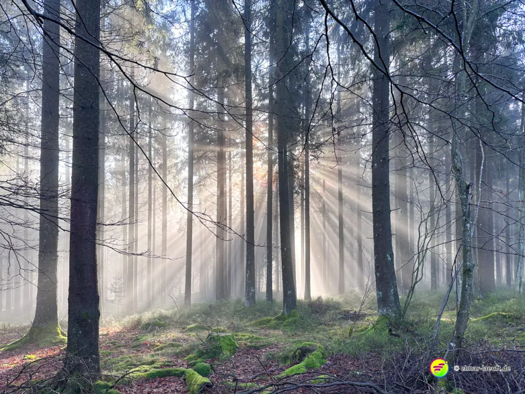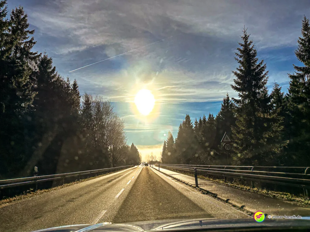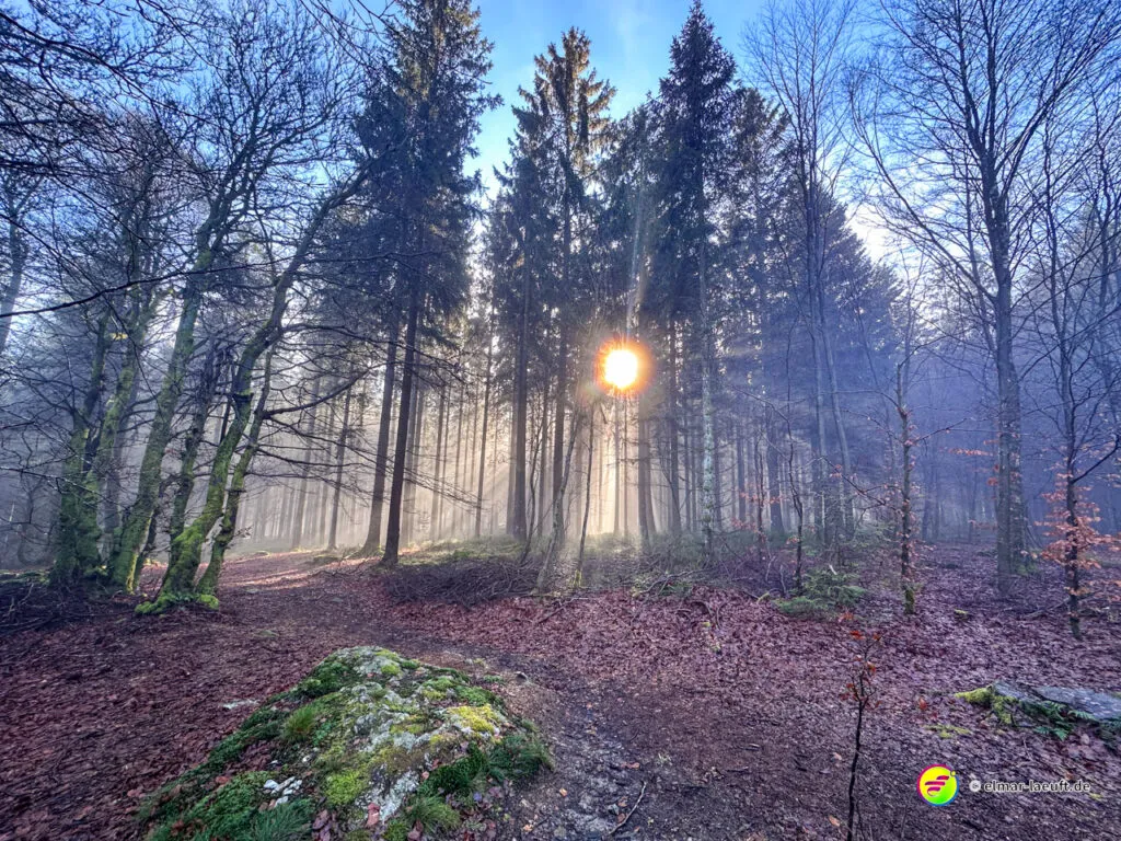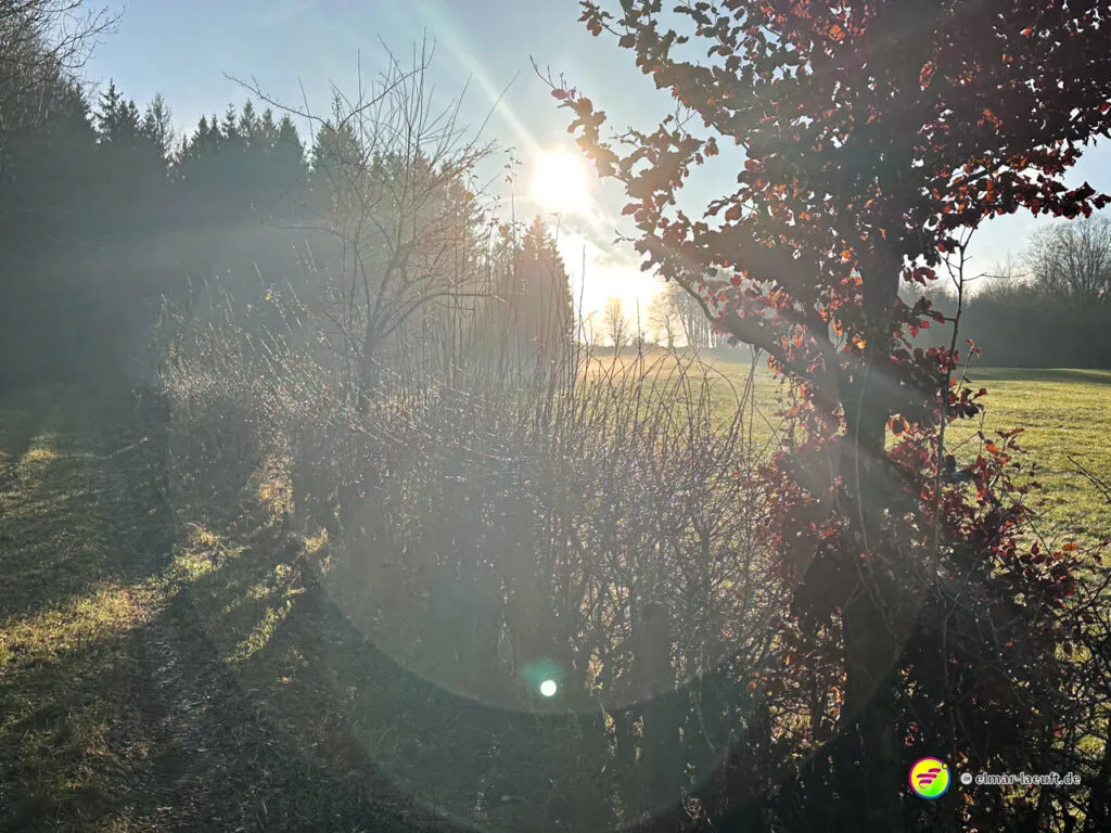 Unglaublich! Welche Bilder die niedrigstehende Sonne auf die Landschaft zaubert, wenn die Strahlen die Bäume durchdringen und lange Schatten in die Landschaft werfen. Ein Feuerball am Horizont durchdringt die gerade noch nebelige Landschaft und löst die dunstigen Wolkenmassen in kleine Rauchschwaden auf, die in den langsam sichtbaren, stahlblauen Himmel hinauf steigen.