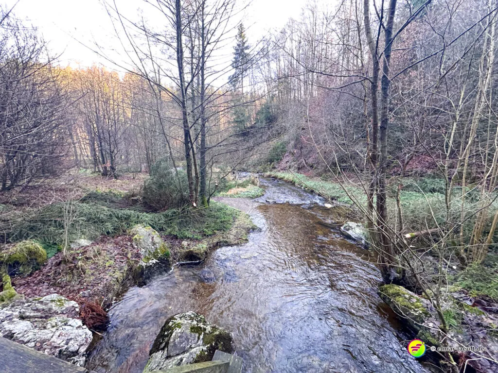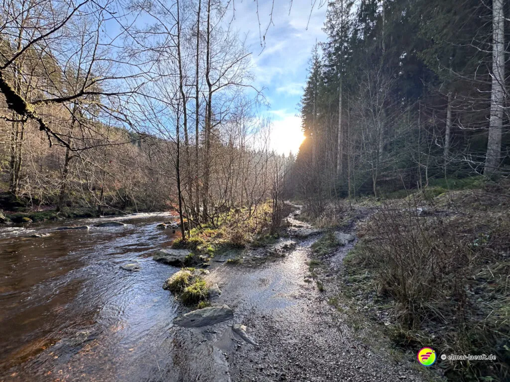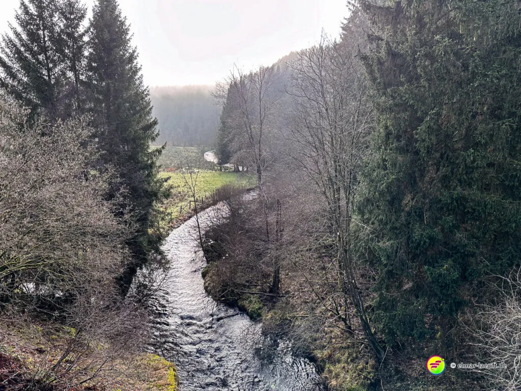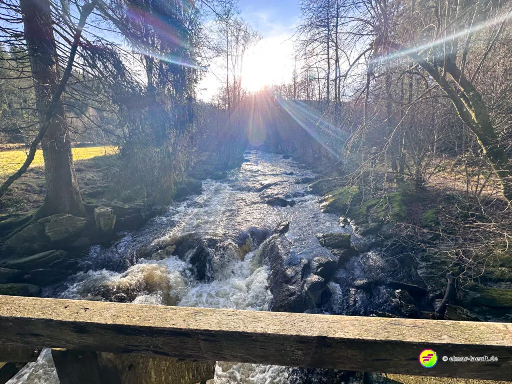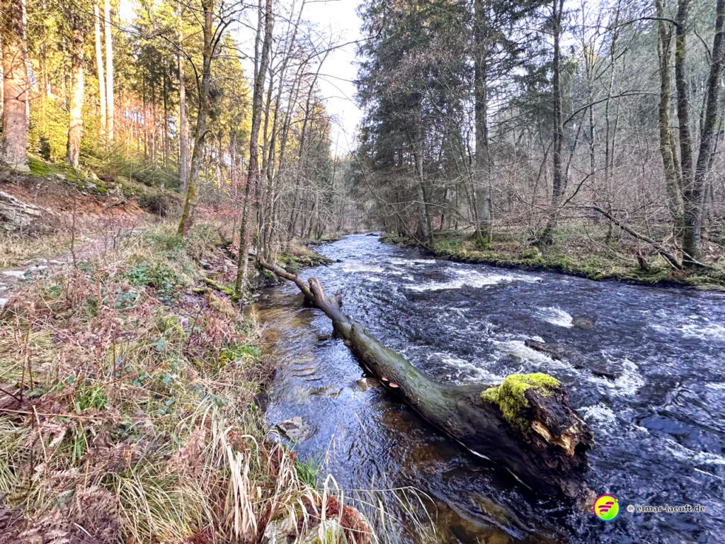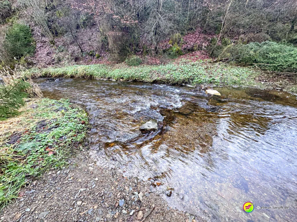 Vorbei am Klosten Reichenstein ist es nicht weit bis zur Rur. Ein wunderschöner Trail mit Steinen, Wurzeln, klarem Wasser und einer sich hinter den kahlen Bäumen versteckenden Sonne, die ab und zu durch die Äste blinzelt, leitet mich einige Kilometer lang durch die Eifeler Landschaft. Ein Abzweig meines Weges geht noch steiler bergan.