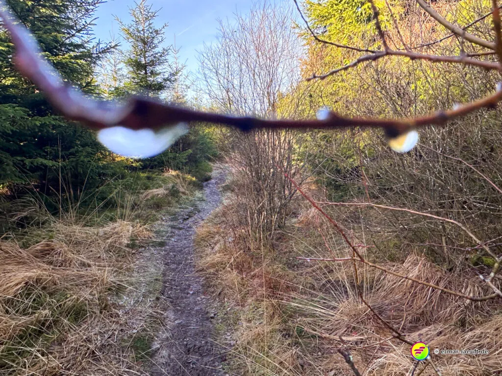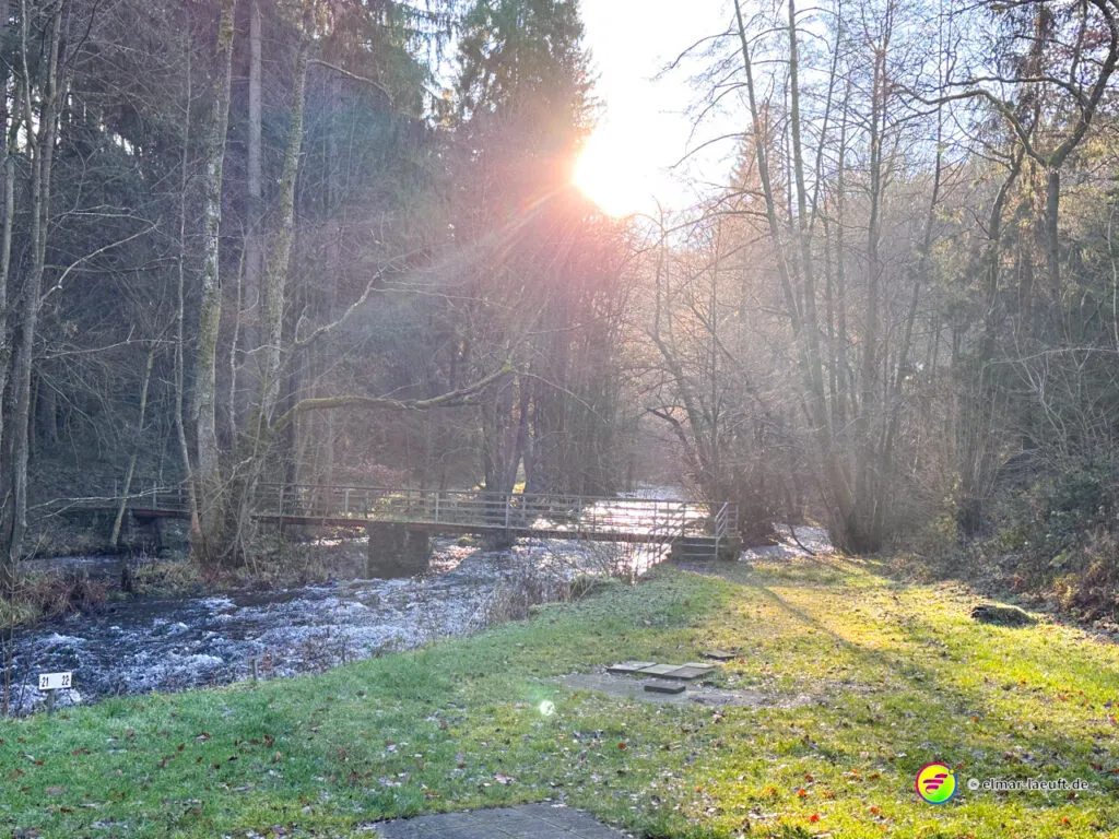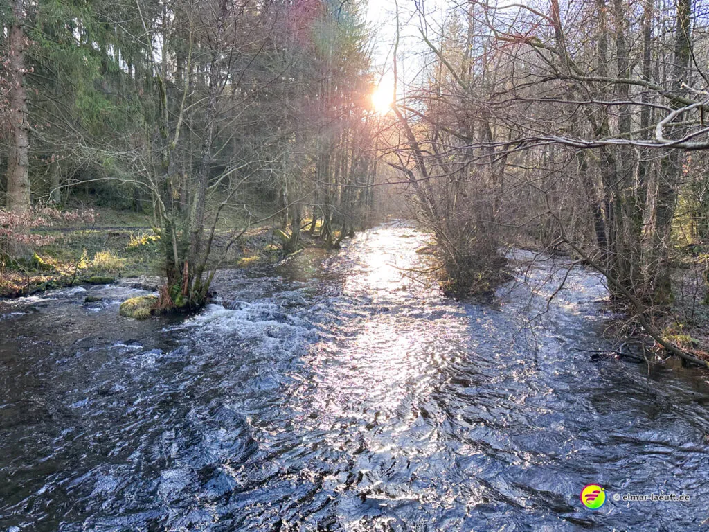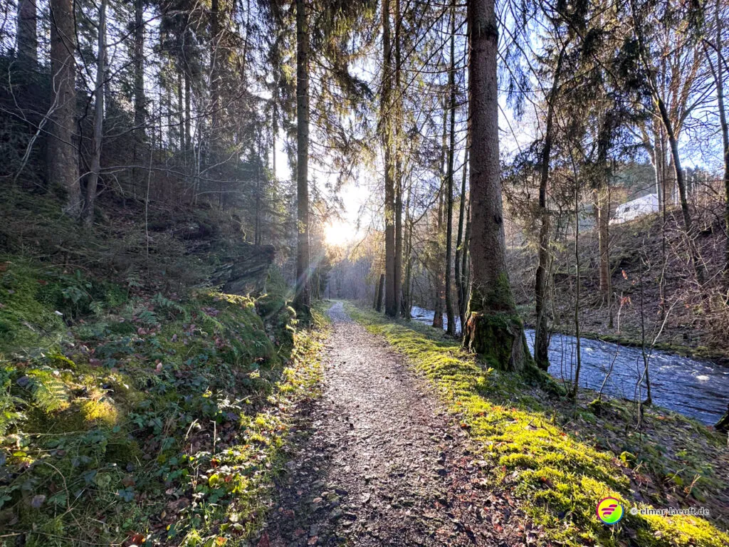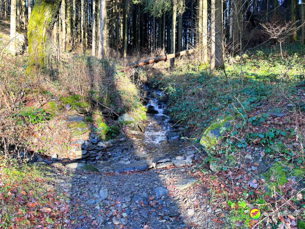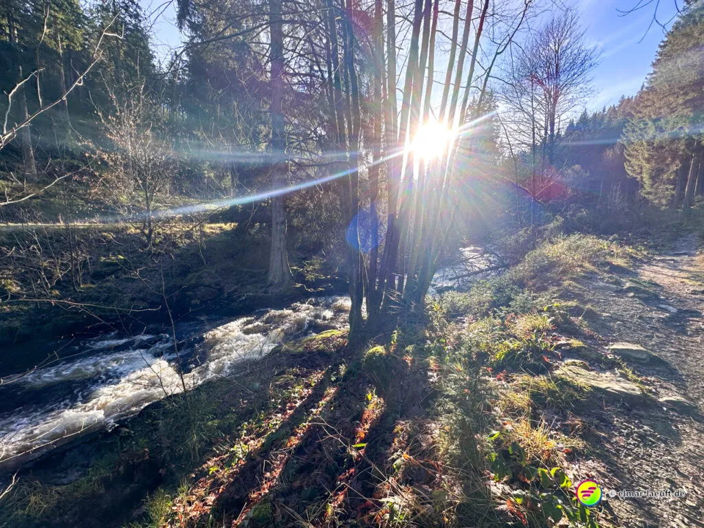 Vorbei am Klosten Reichenstein ist es nicht weit bis zur Rur. Ein wunderschöner Trail mit Steinen, Wurzeln, klarem Wasser und einer sich hinter den kahlen Bäumen versteckenden Sonne, die ab und zu durch die Äste blinzelt, leitet mich einige Kilometer lang durch die Eifeler Landschaft. Ein Abzweig meines Weges geht noch steiler bergan.