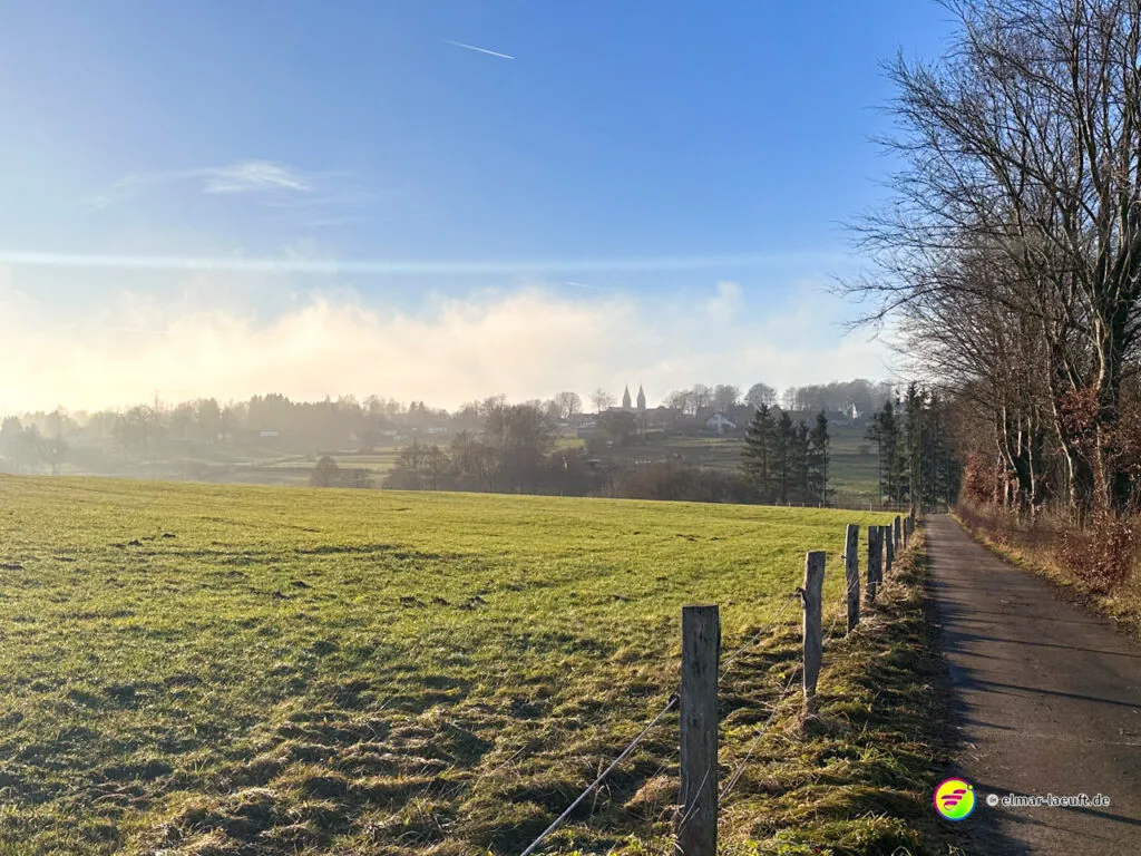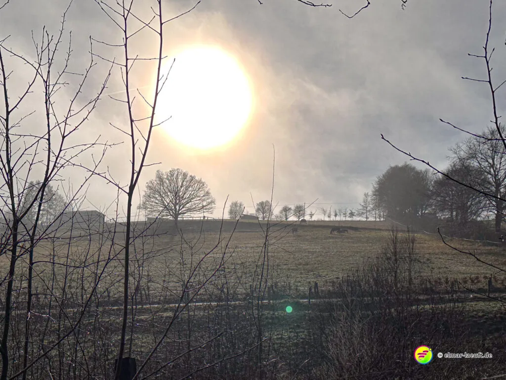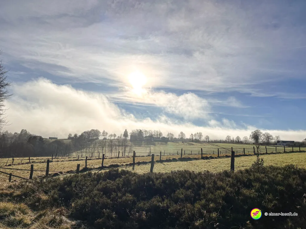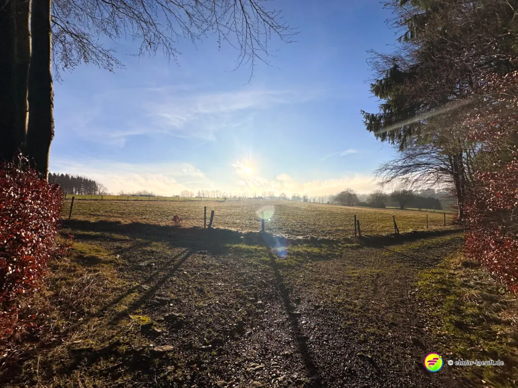 Direkt an der belgischen Grenze begleitet mich ein noch trübes Wetter auf einen Abschnitt des Vennbahnwegs. Nach einem kurzen Stück festen Weges biege ich ab in ein Waldstück bergauf. Auf einer höher gelegenen Wiese kann ich verfolgen, wie die Sonne mit gewaltiger Kraft die Wolken auflöst.