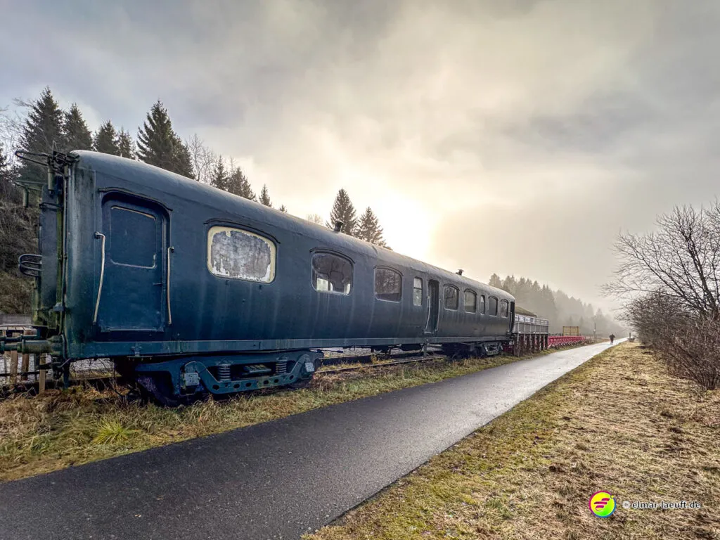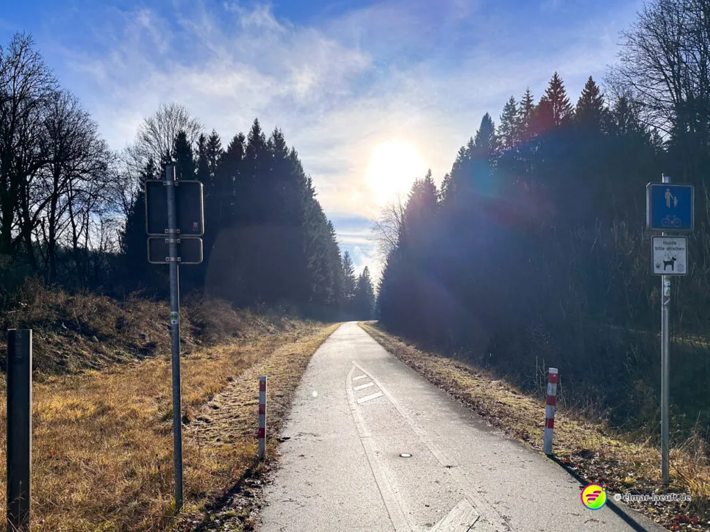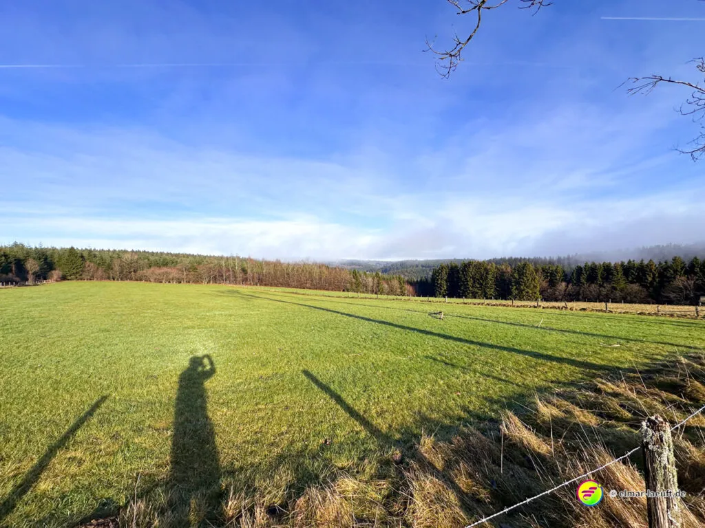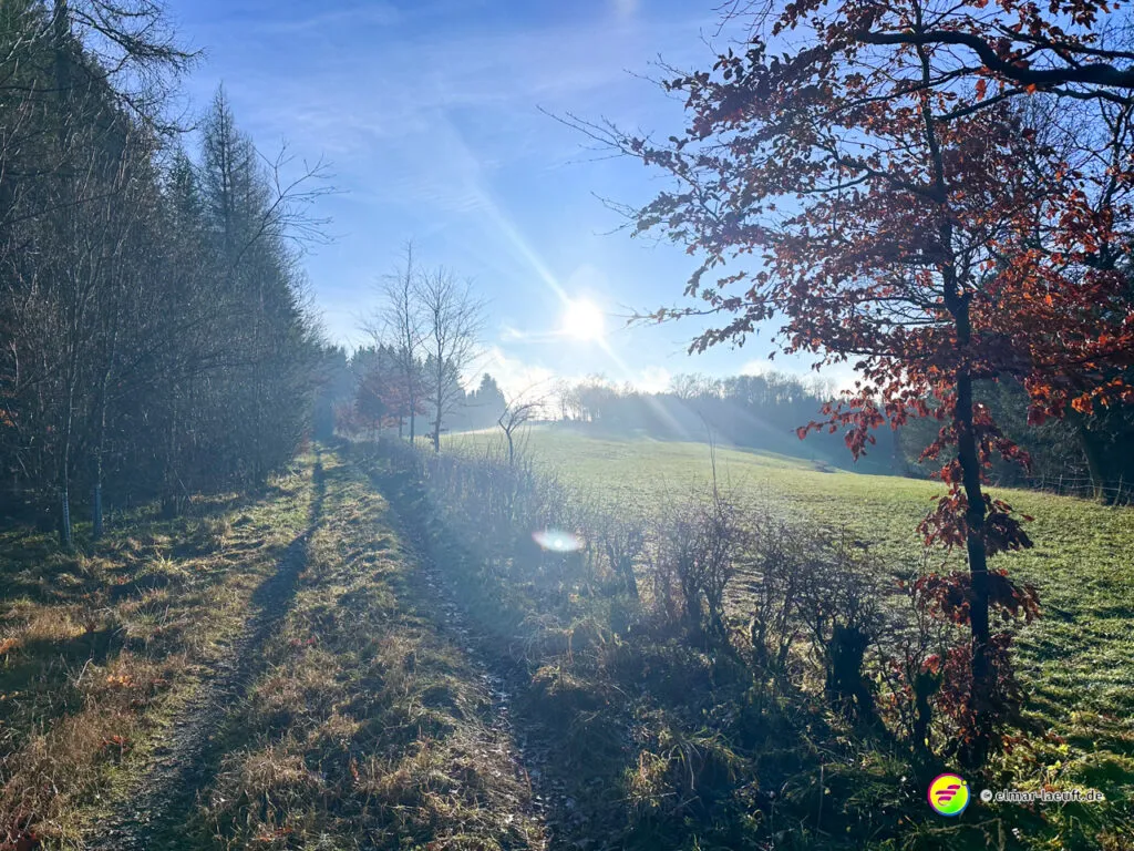 Direkt an der belgischen Grenze begleitet mich ein noch trübes Wetter auf einen Abschnitt des Vennbahnwegs. Nach einem kurzen Stück festen Weges biege ich ab in ein Waldstück bergauf. Auf einer höher gelegenen Wiese kann ich verfolgen, wie die Sonne mit gewaltiger Kraft die Wolken auflöst.