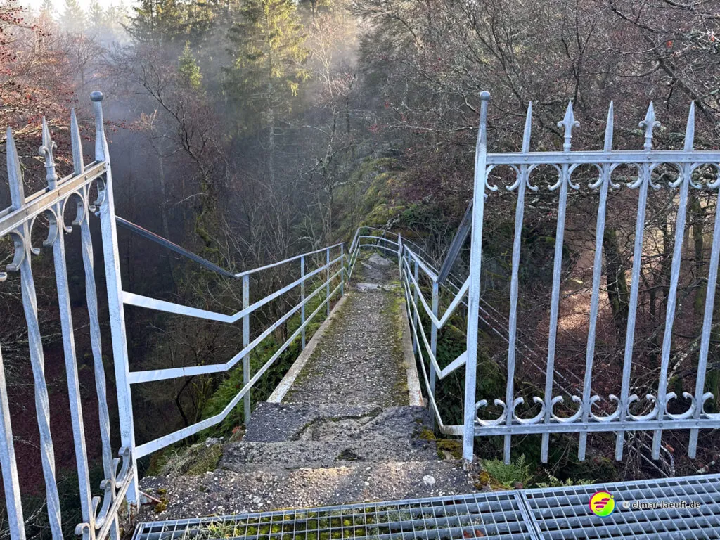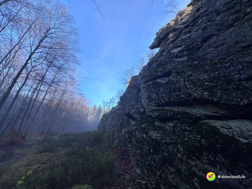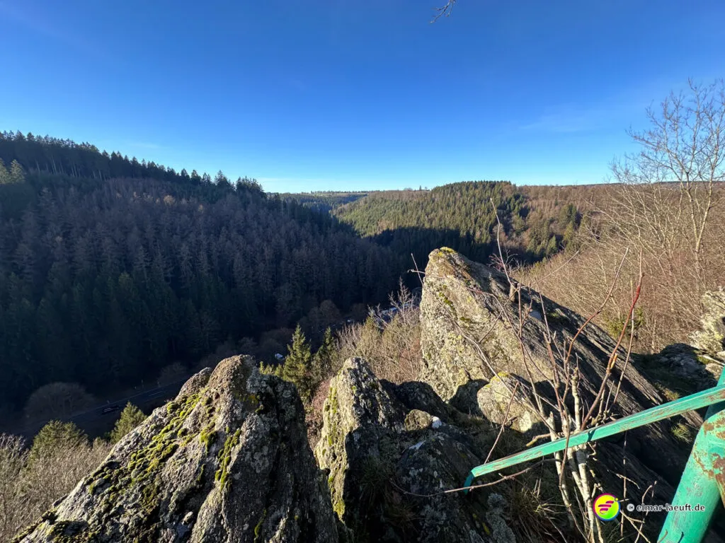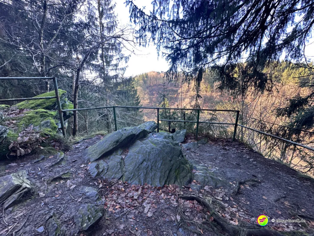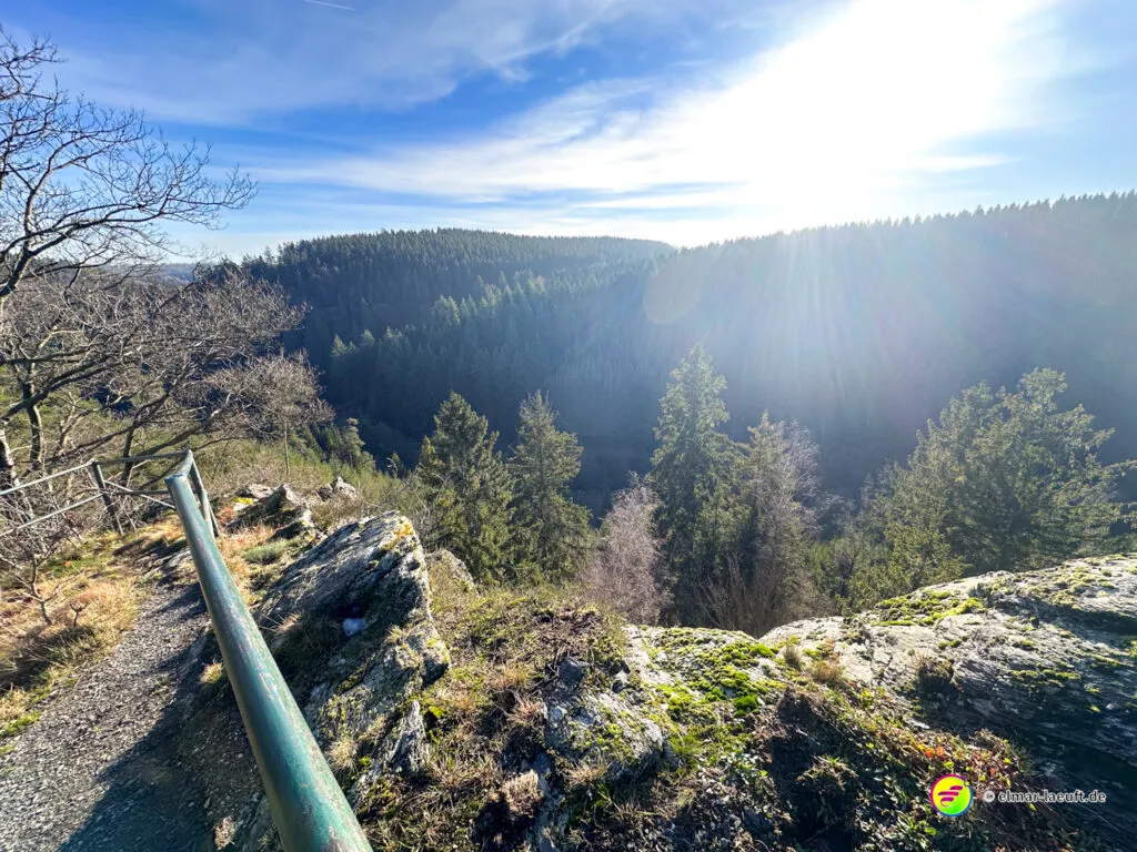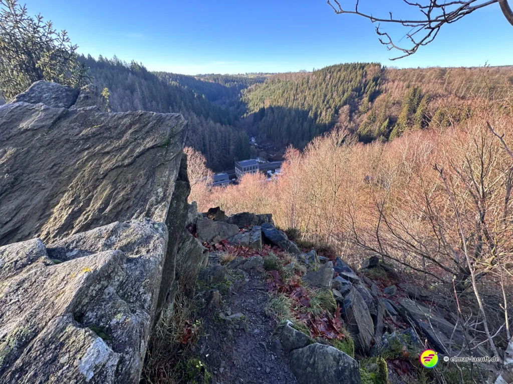 Schließlich lande ich auf 560 Höhenmetern bei der Felsformation namens Ehrensteinley. Von hier aus kann ich den spektakulären Ausblick über einen Teil des unteren Rurtals genießen. Nach dem Abstieg stehe ich vor der Landstraße um Monschau herum. Diese überquere ich und steige die Treppen hinab in den Ort. Ein kurzer Exkurs führt mich um die Glashütte herum und dann direkt wieder in das Gelände Richtung Teufelsley.