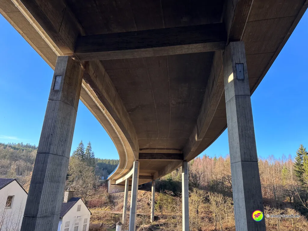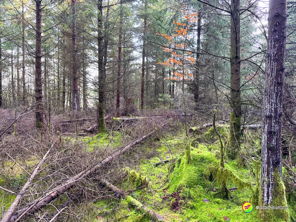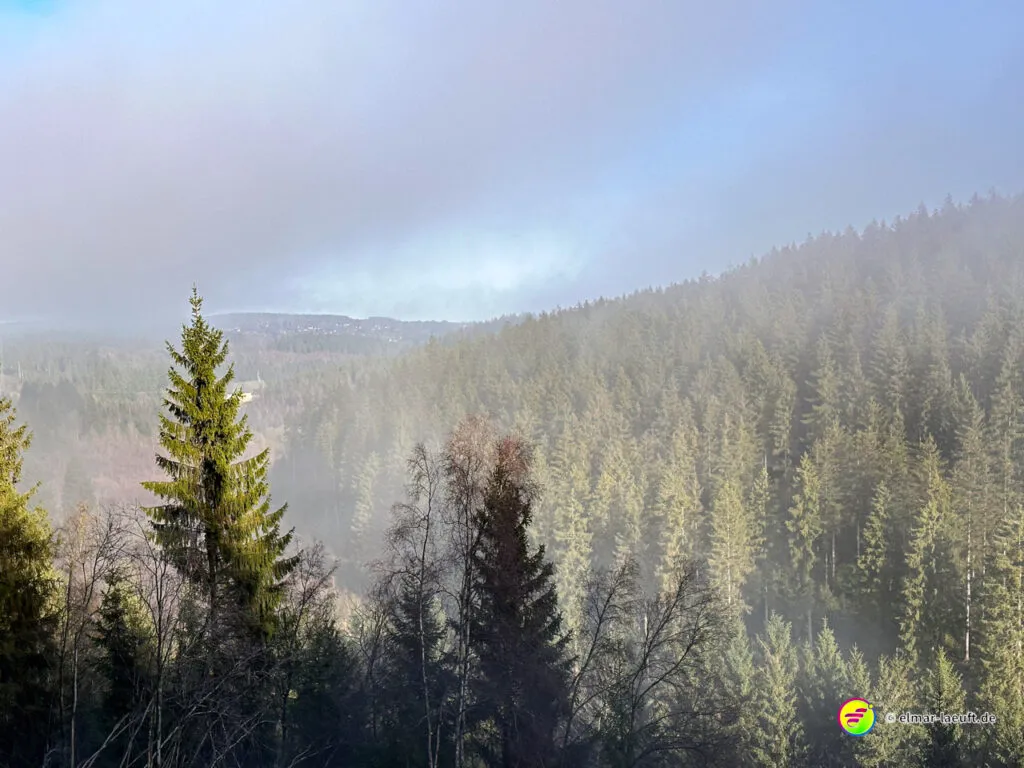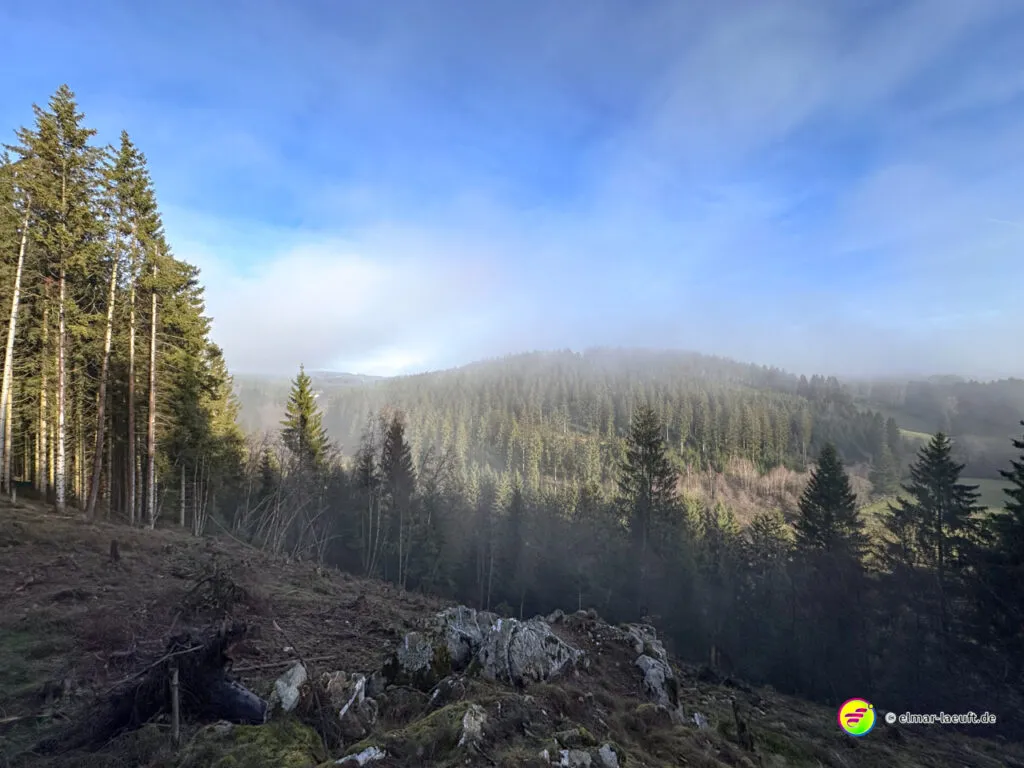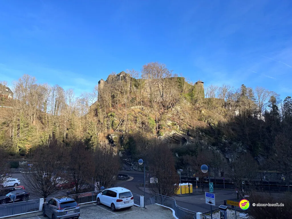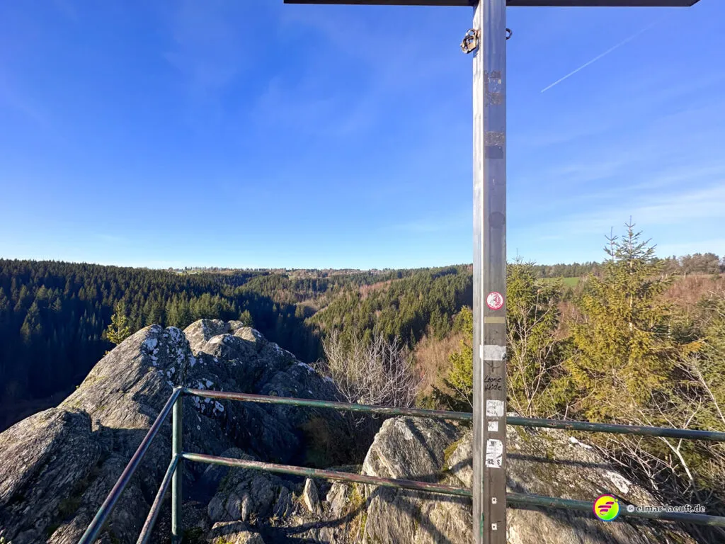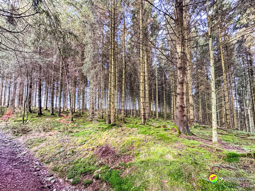 Schließlich lande ich auf 560 Höhenmetern bei der Felsformation namens Ehrensteinley. Von hier aus kann ich den spektakulären Ausblick über einen Teil des unteren Rurtals genießen. Nach dem Abstieg stehe ich vor der Landstraße um Monschau herum. Diese überquere ich und steige die Treppen hinab in den Ort. Ein kurzer Exkurs führt mich um die Glashütte herum und dann direkt wieder in das Gelände Richtung Teufelsley.