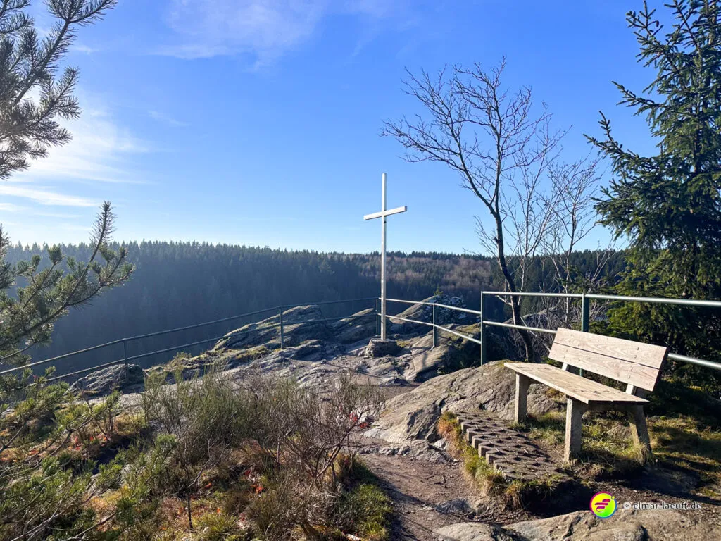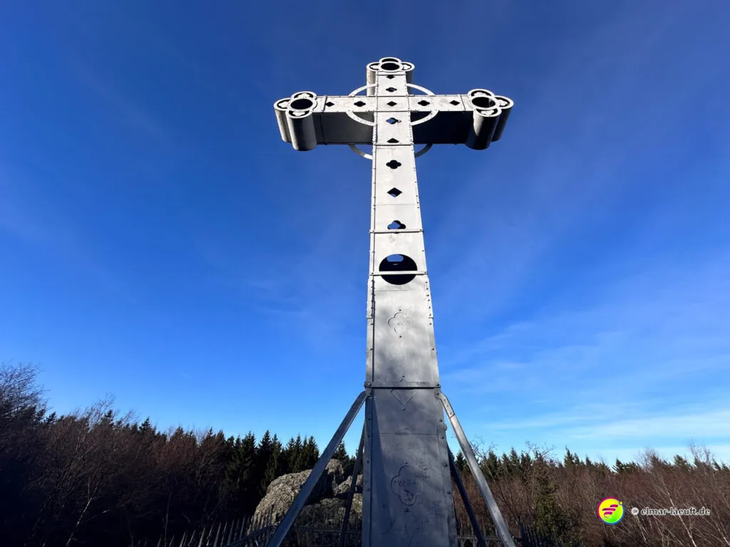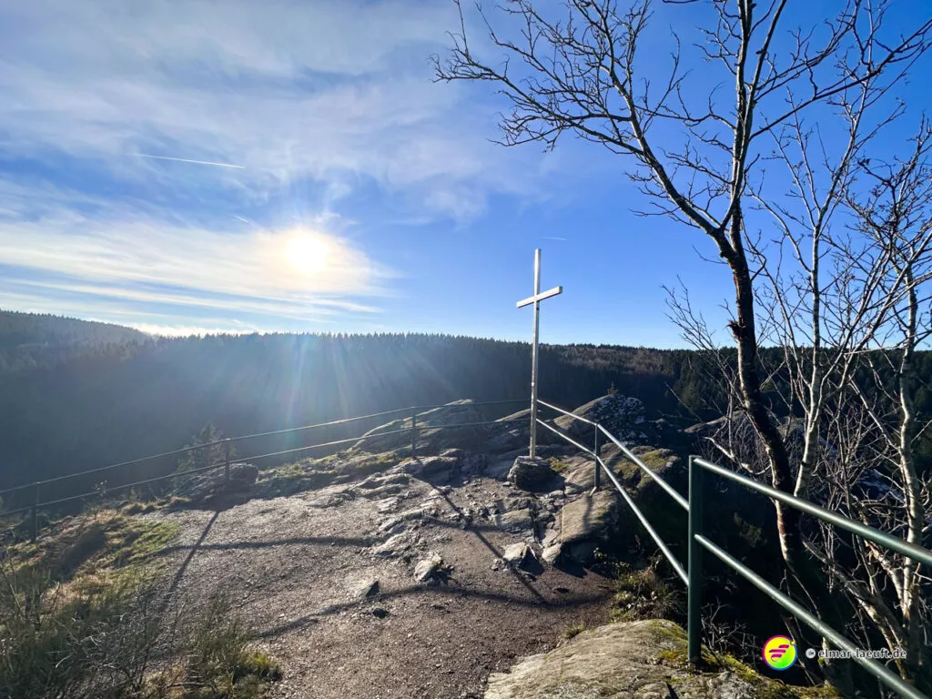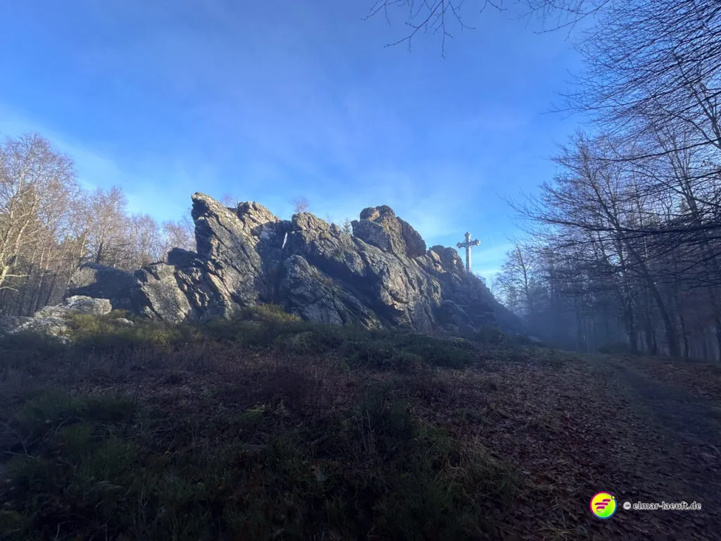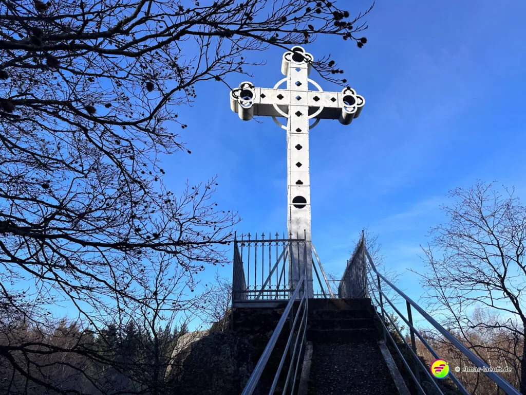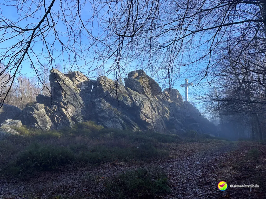 Ein Schild lässt mich wissen, dass ich mich nun auf dem “Weg des Gedenkens” befinde. Nach einigen Waldwegen erblicke ich eine interessante Felsformation mit einem riesigen Eisenkreuz auf dem Kamm: dem Richelsley.