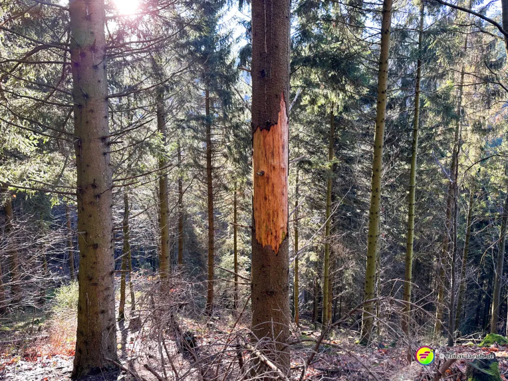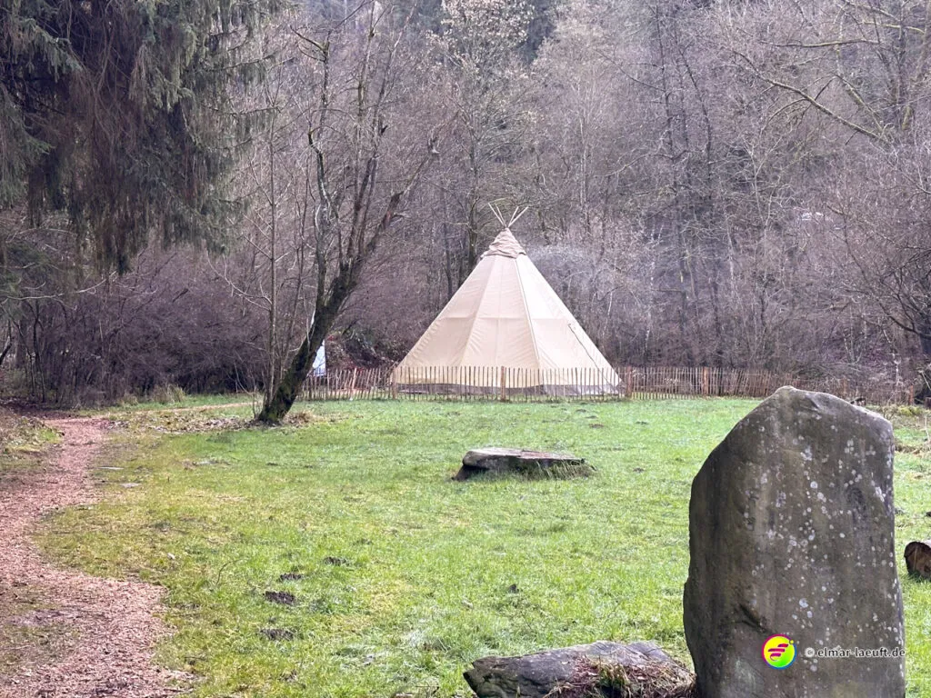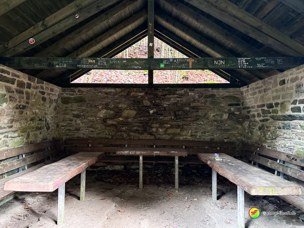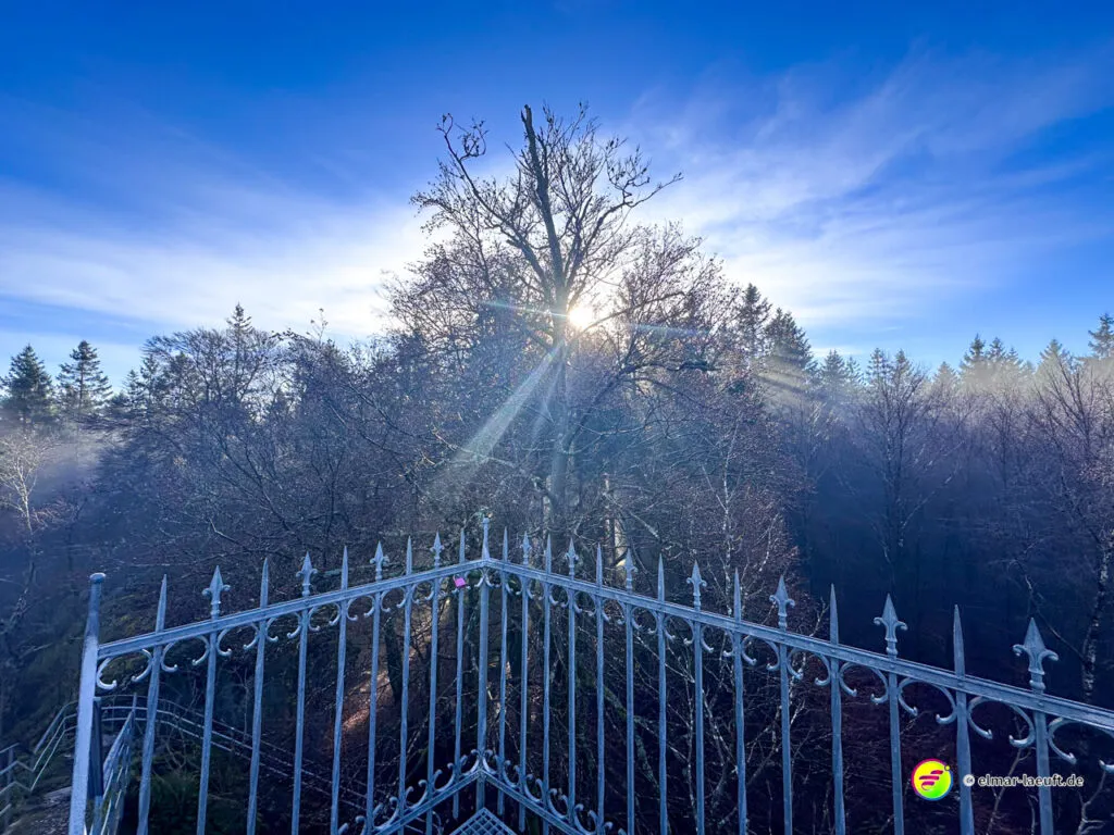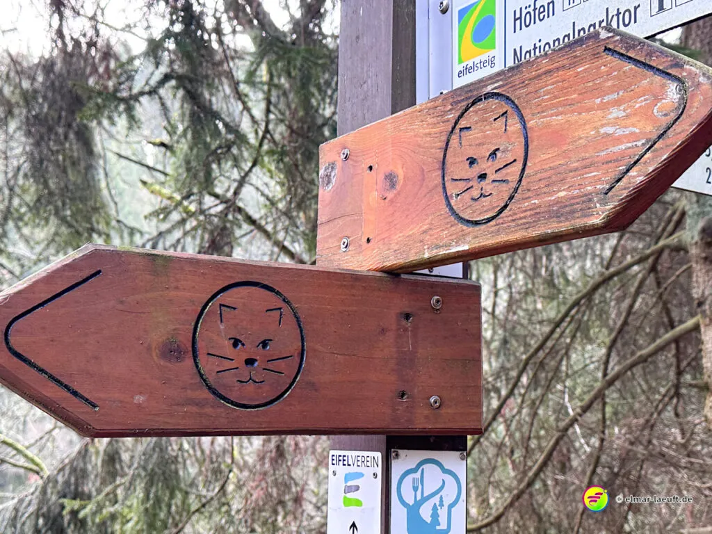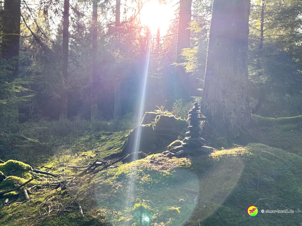 Ein Schild lässt mich wissen, dass ich mich nun auf dem “Weg des Gedenkens” befinde. Nach einigen Waldwegen erblicke ich eine interessante Felsformation mit einem riesigen Eisenkreuz auf dem Kamm: dem Richelsley.