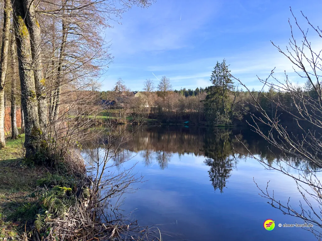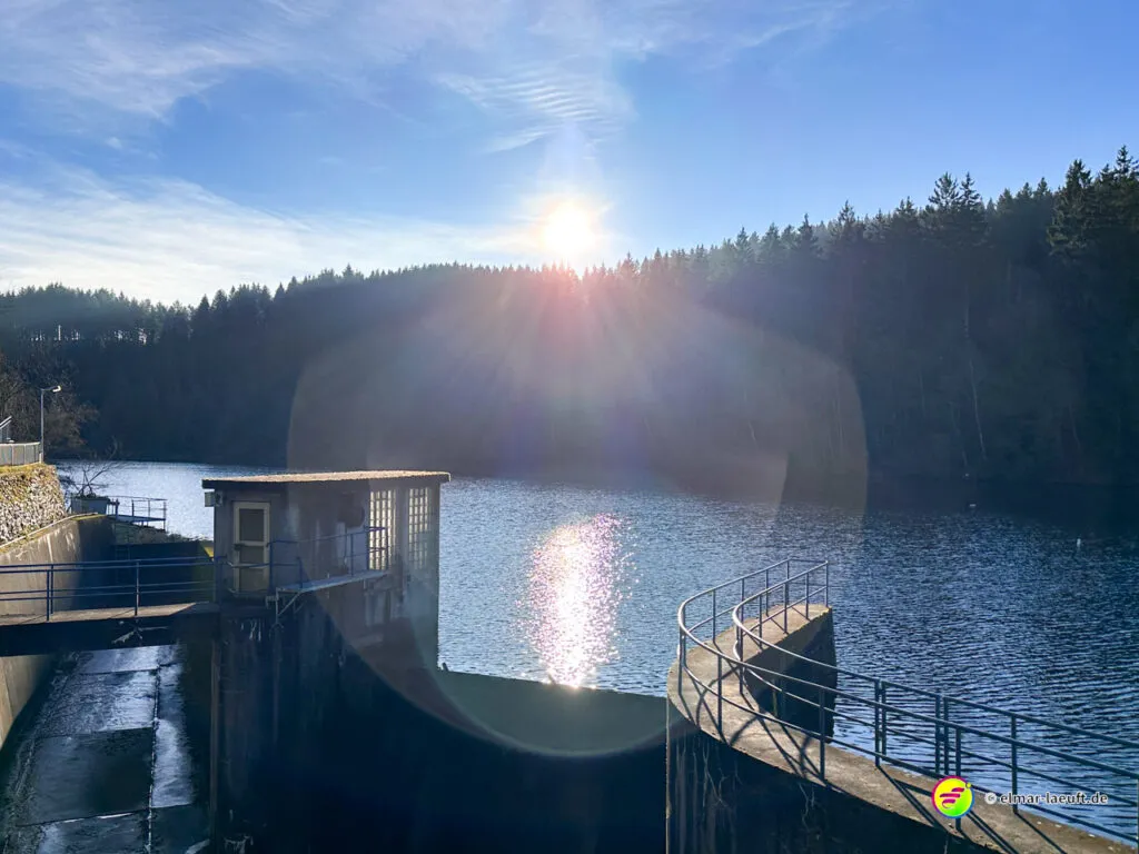 Ein ebenso schöner Trail führt mich durch das Perlenbachtal bis zur Perlenbachtalsperre. Mittlerweile ist der Himmel stahlblau und die meisten Wolken bilden nur noch eine nebeligen Rand am Boden.
