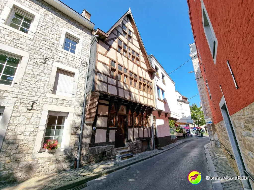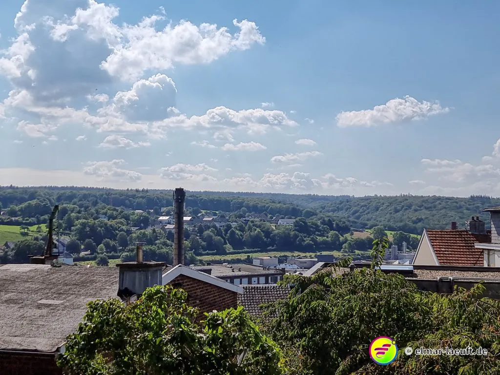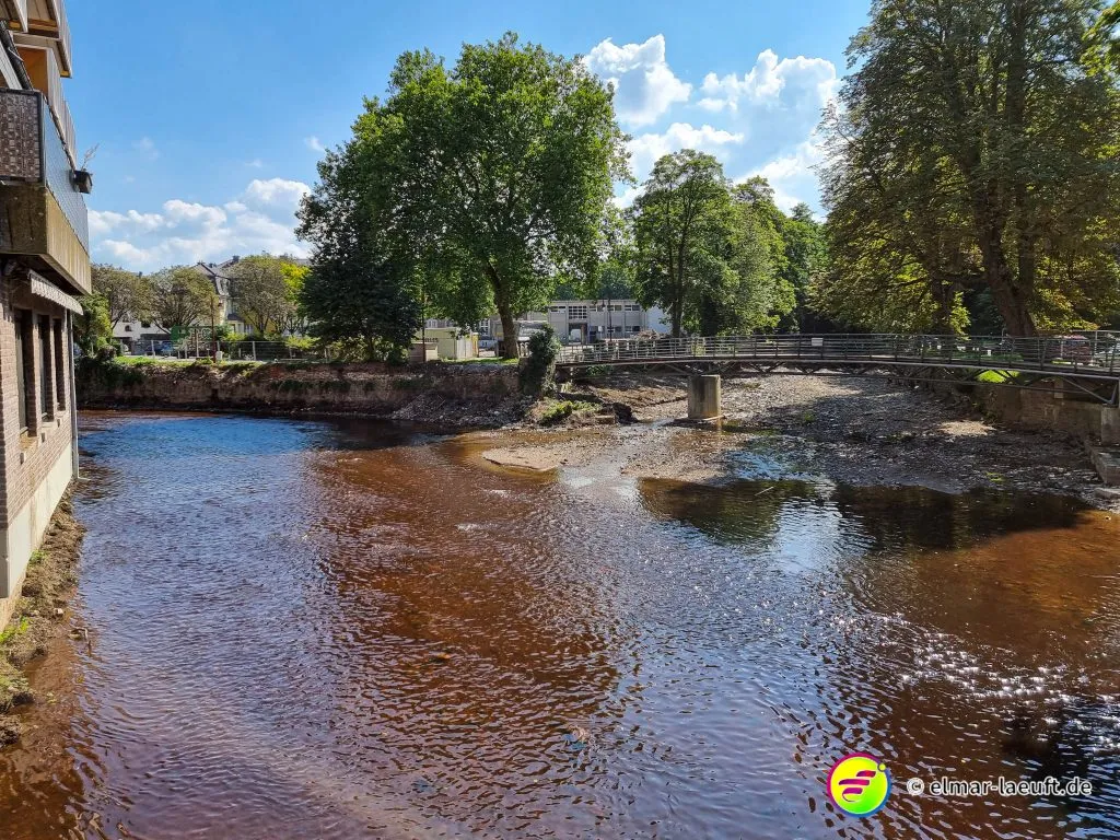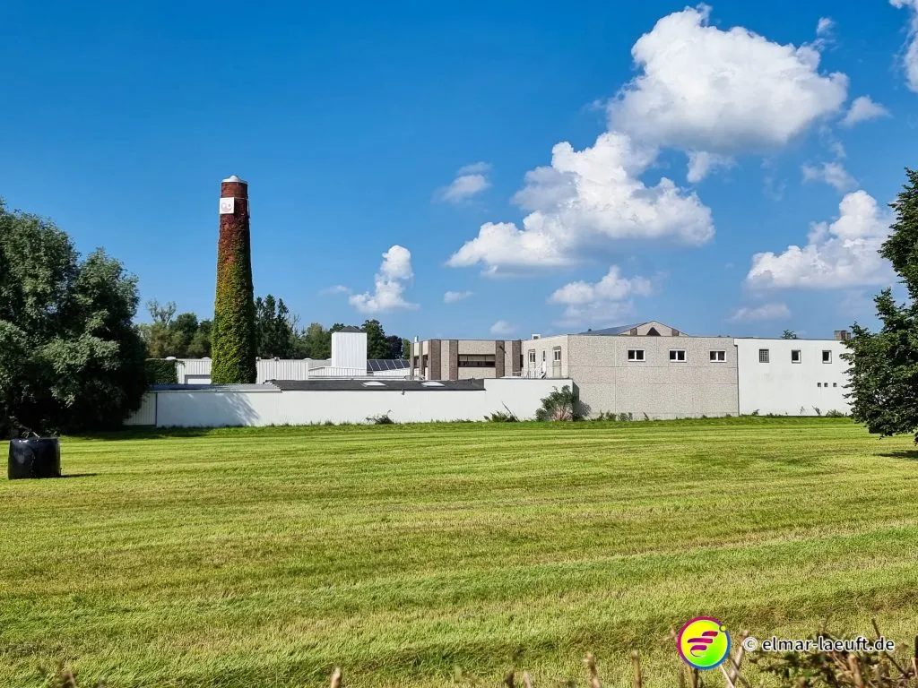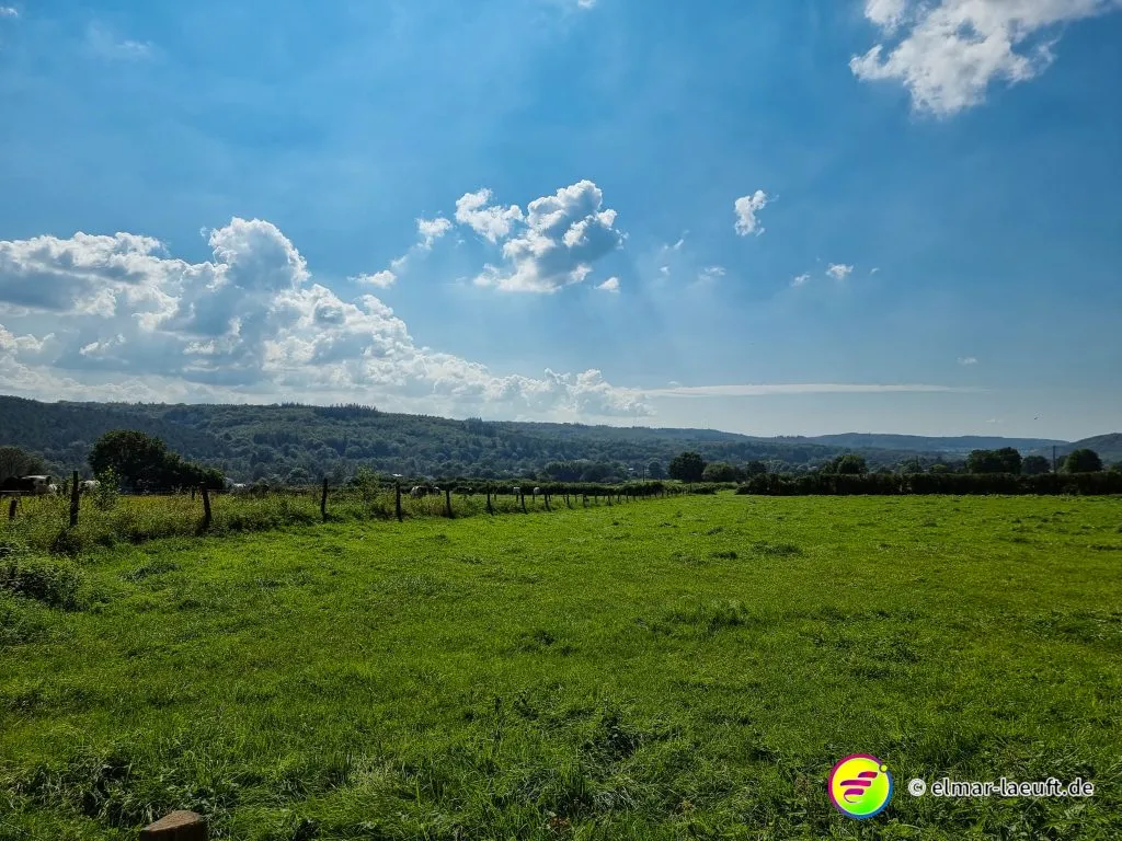 Ich starte auf dem kleinen Parkplatz direkt hinter dem Friedhof. Seltsam, wie die Belgier ihre Orte gestalten. 70 km/h darf man durch viele Ortschaften fahren. Die Straßen sind stellenweise aufgeplatzt wie rissige Haut, die Häuser liegen etwas zurück und die Seitenstreifen lassen Platz für Fahrzeuge. Ich laufe in den Ort ein, durch den die Weser fließt. Eine Brücke überspannt wasserlos einen Kanal, seitlich dazu läuft das Wasser mit einem goldig und rostbraunen Schimmer in die andere Richtung.
