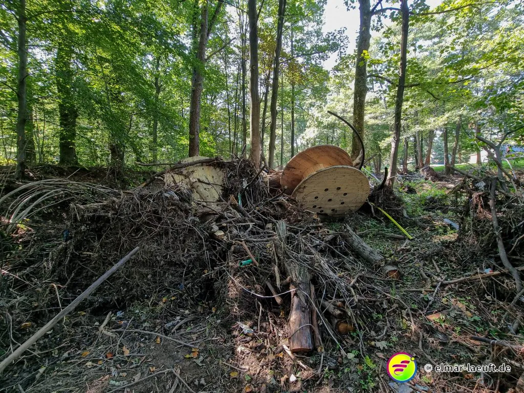 Ich finde aber nur einen Haufen Betonreste, ein Stahlgeländer liegt zerknüllt wie ein Spielzeug im Wasser. Auch hier ist das Wasser rostig braun. Überall liegen Kabel am Ufer und große Kabeltrommeln liegen längs der Weser wie Heuballen. Das Unkraut hat bereits Besitz von den ganzen angespülten Gegenständen ergriffen. Das Ufer ist stark ausgespült und hinterlässt eine scharfe Kante in der Landschaft.