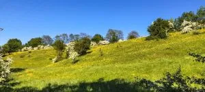 Hier laufe ich eine der wenigen Straßen entlang, die teilweise in Feldwege übergehen, um mich dort mit Unmengen von Bäumen, Blumenwiesen und Weißdornhecken zu umgeben. Die Orte sind immer interessant: einmal wurden Wohnungen in die Ruinen einer alten Kirche gebaut, andere haben eine Luxusvilla mit Blick auf die Landschaft erschaffen.