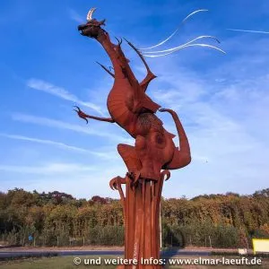 Dann eben nicht, es geht weiter zum Brachter Wald. Über eine Brücke muss ich hier die Autobahn queren und treffen auf den großen Drachen aus Metall. Ein großes Denkmal oder Skulptur für das Drachendorf Beesel. Der Sage nach wurde dem Drachen – nachdem ihm die anderen Tiermahlzeiten ausgingen – immer ein Menschenopfer gebracht. Die Entscheidung wurde mit dem Los gefällt und irgendwann traf es die Tochter des Königs. Dann erschien aber ein heldenhafter Ritter. Als Kulturevent, genannt das Drachenstechen, findet offenbar dazu alle Jahre ein großes Fest im Dorf statt.