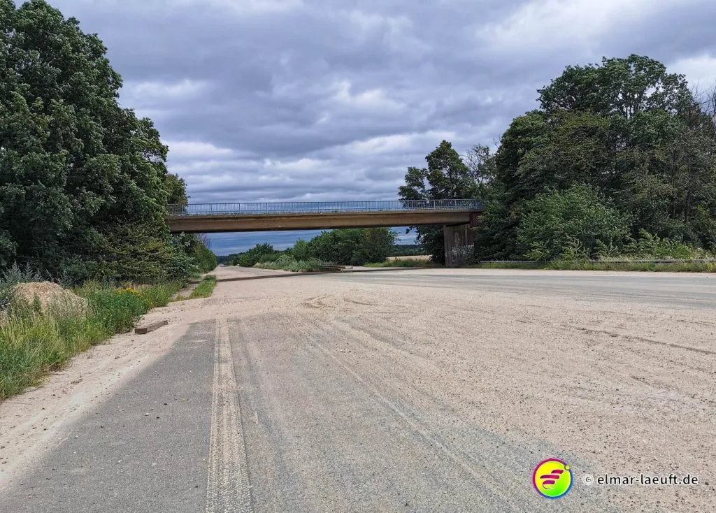 Nachdem ich den Ort auf der anderen Seite verlasse, gelange ich über ein Feld auf die Autobahn. Jedenfalls das, was von ihr übrig ist. Eine staubige, zweigeteilte Straße, die eher den Charme eines breiten Feldweges hat. Keine Besetzer, keine Polizei. Nicht dass ich es darauf angelegt hätte sie zu treffen. Dann laufe ich doch heute über die Autobahn. Das ist ohne Zweifel die kürzeste Strecke nach Bergheim.