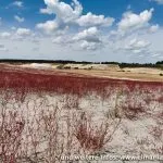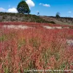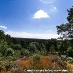 Oben angekommen bin ich auf einer Hochebene mit einem imposanten Ausblick auf einen großen Teil der Landschaft Richtung Maas. Verstehe, der See ist natürlich gar nicht oben. Er liegt auf der anderen Seite dieser Anhöhe. Es handelt sich um eine Kiesgrube, an deren Ufer in feinem Sand seltsame, rote Sträucher sich ein schönes Farbspiel zwischen grün, rot und hellbraun liefern. Auf der anderen Seite des Sees tauche ich in ein riesiges Heidegebiet ein. Ein verwachsener Pfad, der vielleicht einmal von einem Traktor befahren wurde ist mein Wegweiser. Mitten hier in der Heide treffe ich auf einige sonderbare Messstationen. Das hat etwas von “Alien Technology”.