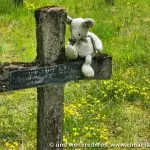 Nein. Es gehört sich nicht, Sport auf einem Friedhof zu machen. Dieser Friedhof ist aber: verlassen, verfallen, verrottet. Es fühlt sich nicht so an, als würde man hier die Ruhe der Toten stören. Vielmehr ist es so, als hätte man diesen Ort einfach vergessen. Dabei liegt er direkt an einer normalen Straße. Er ist auch nicht abgesperrt. Ich bin auch nicht alleine dort. Ein Radfahrer tritt mir mir gemeinsam durch die Pforte, etwas später folgt ein junges Pärchen. Ich schreite die Reihen ab, lese die Namen auf den teilweise nicht mehr lesbaren Metallschildern. Ich studiere die Datumsangaben. Seltsam, kaum jemand ist hier offenbar älter als 18 geworden. Nur ganz wenige. Das hinterlässt ein ungutes Gefühl. Auf einigen Gräbern ist ein Plüschtier. Das ist in jedem Fall neueren Datums. Wer macht denn so was? Angeblich sollen die Tiere immer wieder mal die Position wechseln (so die Legende). Es ist aber Mitten am Tag, die Sonne scheint. Das nimmt dem Platz etwas die düstere Atmosphäre.