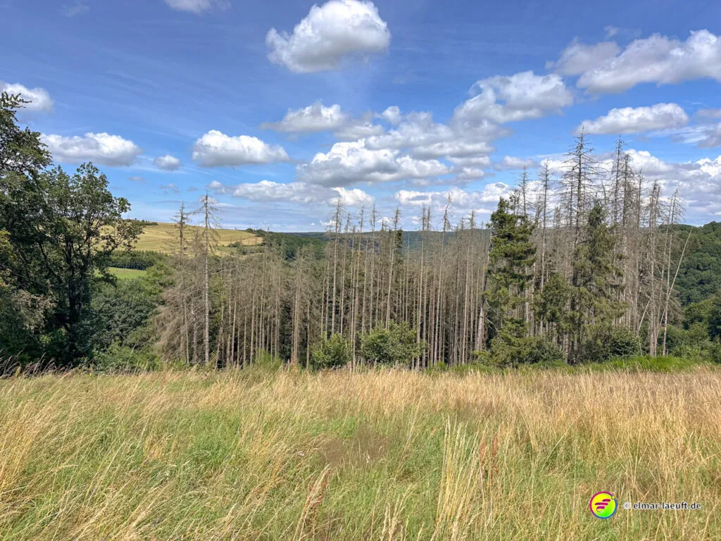Neben immer wieder tollen Panoramablicken sind auf den gegenüberliegenden Hängen und auch in den kleinen Wäldern am Weg immer wieder große Tannenschonungen zu sehen, die Hitze und Käferbefall nicht überleben konnten. Ein Anblick, den ich leider schon sehr oft sehen musste und dem der Mensch oft mit großflächigen Rodungen begegnet.