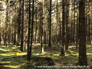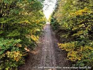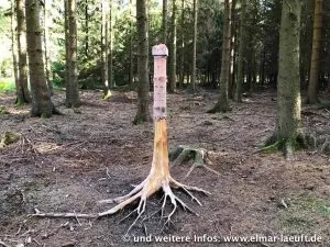 Die Intuition führt mich an der Kirche vorbei auf ein offenes Feld. Kein Zaun, die Richtung stimmt, also weiter über die Wiese in Richtung Wald. Ich passiere ein Schild “Hohes Venn“, also bin ich nah an oder sogar schon in der Eifel. Auf der Karte macht der Weg einen unschönen, ausladenden Bogen, der einen Umweg von mehreren Kilometern verspricht. Andererseits hat jemand offenbar mit einer Planierraupe eine Schneise in den Wald neben mehr gefräst. Probieren wir doch einfach diesen Weg.