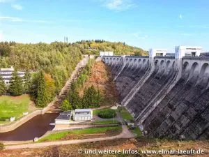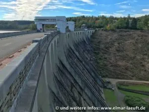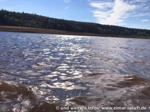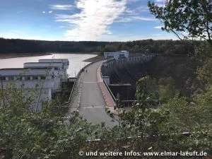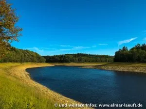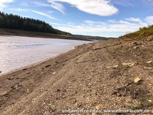 Ähnlich wie schon an der Wehebachtalsperre vor drei Monaten führt auch dieser Stausee immer noch sehr wenig Wasser (finde ich). Ein Stück vom Ufer liegt frei und man kann neben Wasser und Wald entlang laufen.