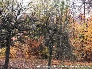 Es fängt an zu Regnen, im Wald bekomme ich glücklicherweise wenig davon mit. Dann erreiche ich schließlich einen Parkplatz, auf dem einige wenige Menschen ihren Spaziergang mit dem Hundi zu starten scheinen. Der Parkplatz liegt am Fuß der großen Anhöhe und da ich mir einen tollen Ausblick von dort oben erwarte, beschließe ich dort hinauf zu klettern. Ein Weg führt offenbar mit moderatem Anstieg den kleinen Berg entlang. Davon halte ich aber nichts – weder dem Weg, noch dem vermutlich damit eher langsamen Aufstieg auf die gewünschte Höhe. Also los, schnurstracks den Berg hinauf.