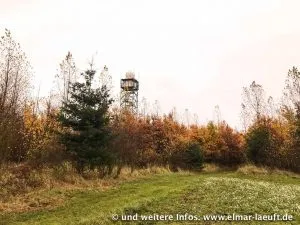An der Sophienhöhe angekommen werfe ich einen Blick in die Ferne. Hinter dem dichten Waldbewuchs ist die Braunkohlegrube nur zu erahnen. Von hier aus fällt mein Blick auf einen Stahlturm: der Wetterstation. Die Richtung passt mir gut. Auch wenn in diese Richtung mal wieder gar kein Weg verläuft, hindert mich das nicht daran, der Richtung in Luftlinie zu folgen. Der Abstieg vom Berg verläuft durch dichtes Geäst und Dornenbüsche, gemischt mit matschig bis sumpfigen Passagen. Ich erreiche schließlich den Turm und damit auch den Rand des Tagebaus.