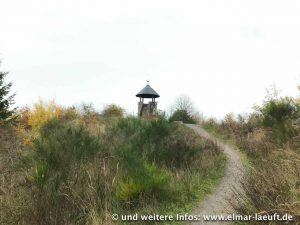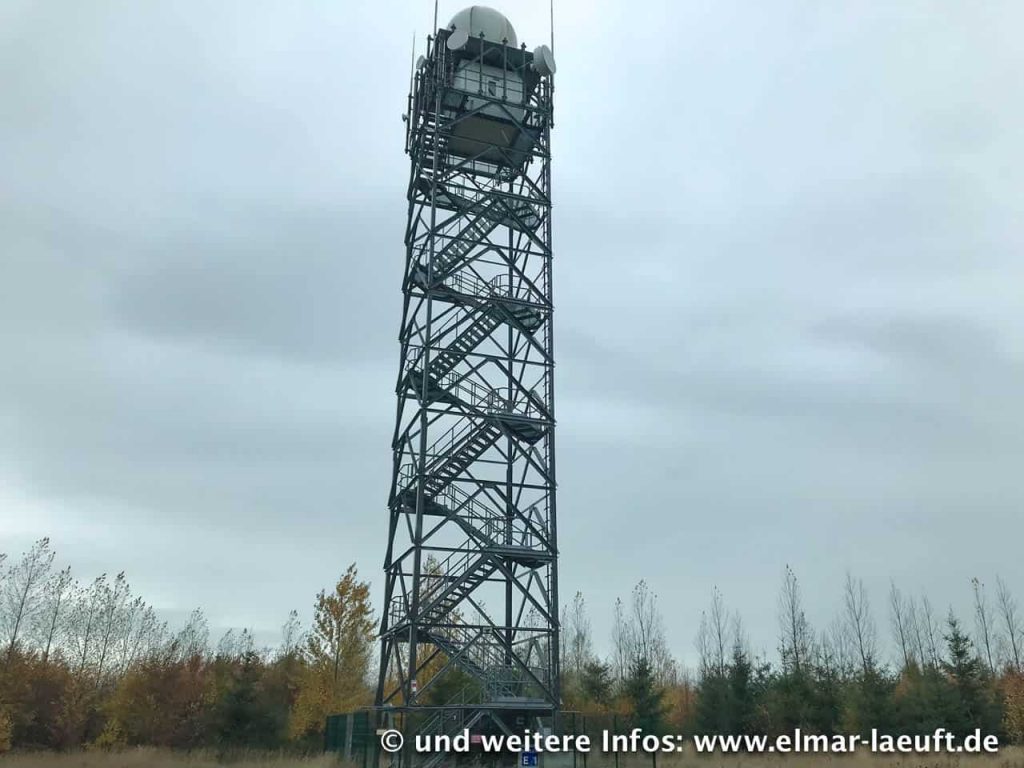 An der Sophienhöhe angekommen werfe ich einen Blick in die Ferne. Hinter dem dichten Waldbewuchs ist die Braunkohlegrube nur zu erahnen. Von hier aus fällt mein Blick auf einen Stahlturm: der Wetterstation. Die Richtung passt mir gut. Auch wenn in diese Richtung mal wieder gar kein Weg verläuft, hindert mich das nicht daran, der Richtung in Luftlinie zu folgen. Der Abstieg vom Berg verläuft durch dichtes Geäst und Dornenbüsche, gemischt mit matschig bis sumpfigen Passagen. Ich erreiche schließlich den Turm und damit auch den Rand des Tagebaus.